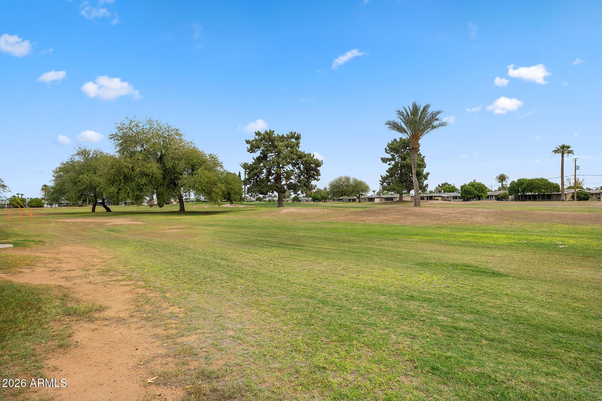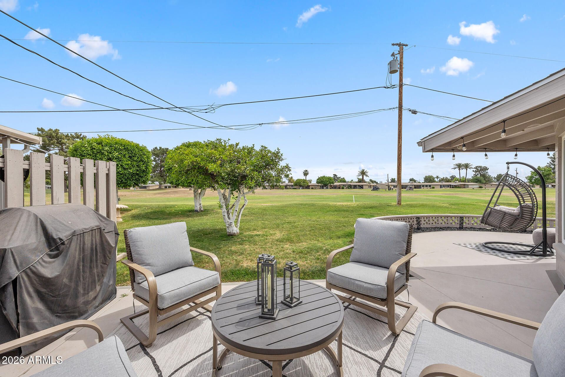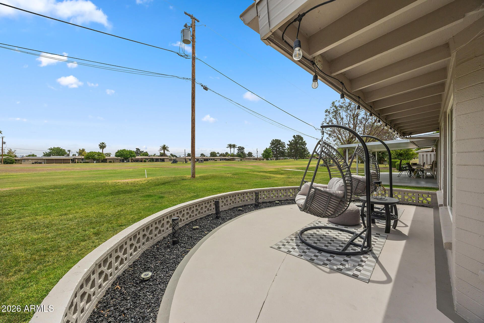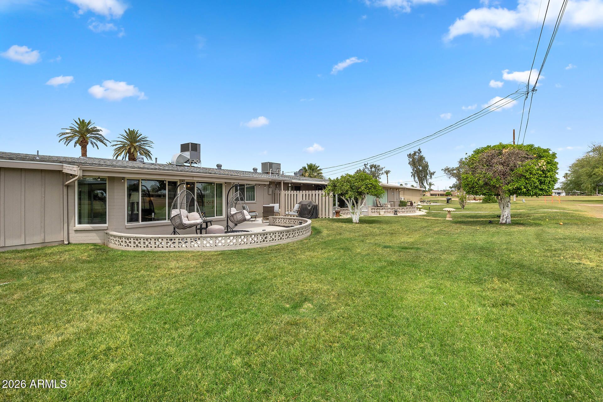Backyard East-facing sitting directly on the golf course - the kind of lot position that's hard to find in this neighborhood and impossible to manufacture. Morning light floods the main living areas, and the view from the patio is open fairway. The home has been comprehensively updated. Kitchen is all-new - cabinets, countertops, and appliances. New carpet and pad throughout the living areas, double-pane vinyl windows, new slider, new front door with security door, fresh interior paint and outside, and an epoxy garage floor. This isn't a cosmetic refresh; it was done right. Mechanicals are current: HVAC replaced in 2020, and the HOA just completed a full roof replacement in April 2026 - so the buyer walks in with zero deferred maintenance on the two items that matter most. HOA also covers exterior paint and ongoing maintenance, keeping long-term ownership costs predictable. Sun City amenities include 8 recreation centers, multiple pools, pickleball, tennis, bowling, and 8 public golf courses. Convenient to Banner Boswell Medical, shopping, and the 101. 55+ community. One designated parking space. Pets per HOA rules.