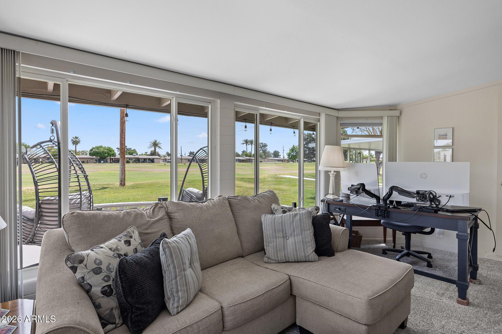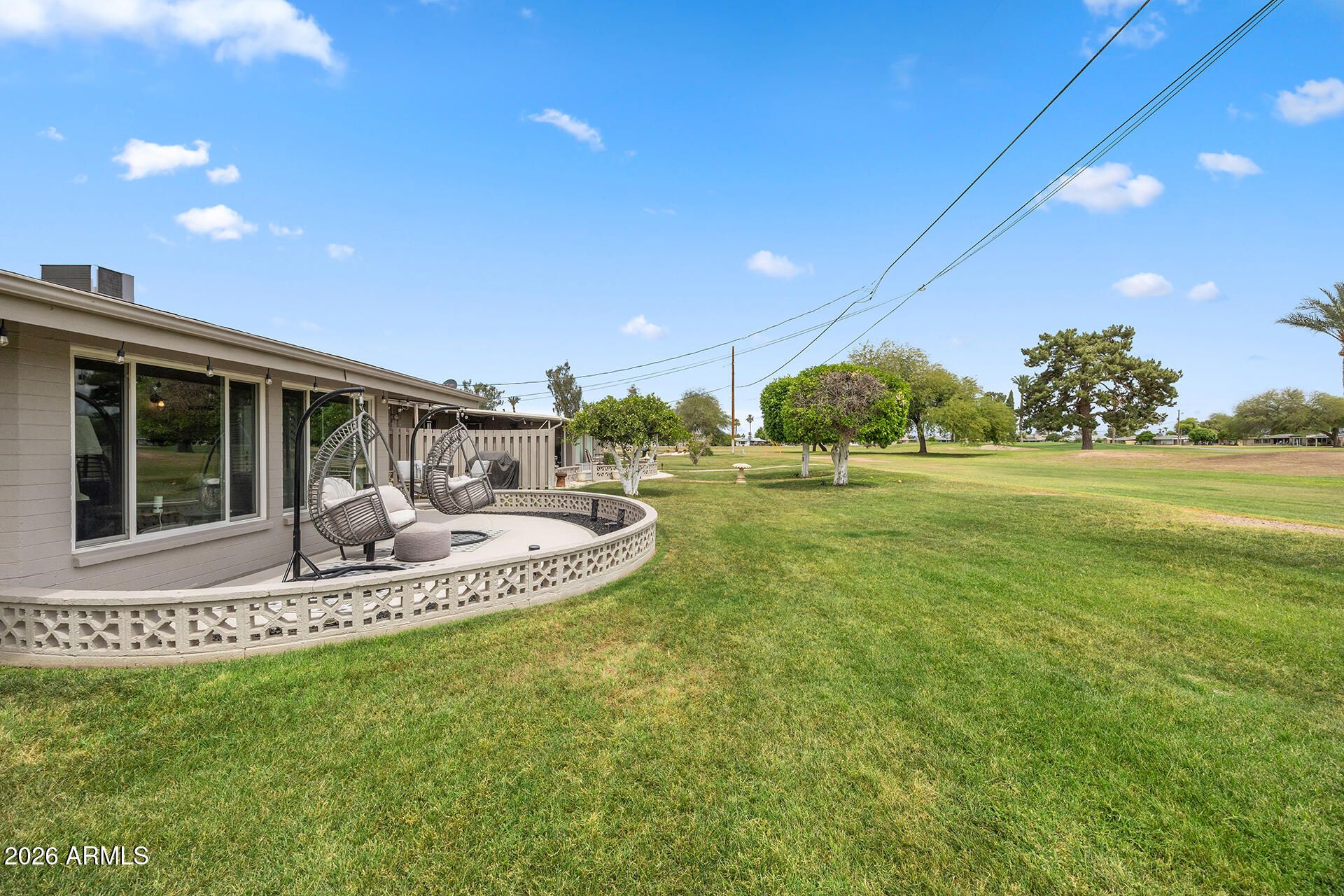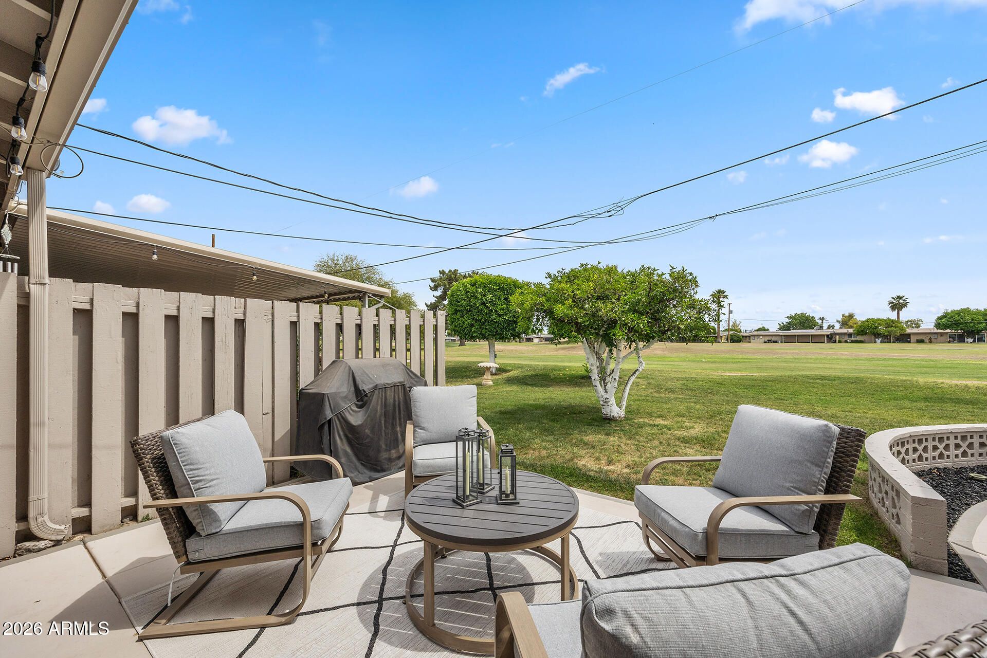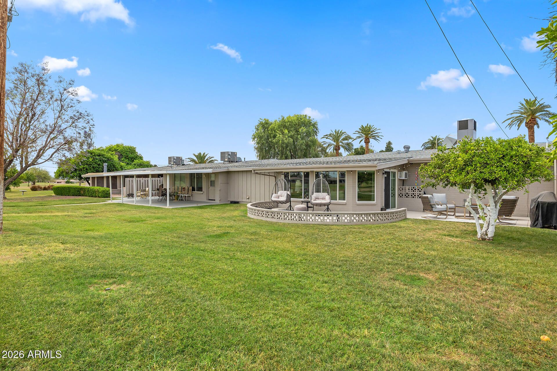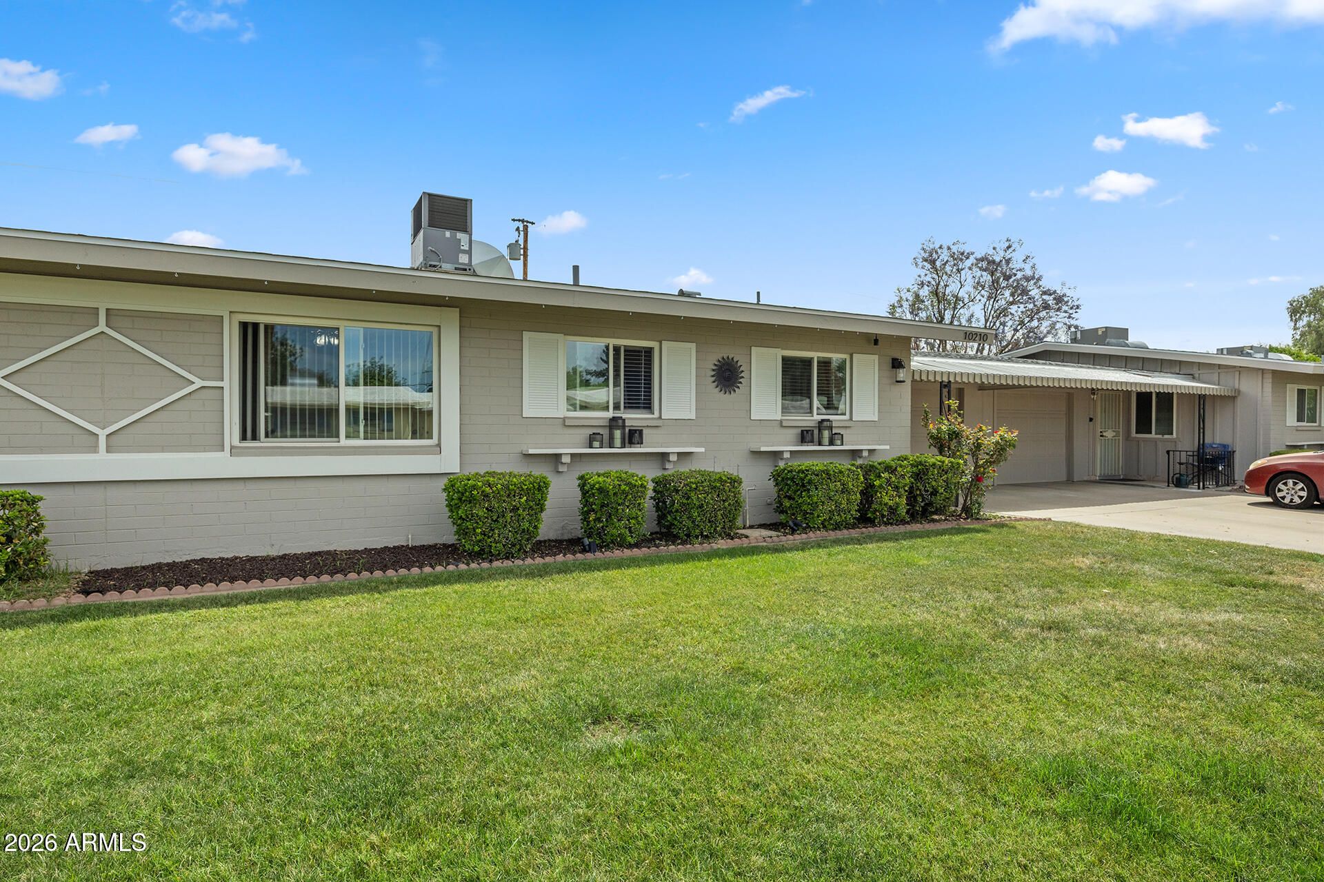 Backyard East-facing sitting directly on the golf course - the kind of lot position that's hard to find in this neighborhood and impossible to manufacture. Morning light floods the main living areas, and the view from the patio is open fairway. The home has been comprehensively updated. Kitchen is all-new - cabinets, countertops, and appliances. New carpet and pad throughout the living areas, double-pane vinyl windows, new slider, new front door with security door, fresh interior paint and outside, and an epoxy garage floor. This isn't a cosmetic refresh; it was done right. Mechanicals are current: HVAC replaced in 2020, and the HOA just completed a full roof replacement in April 2026 - so the buyer walks in with zero deferred maintenance on the two items that matter most. HOA also covers exterior paint and ongoing maintenance, keeping long-term ownership costs predictable. Sun City amenities include 8 recreation centers, multiple pools, pickleball, tennis, bowling, and 8 public golf courses. Convenient to Banner Boswell Medical, shopping, and the 101. 55+ community. One designated parking space. Pets per HOA rules.