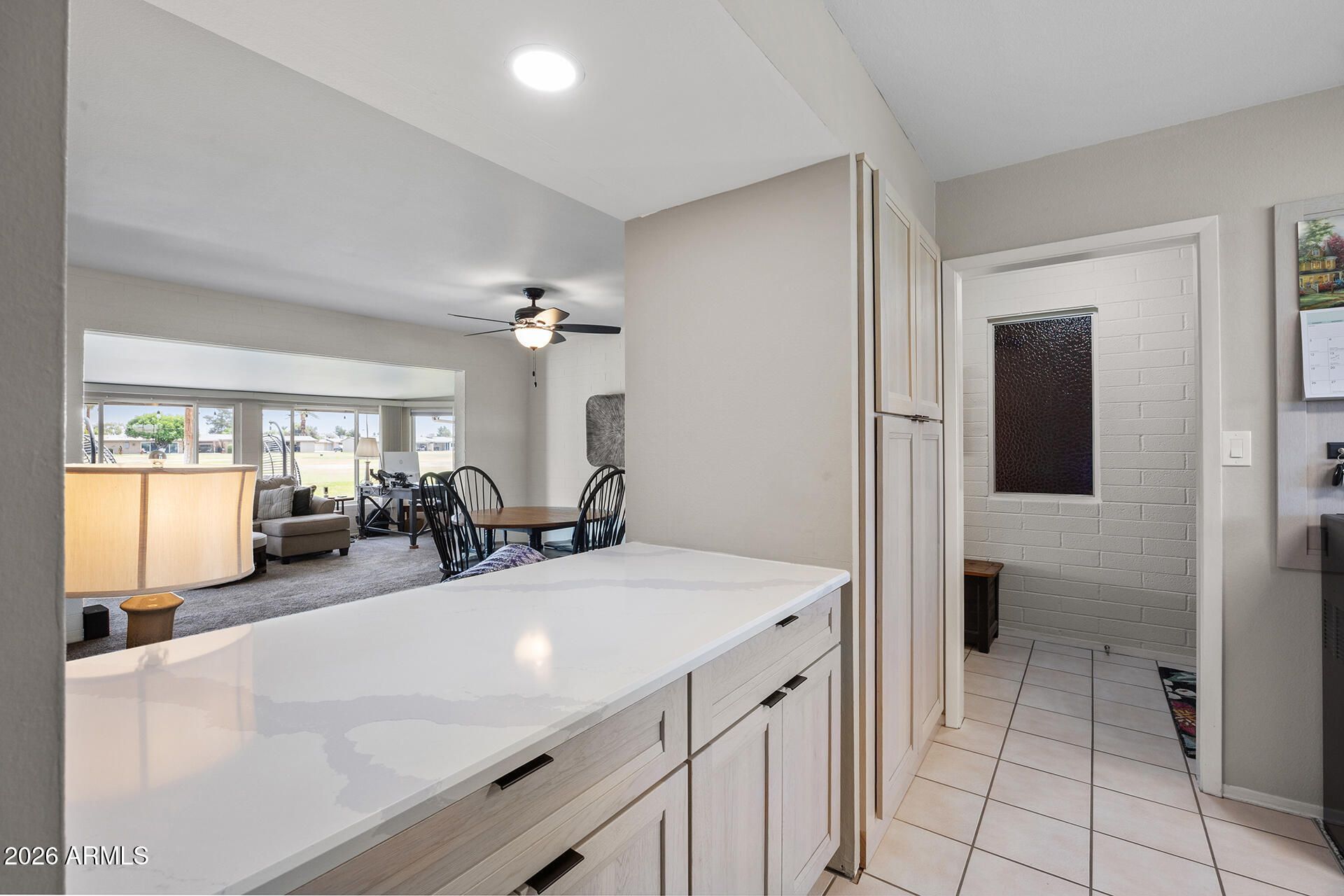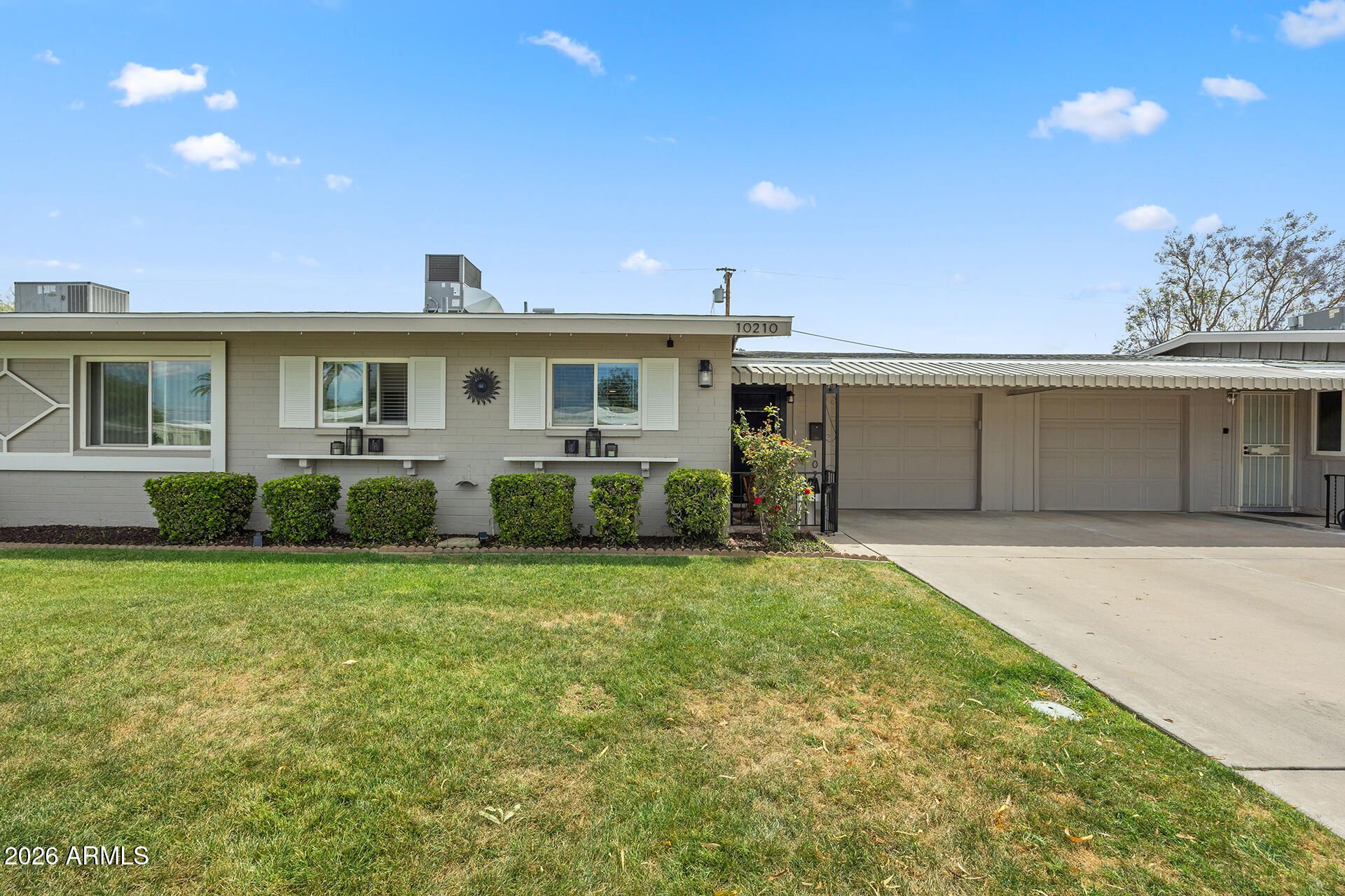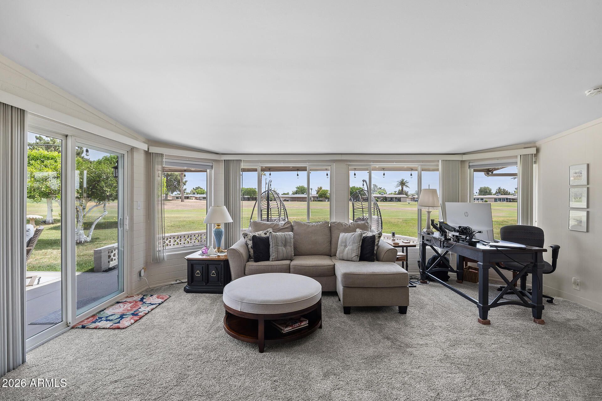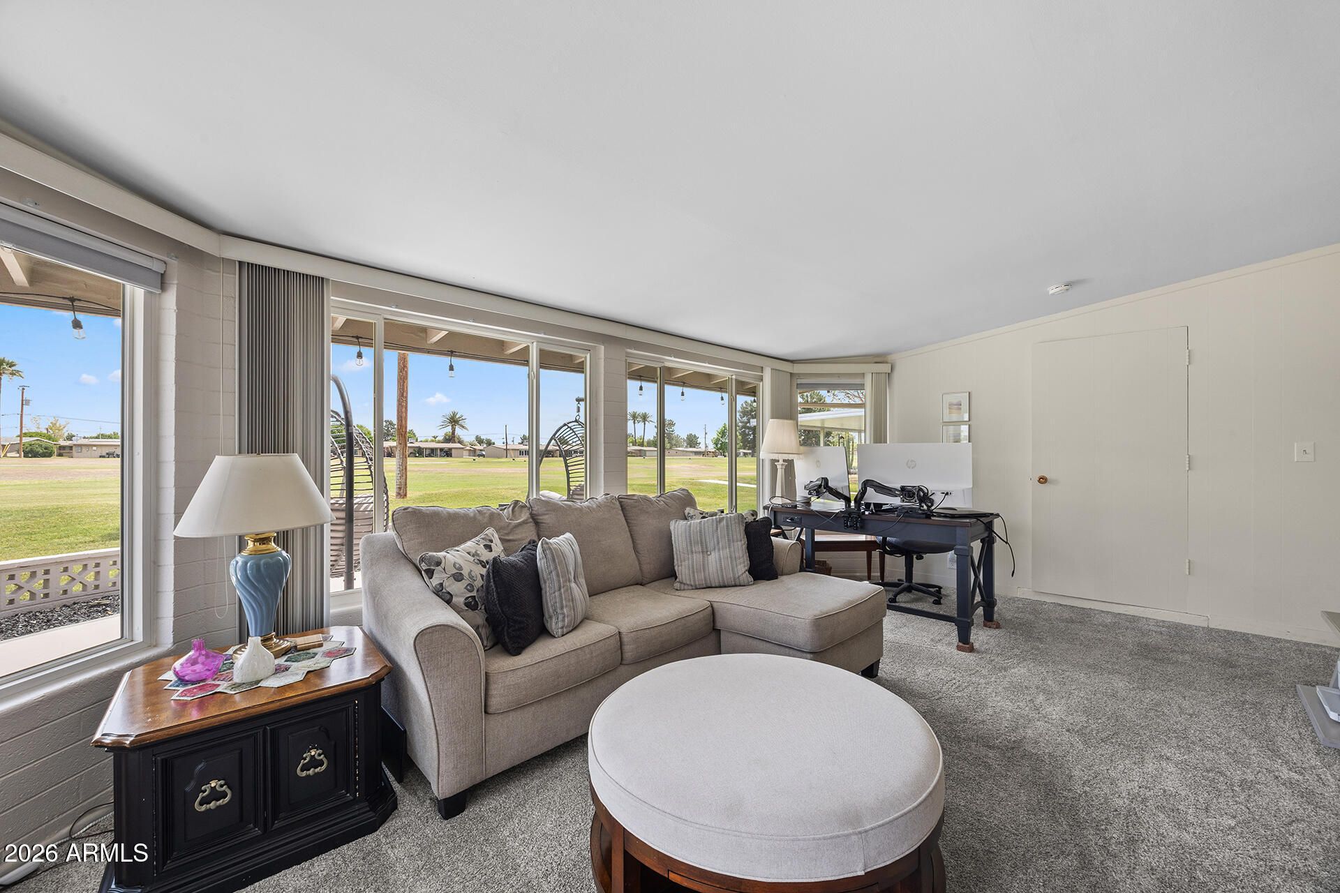 Backyard East-facing sitting directly on the golf course - the kind of lot position that's hard to find in this neighborhood and impossible to manufacture. Morning light floods the main living areas, and the view from the patio is open fairway. The home has been comprehensively updated. Kitchen is all-new - cabinets, countertops, and appliances. New carpet and pad throughout the living areas, double-pane vinyl windows, new slider, new front door with security door, fresh interior paint and outside, and an epoxy garage floor. This isn't a cosmetic refresh; it was done right. Mechanicals are current: HVAC replaced in 2020, and the HOA just completed a full roof replacement in April 2026 - so the buyer walks in with zero deferred maintenance on the two items that matter most. HOA also covers exterior paint and ongoing maintenance, keeping long-term ownership costs predictable. Sun City amenities include 8 recreation centers, multiple pools, pickleball, tennis, bowling, and 8 public golf courses. Convenient to Banner Boswell Medical, shopping, and the 101. 55+ community. One designated parking space. Pets per HOA rules.