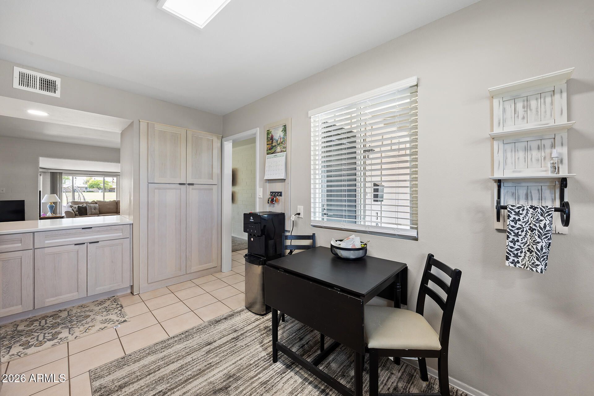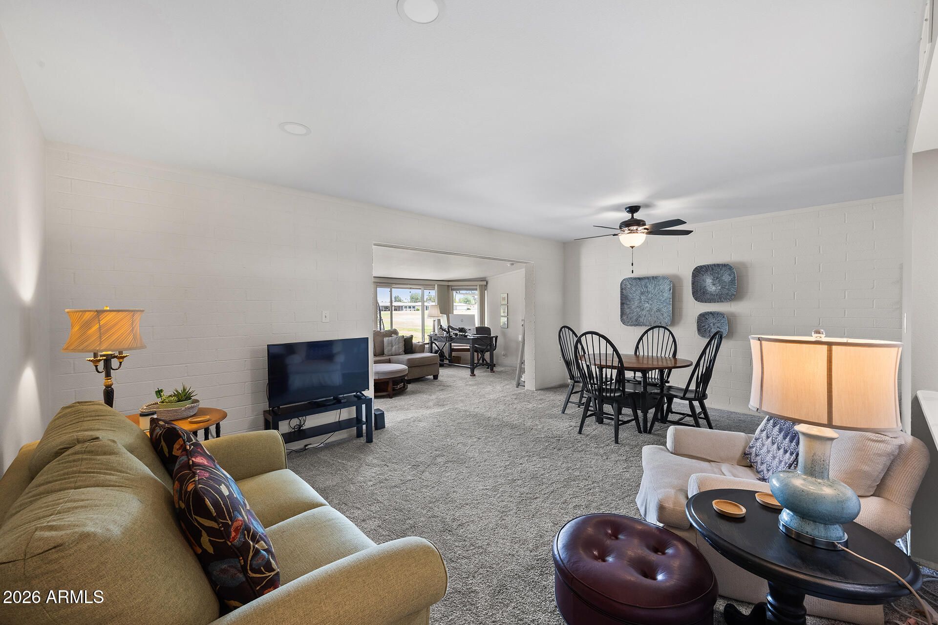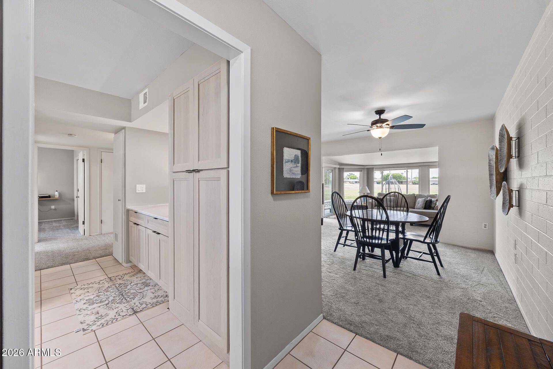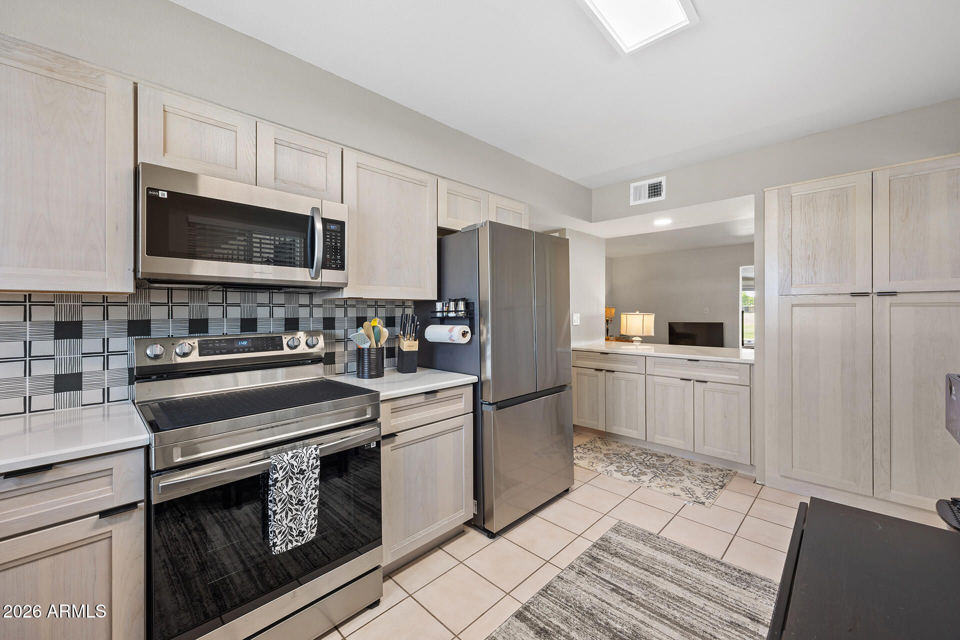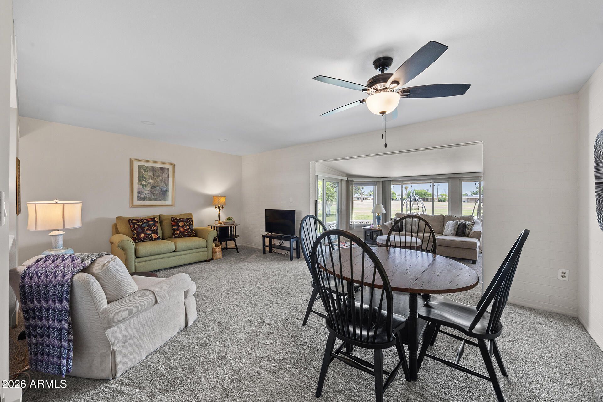 Backyard East-facing sitting directly on the golf course - the kind of lot position that's hard to find in this neighborhood and impossible to manufacture. Morning light floods the main living areas, and the view from the patio is open fairway. The home has been comprehensively updated. Kitchen is all-new - cabinets, countertops, and appliances. New carpet and pad throughout the living areas, double-pane vinyl windows, new slider, new front door with security door, fresh interior paint and outside, and an epoxy garage floor. This isn't a cosmetic refresh; it was done right. Mechanicals are current: HVAC replaced in 2020, and the HOA just completed a full roof replacement in April 2026 - so the buyer walks in with zero deferred maintenance on the two items that matter most. HOA also covers exterior paint and ongoing maintenance, keeping long-term ownership costs predictable. Sun City amenities include 8 recreation centers, multiple pools, pickleball, tennis, bowling, and 8 public golf courses. Convenient to Banner Boswell Medical, shopping, and the 101. 55+ community. One designated parking space. Pets per HOA rules.
