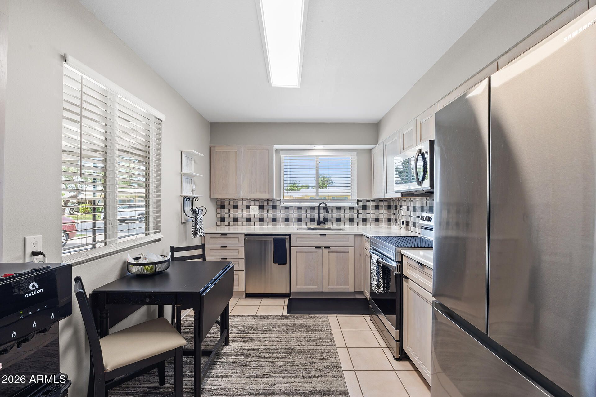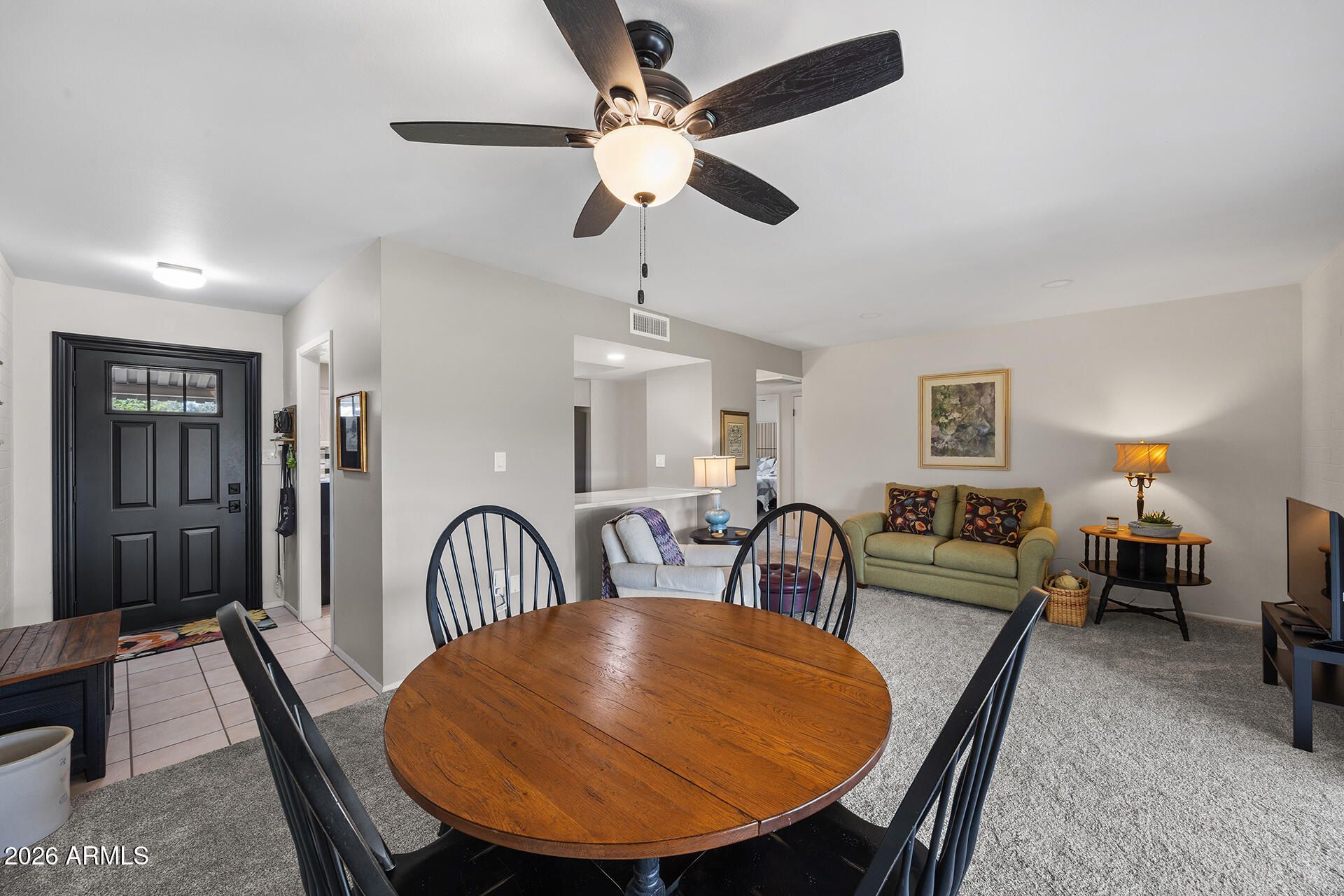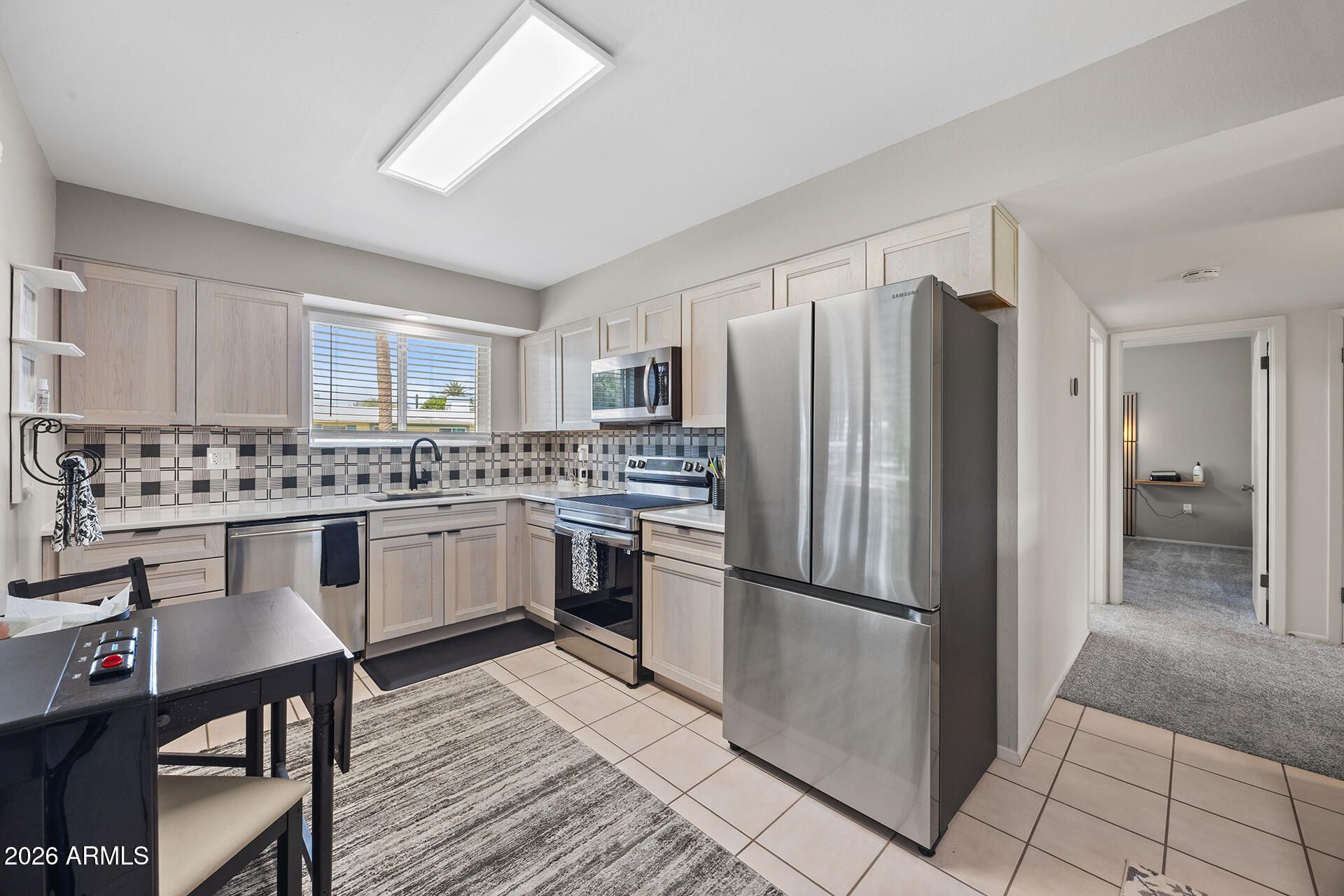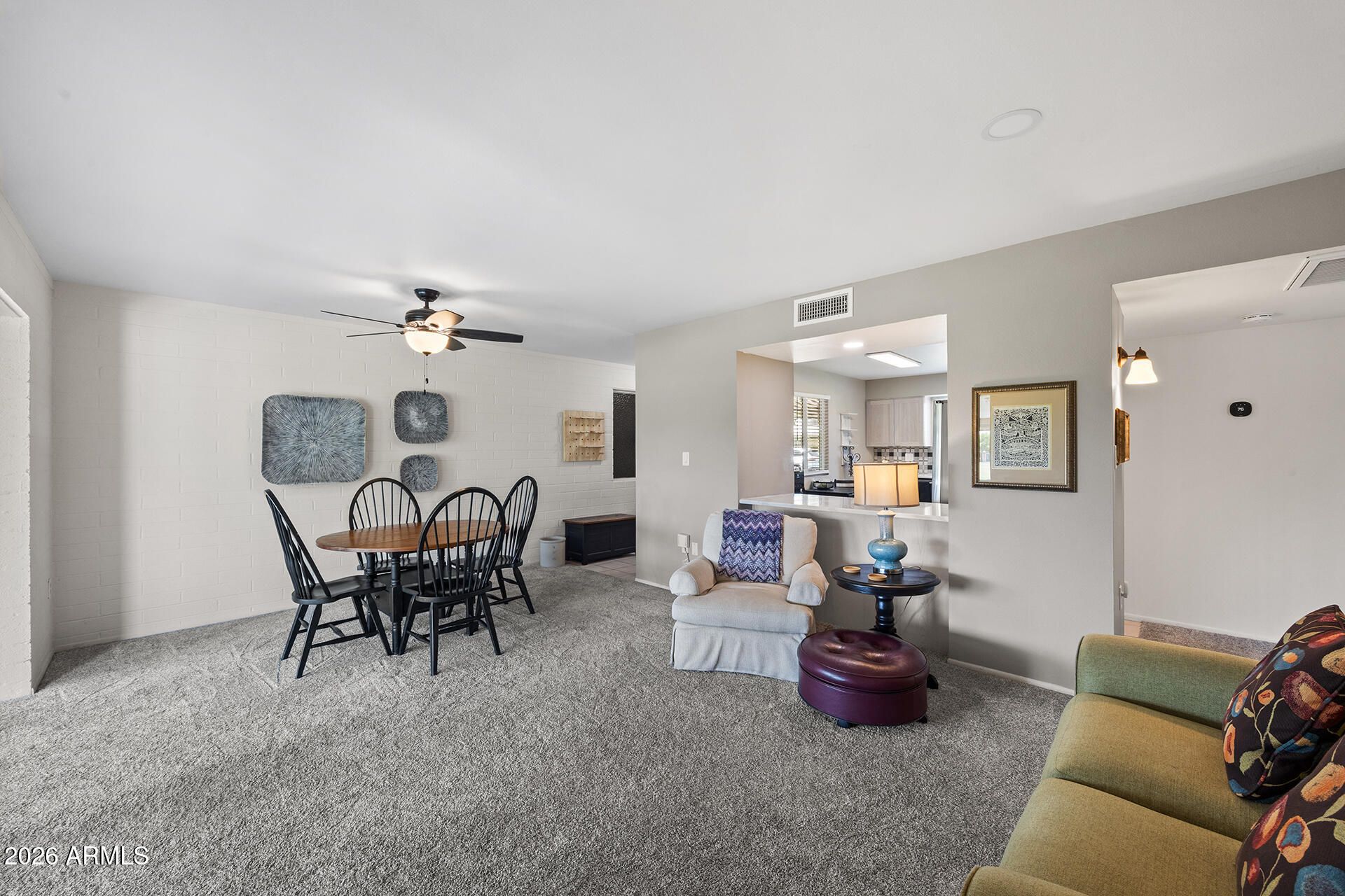 Backyard East-facing sitting directly on the golf course - the kind of lot position that's hard to find in this neighborhood and impossible to manufacture. Morning light floods the main living areas, and the view from the patio is open fairway. The home has been comprehensively updated. Kitchen is all-new - cabinets, countertops, and appliances. New carpet and pad throughout the living areas, double-pane vinyl windows, new slider, new front door with security door, fresh interior paint and outside, and an epoxy garage floor. This isn't a cosmetic refresh; it was done right. Mechanicals are current: HVAC replaced in 2020, and the HOA just completed a full roof replacement in April 2026 - so the buyer walks in with zero deferred maintenance on the two items that matter most. HOA also covers exterior paint and ongoing maintenance, keeping long-term ownership costs predictable. Sun City amenities include 8 recreation centers, multiple pools, pickleball, tennis, bowling, and 8 public golf courses. Convenient to Banner Boswell Medical, shopping, and the 101. 55+ community. One designated parking space. Pets per HOA rules.