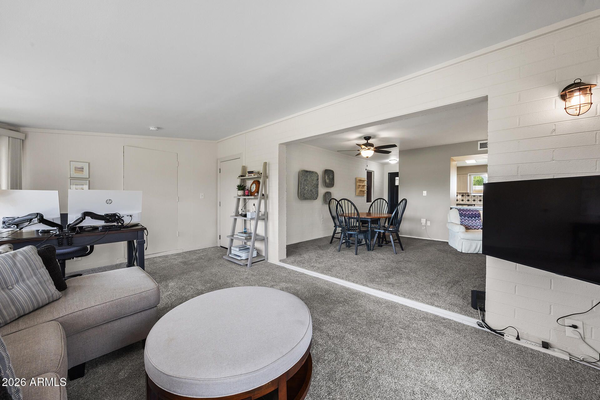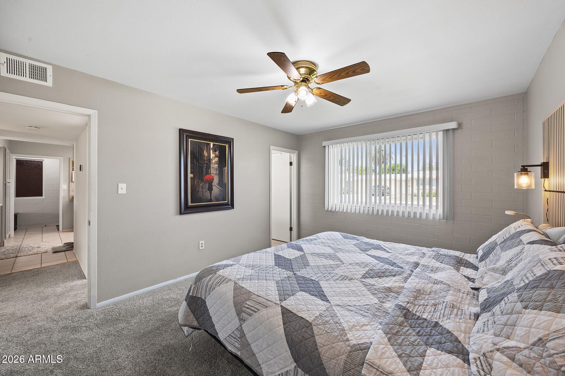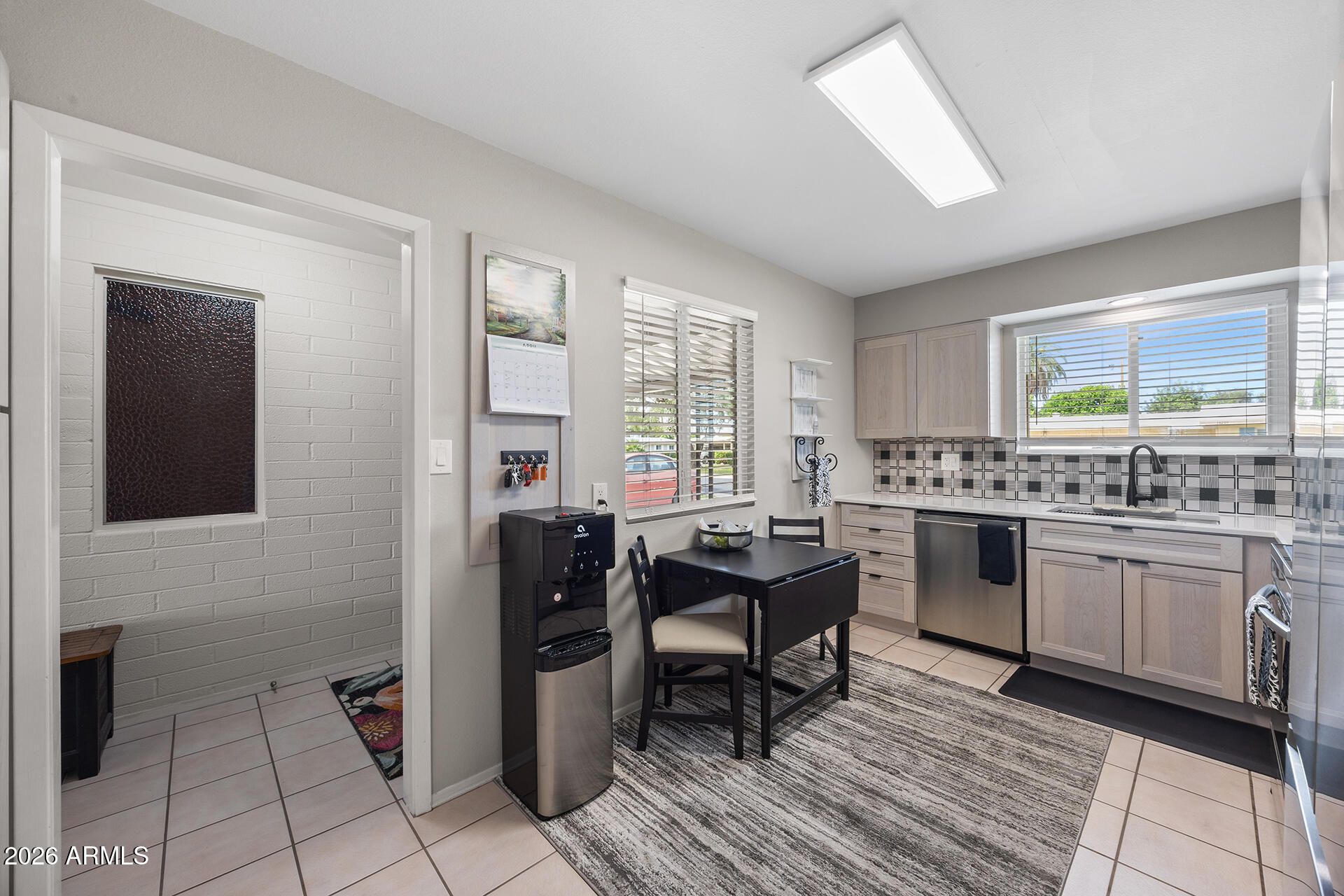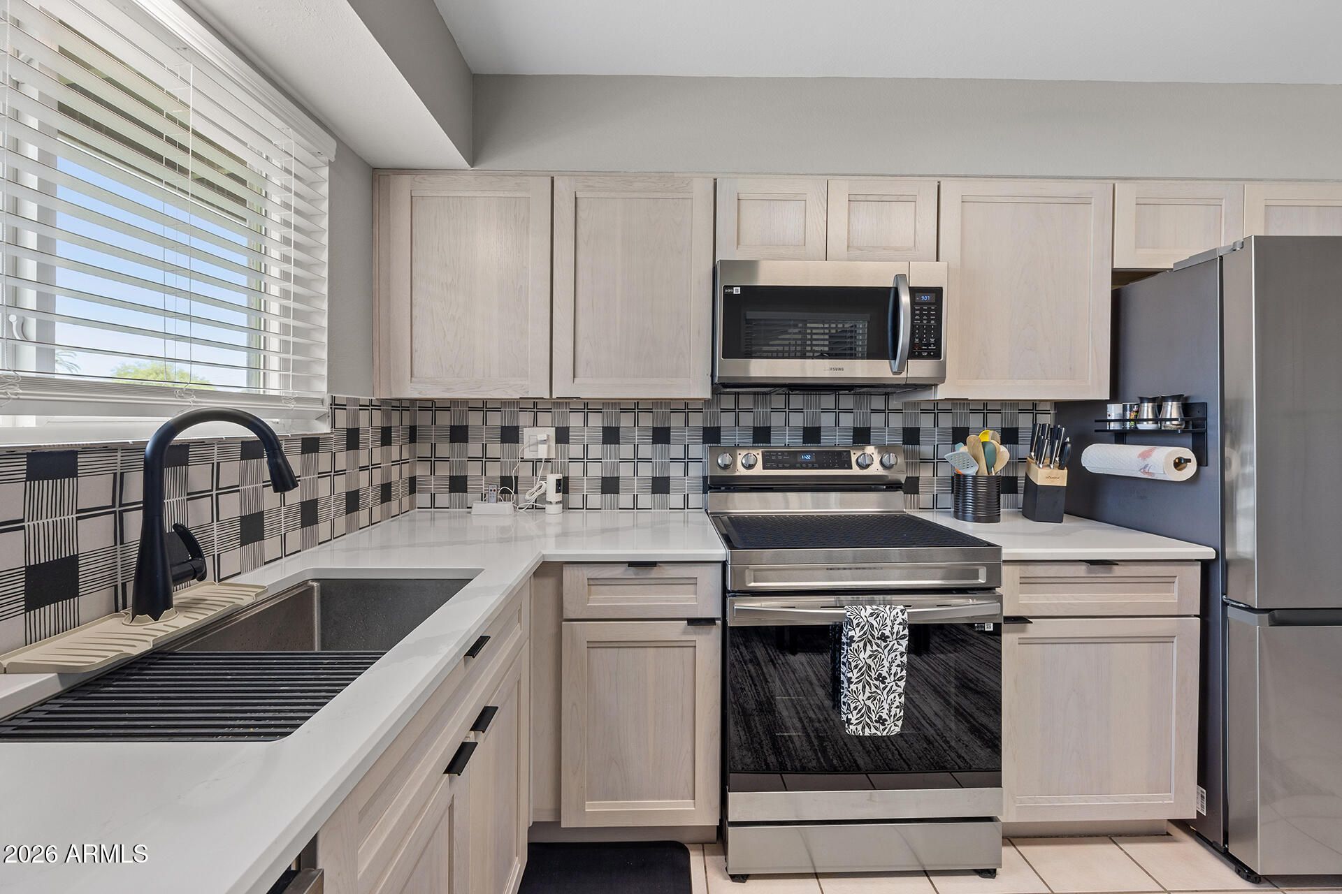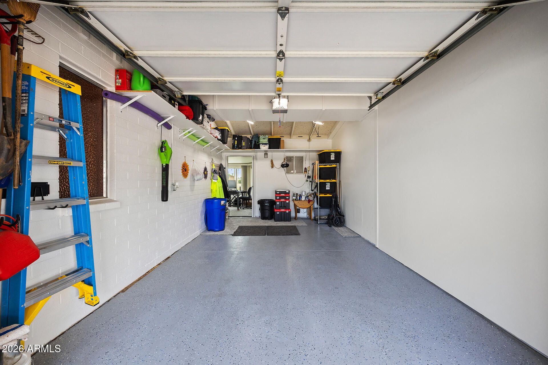 Backyard East-facing sitting directly on the golf course - the kind of lot position that's hard to find in this neighborhood and impossible to manufacture. Morning light floods the main living areas, and the view from the patio is open fairway. The home has been comprehensively updated. Kitchen is all-new - cabinets, countertops, and appliances. New carpet and pad throughout the living areas, double-pane vinyl windows, new slider, new front door with security door, fresh interior paint and outside, and an epoxy garage floor. This isn't a cosmetic refresh; it was done right. Mechanicals are current: HVAC replaced in 2020, and the HOA just completed a full roof replacement in April 2026 - so the buyer walks in with zero deferred maintenance on the two items that matter most. HOA also covers exterior paint and ongoing maintenance, keeping long-term ownership costs predictable. Sun City amenities include 8 recreation centers, multiple pools, pickleball, tennis, bowling, and 8 public golf courses. Convenient to Banner Boswell Medical, shopping, and the 101. 55+ community. One designated parking space. Pets per HOA rules.