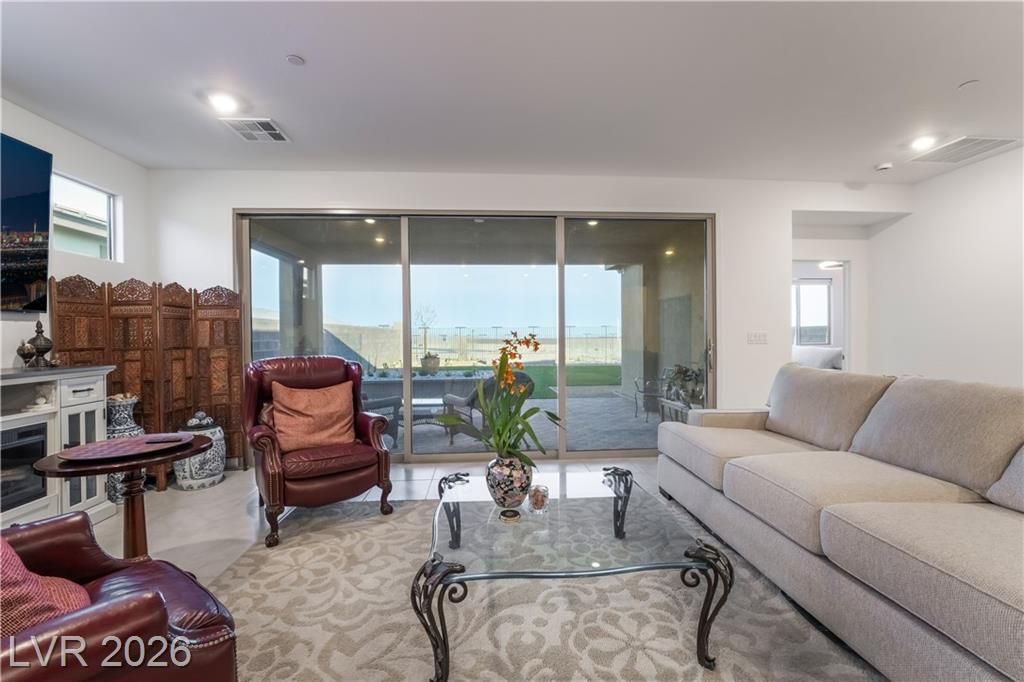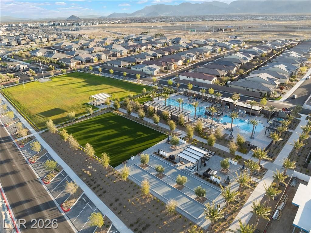 TRILOGY AT SUNSTONE offers a truly one-of-a-kind lifestyle with ever-expanding amenities, social events & resort-style living! Enjoy breathtaking mountain views & vibrant sunrises from the custom designed, extended size lot featuring a covered patio, synthetic grass & planter boxes. Floorplan has 3-bedroom layout with a versatile den/office & seamless indoor-outdoor living through a 3-panel slider. The chef’s kitchen impresses with a massive 12’ island, stainless steel appliances, matte black undermount sink, reverse osmosis system & designer backsplash. Thoughtfully designed with ADA enhancements including 36” doorways, a seamless walk-in shower with grab bars, expanded water closet. Private primary suite separate from secondary rooms. Additional highlights include solar panels, water softener, filtration system, extended garage w/storage, plus an 85” TV & fireplace included. Community amenities rival the Strip: luxury pool deck, top of the line fitness center & brand new restaurant.