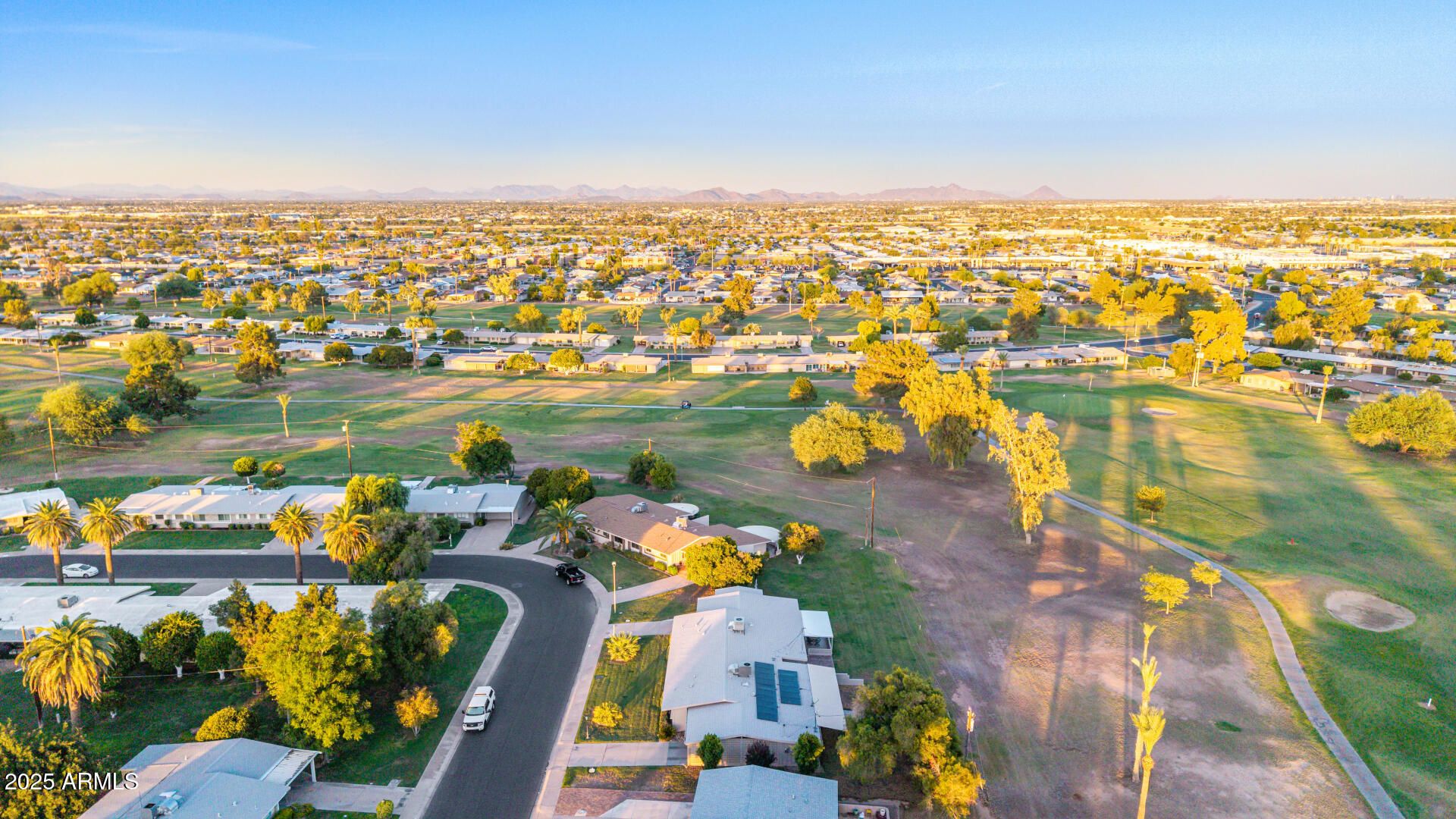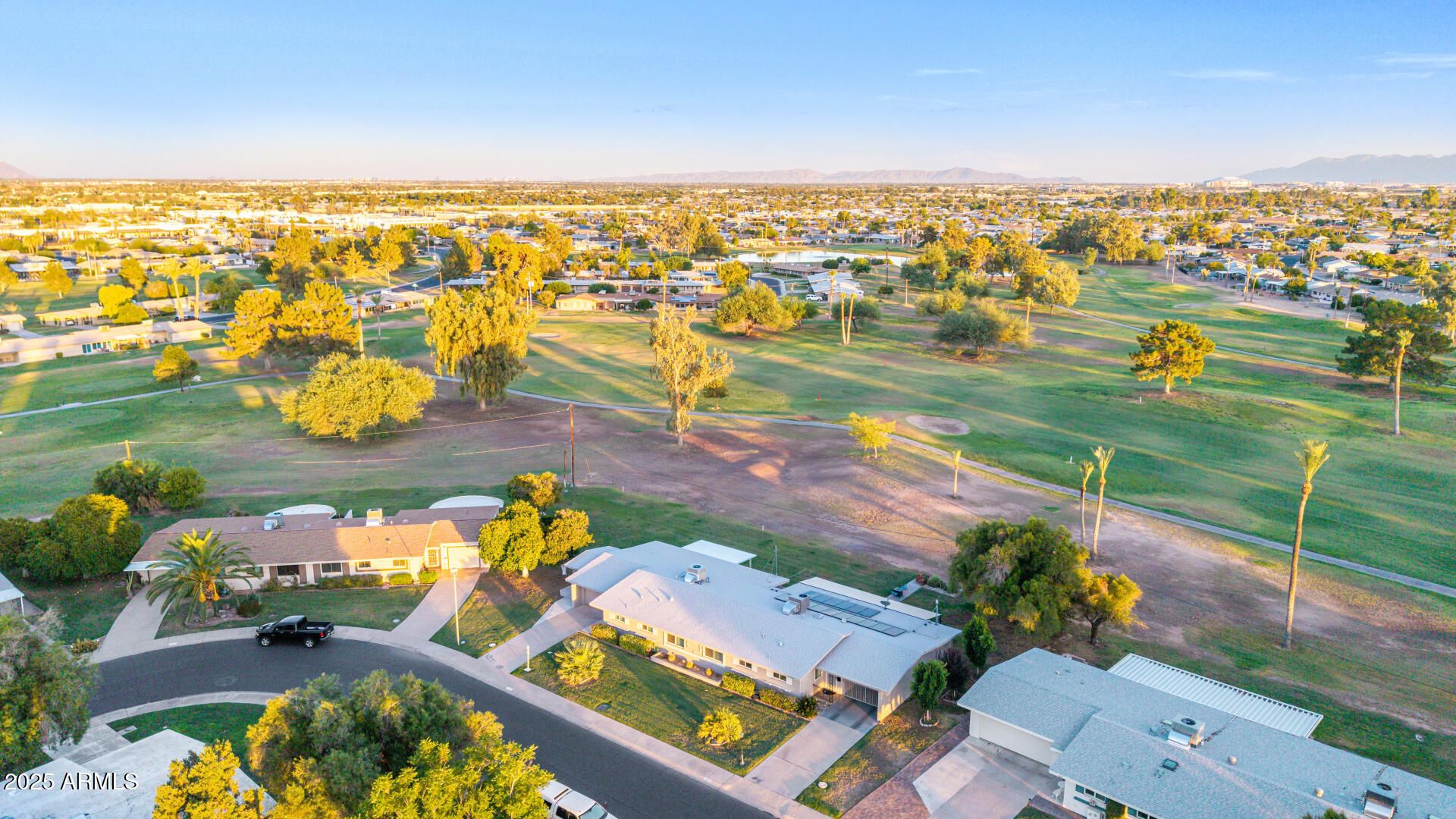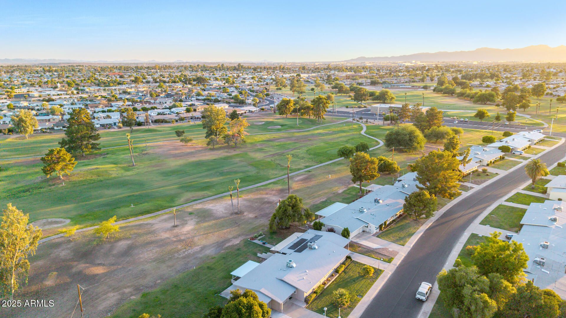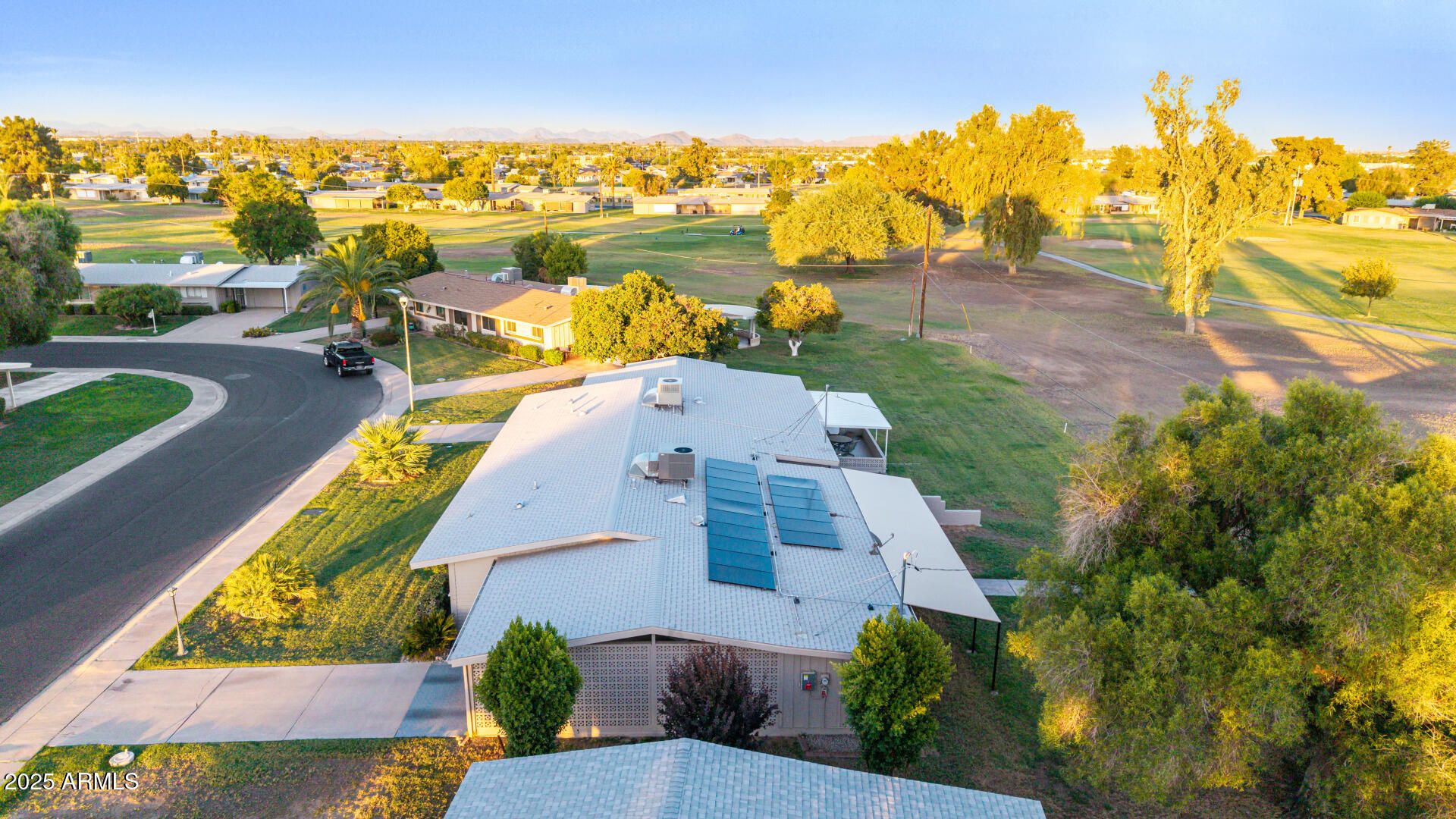 Beautifully kept 2BD/2BA 1,269 sqft golf-course home with leased solar in Sun City! Enjoy stunning double fairway and mountain views from the South Golf Course. Bright & open with tile flooring, spacious great room, and Arizona Room. Kitchen features new ZLINE appliances- including gas stove. Relax under the new patio awning and privacy wall perfect for enjoying Arizona sunsets. Some updates include leased solar, updated electrical panel, RO filter system, vinyl windows, Lennox gas HVAC (2018), roof (2016), and remodeled primary shower. Gated carport for added security. Located in a premier 55+ community with golf, pools, fitness, clubs, and more—this home is ready to enjoy!
