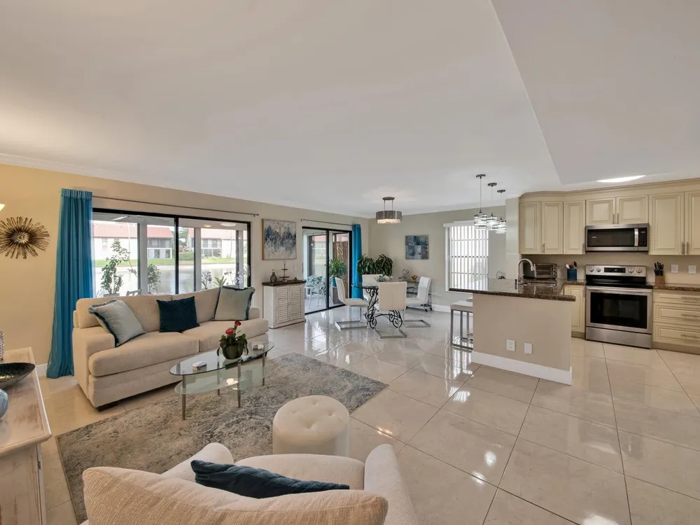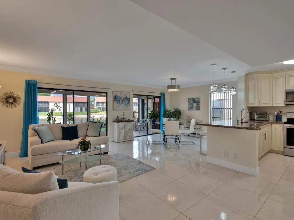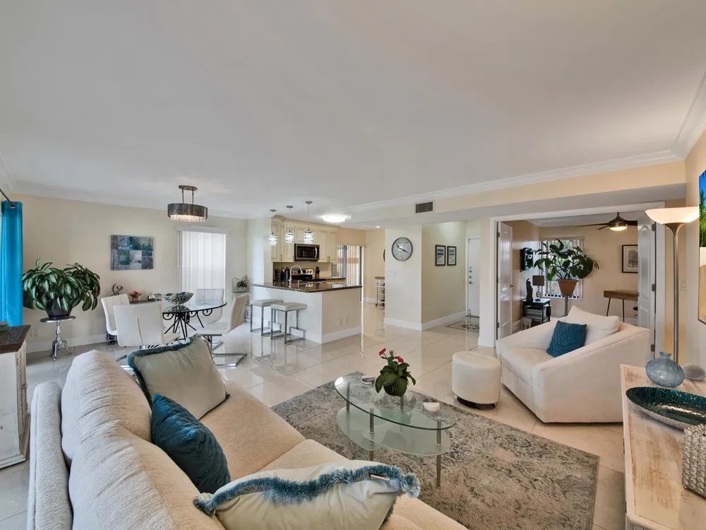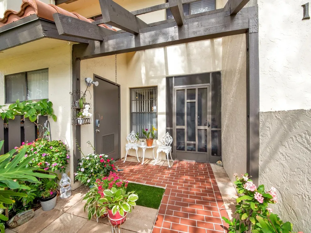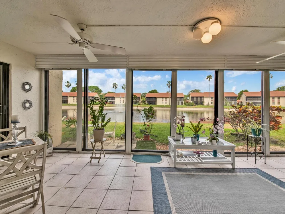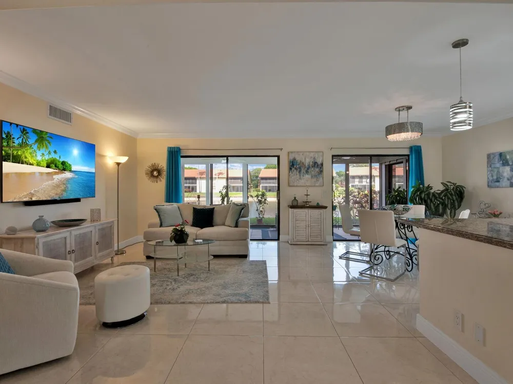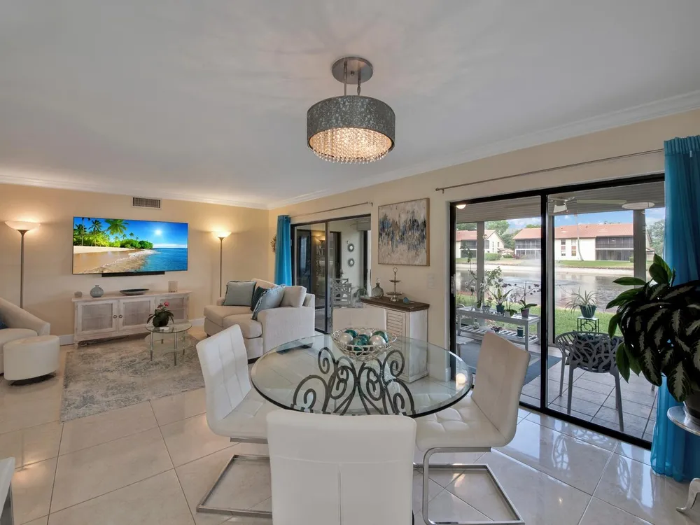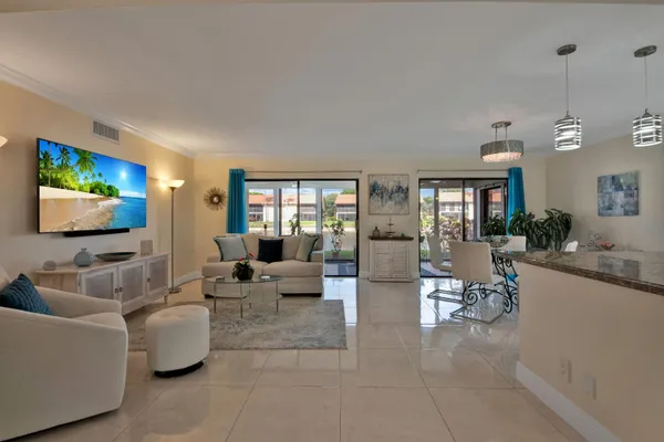 Step into serene, easy living with this beautifully updated first-floor, corner unit in the highly desirable Palm Chase Lakes community. This 3-bedroom, 2-bath residence offers a private garden entrance with additional storage, setting the tone for a home that is both functional and stylish. The open-concept floorplan features smooth walls and ceilings, elegant crown molding, and updated lighting throughout, creating a bright and sophisticated ambiance. The split-bedroom layout offers privacy and comfort, ideal for guests or a home office setup. The modern kitchen boasts sleek European-style cabinetry, granite countertops, and a cozy breakfast nook that opens to a charming BBQ area--perfect for entertaining or relaxed outdoor dining.