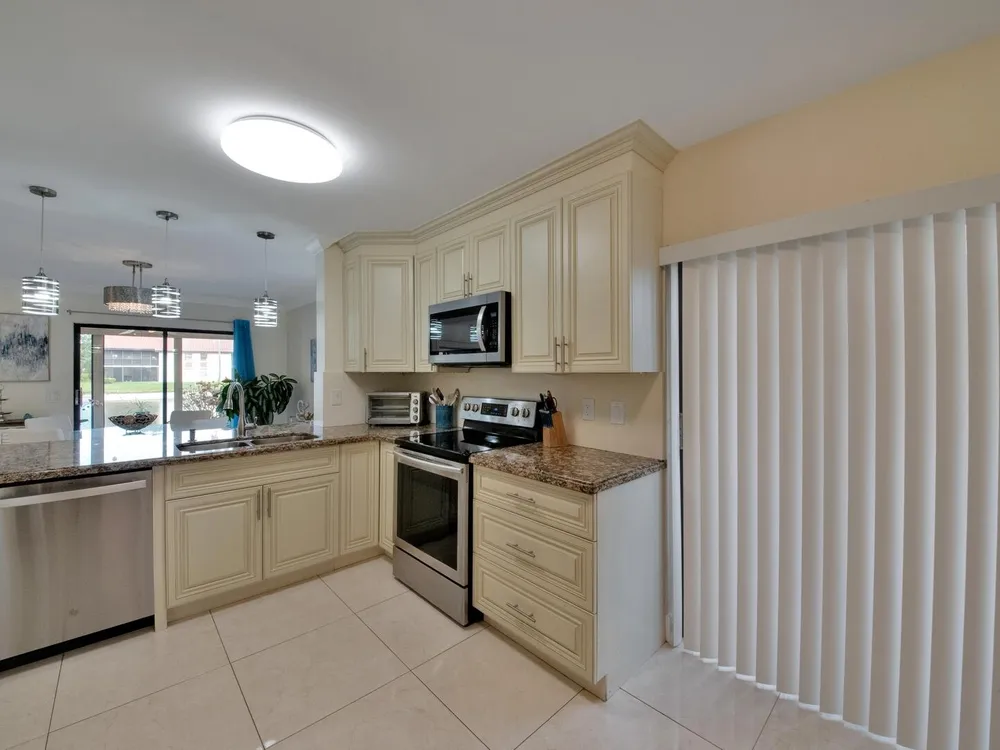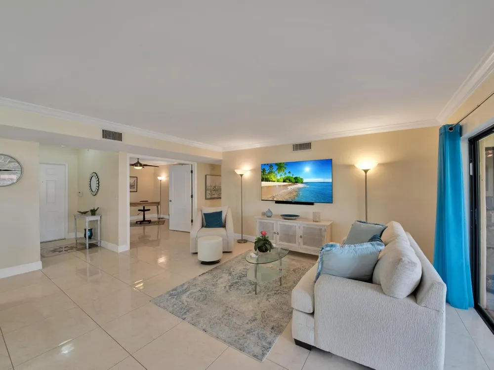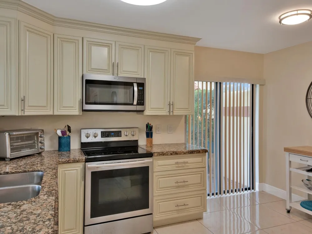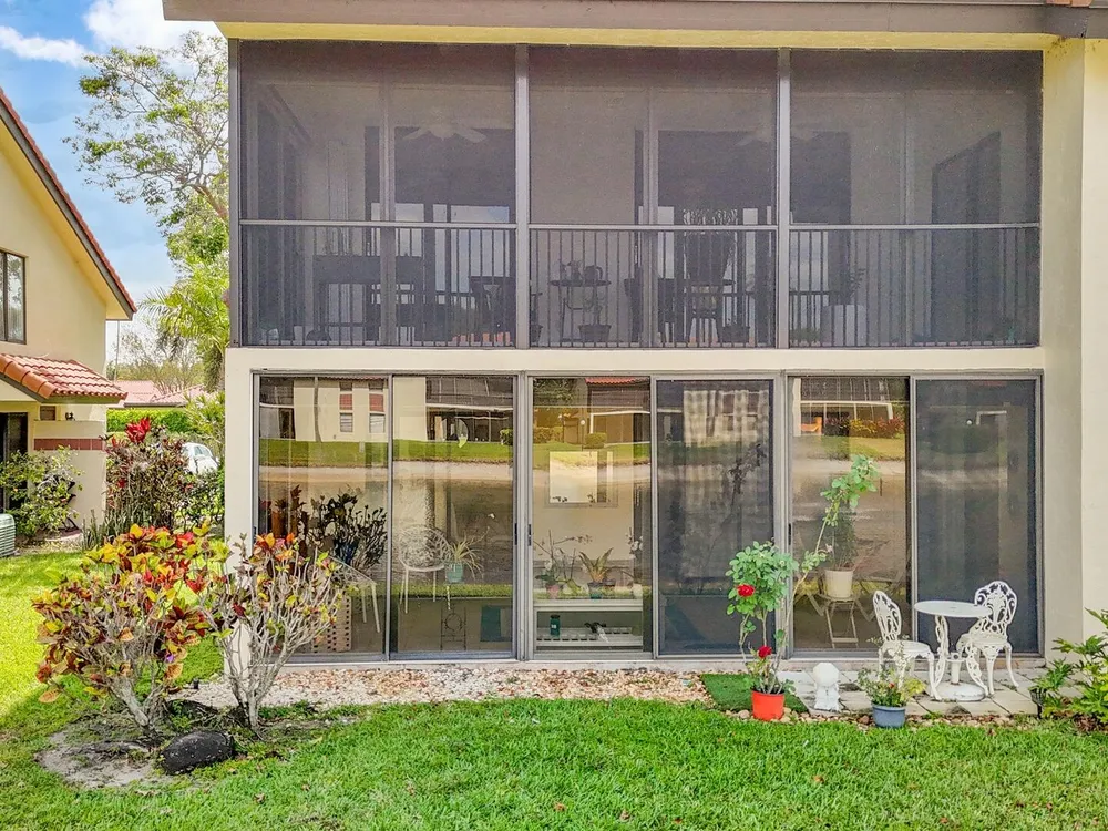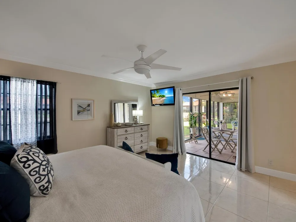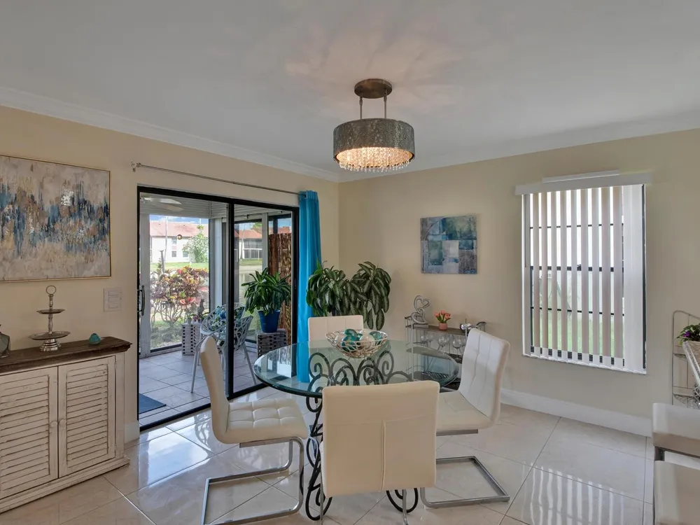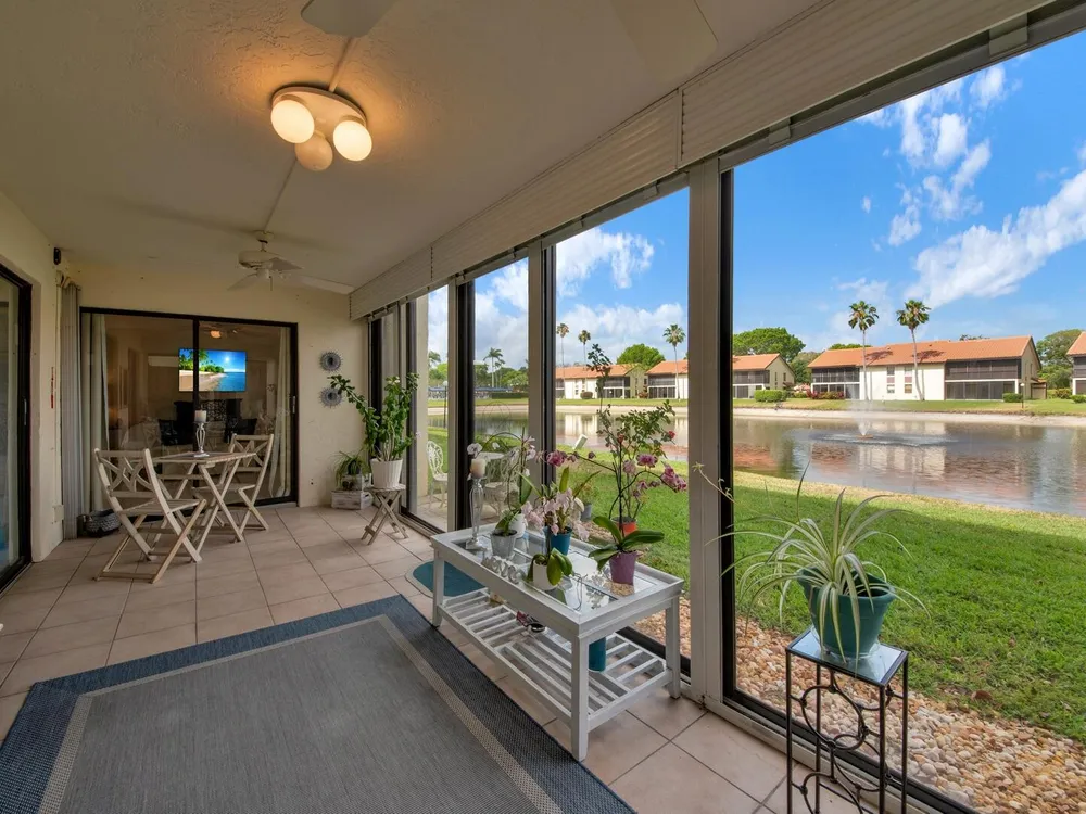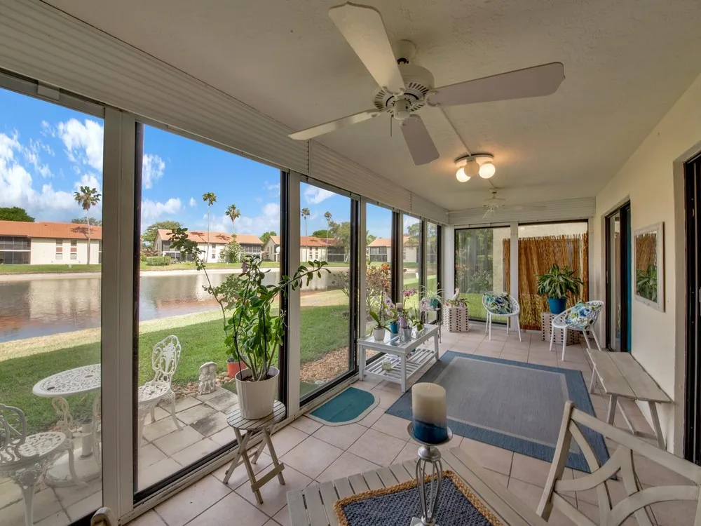 Step into serene, easy living with this beautifully updated first-floor, corner unit in the highly desirable Palm Chase Lakes community. This 3-bedroom, 2-bath residence offers a private garden entrance with additional storage, setting the tone for a home that is both functional and stylish. The open-concept floorplan features smooth walls and ceilings, elegant crown molding, and updated lighting throughout, creating a bright and sophisticated ambiance. The split-bedroom layout offers privacy and comfort, ideal for guests or a home office setup. The modern kitchen boasts sleek European-style cabinetry, granite countertops, and a cozy breakfast nook that opens to a charming BBQ area--perfect for entertaining or relaxed outdoor dining.