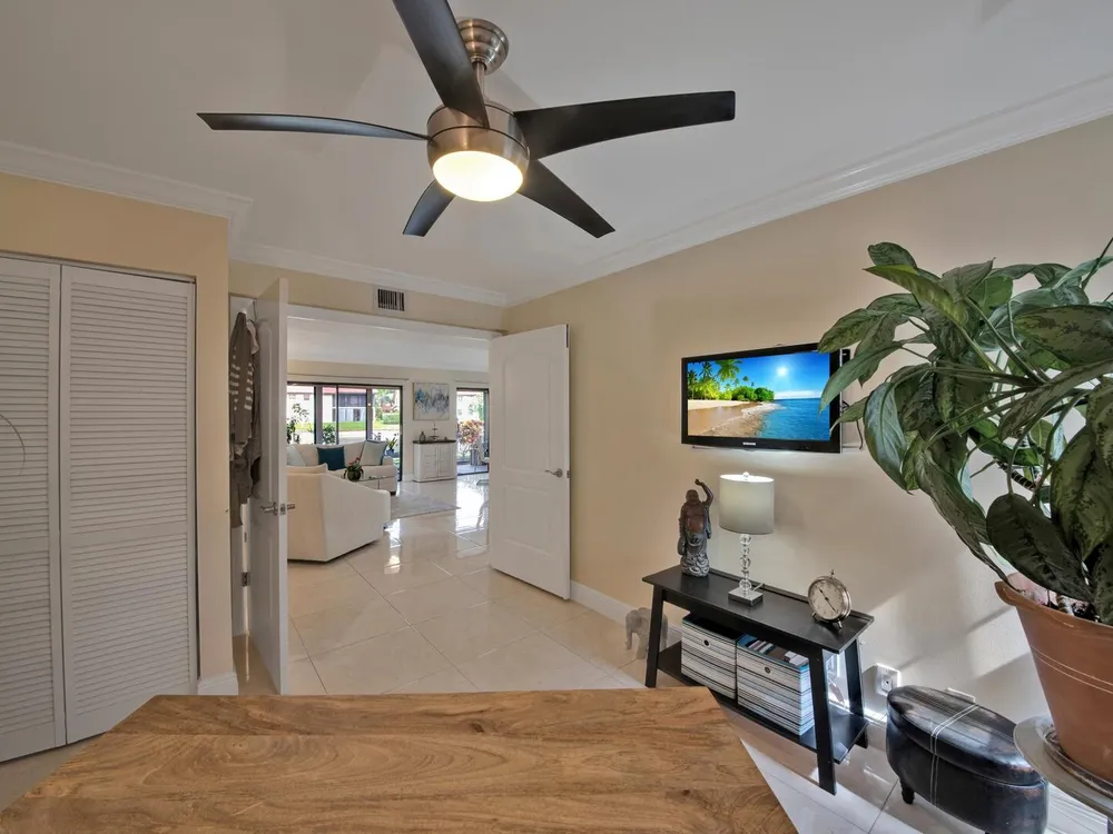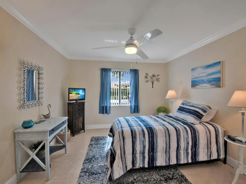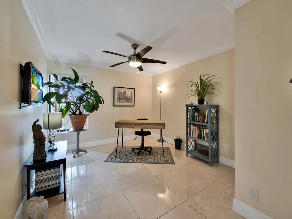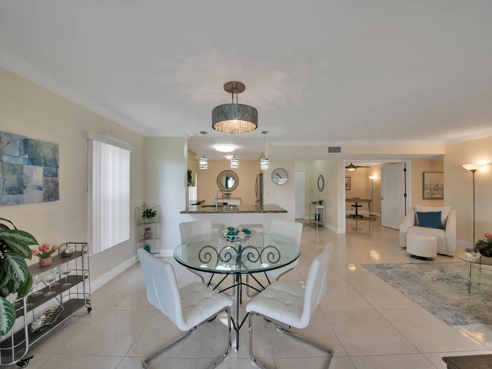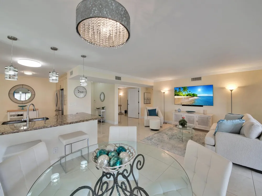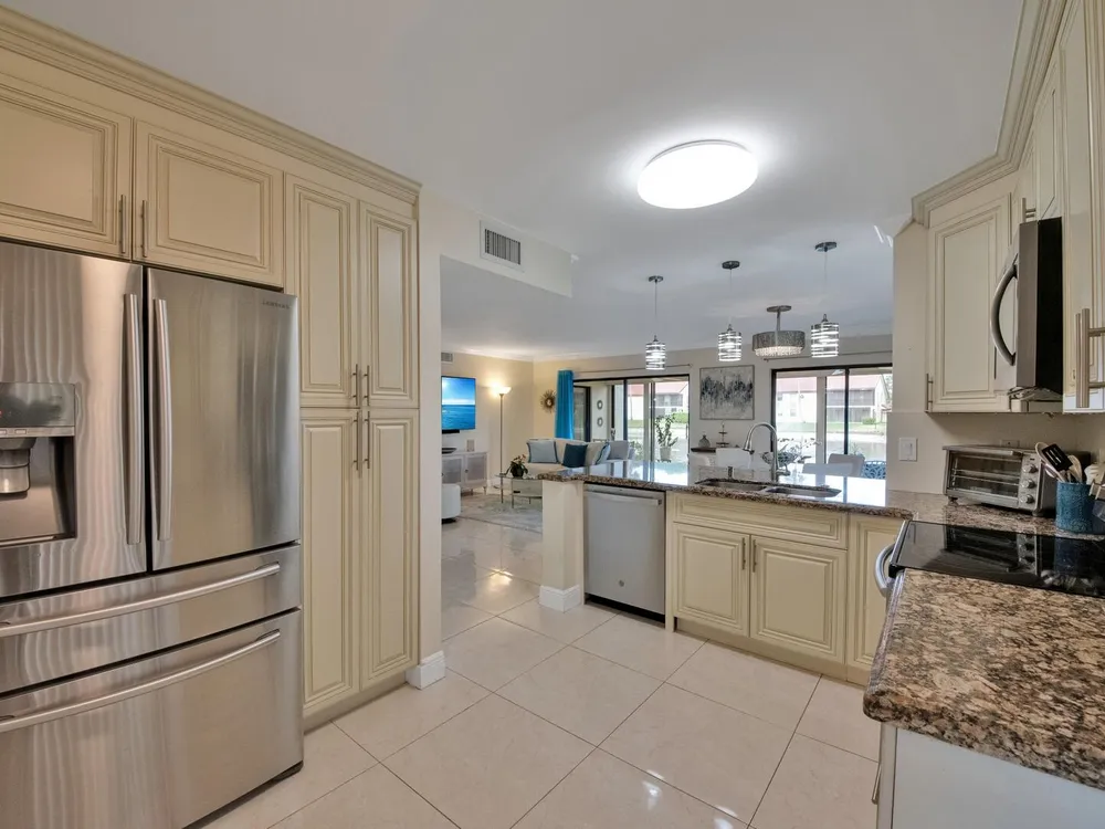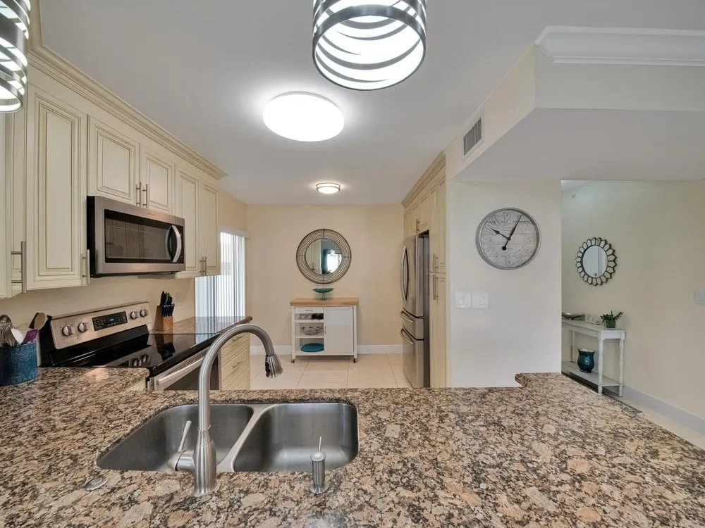 Step into serene, easy living with this beautifully updated first-floor, corner unit in the highly desirable Palm Chase Lakes community. This 3-bedroom, 2-bath residence offers a private garden entrance with additional storage, setting the tone for a home that is both functional and stylish. The open-concept floorplan features smooth walls and ceilings, elegant crown molding, and updated lighting throughout, creating a bright and sophisticated ambiance. The split-bedroom layout offers privacy and comfort, ideal for guests or a home office setup. The modern kitchen boasts sleek European-style cabinetry, granite countertops, and a cozy breakfast nook that opens to a charming BBQ area--perfect for entertaining or relaxed outdoor dining.