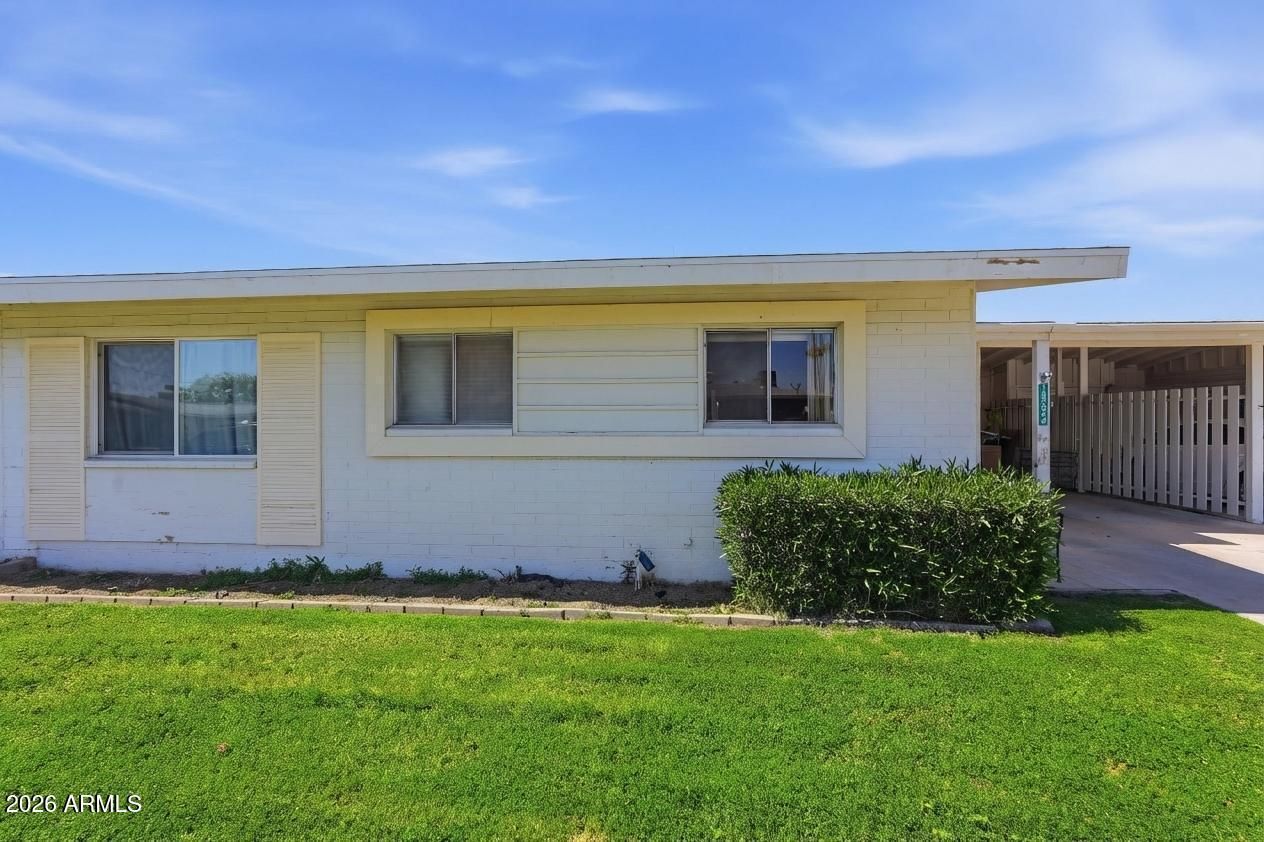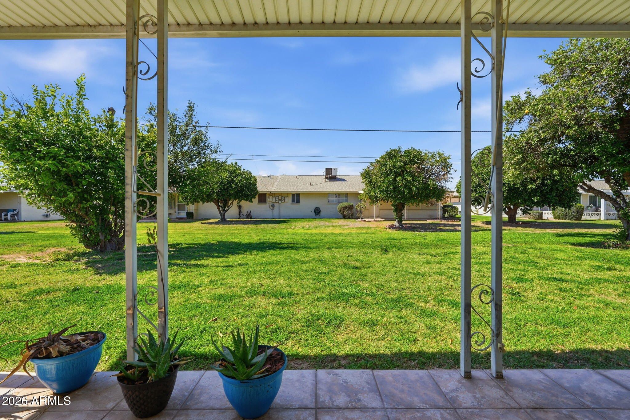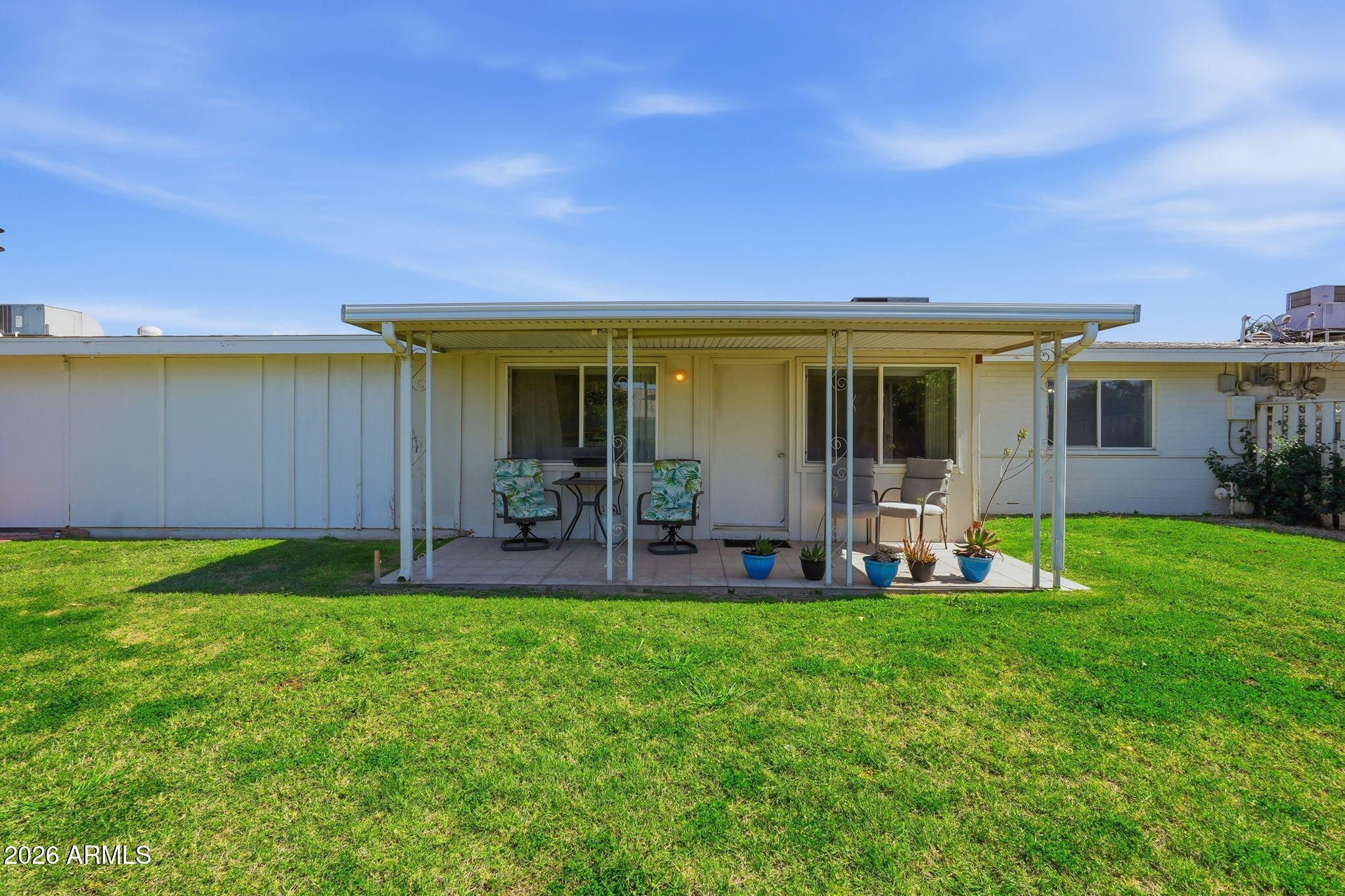 ***Assumable Mortgage at 2.343%***Welcome to this beautifully maintained and light-filled 2-bedroom, 2-bath single-level patio home nestled in the heart of Sun City's premier active adult community. This popular Del Webb floor plan offers an open, airy layout with updated neutral gray and white tile flooring throughout, creating a clean, modern feel that complements any style. The spacious living room flows seamlessly into the kitchen, featuring granite countertops, ample cabinetry, and excellent natural light perfect for everyday living or entertaining. Both bedrooms are generously sized, and the home offers exceptional storage throughout, including carport storage and a huge indoor laundry room with washer and dryer included. One of the standout features is the enclosed Arizona Room, ideal as extra living space, a home office, hobby or craft room, or a peaceful spot to enjoy your morning coffee. From there, step out to a covered and tiled patio overlooking a lush green backyard with mature fruit trees, offering a serene and private outdoor retreat rarely found in patio homes. Enjoy peace of mind knowing the main sewer line has been replaced and the roof is newer. Solid cinderblock construction helps keep the home cool and energy-efficient year-round. Located just 0.3 miles from Fairway Recreation Center and within walking distance to Sun Bowl, live music, golf courses, shopping, dining, and entertainment, this location is hard to beat. Pets welcome. HOA does not allow rentals, preserving the integrity of this well-kept community. Updated, spacious, and ideally located this Sun City gem is truly move-in ready and ready to be enjoyed.