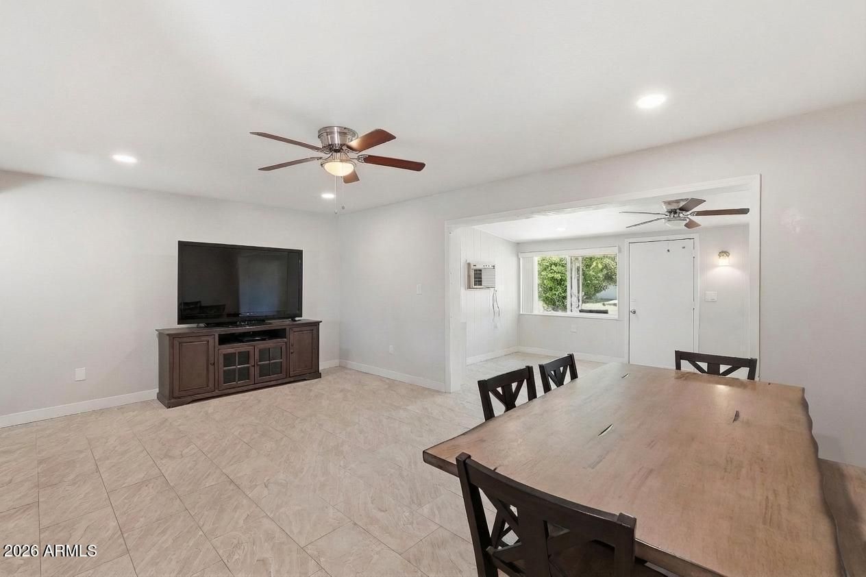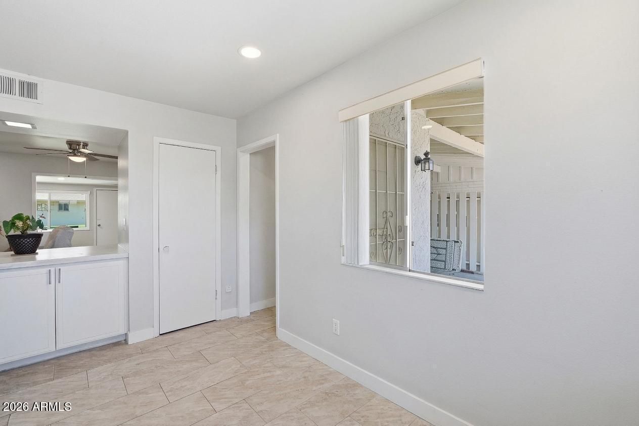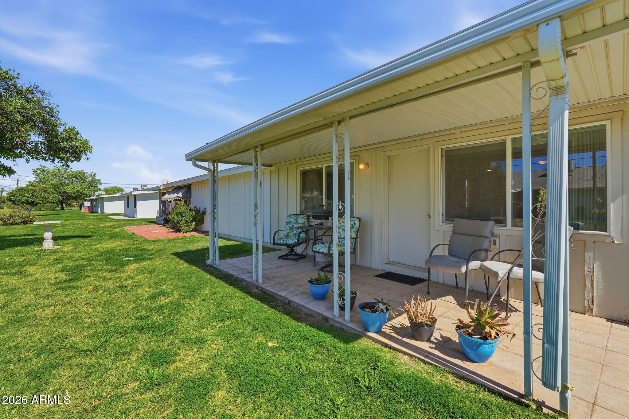 ***Assumable Mortgage at 2.343%***Welcome to this beautifully maintained and light-filled 2-bedroom, 2-bath single-level patio home nestled in the heart of Sun City's premier active adult community. This popular Del Webb floor plan offers an open, airy layout with updated neutral gray and white tile flooring throughout, creating a clean, modern feel that complements any style. The spacious living room flows seamlessly into the kitchen, featuring granite countertops, ample cabinetry, and excellent natural light perfect for everyday living or entertaining. Both bedrooms are generously sized, and the home offers exceptional storage throughout, including carport storage and a huge indoor laundry room with washer and dryer included. One of the standout features is the enclosed Arizona Room, ideal as extra living space, a home office, hobby or craft room, or a peaceful spot to enjoy your morning coffee. From there, step out to a covered and tiled patio overlooking a lush green backyard with mature fruit trees, offering a serene and private outdoor retreat rarely found in patio homes. Enjoy peace of mind knowing the main sewer line has been replaced and the roof is newer. Solid cinderblock construction helps keep the home cool and energy-efficient year-round. Located just 0.3 miles from Fairway Recreation Center and within walking distance to Sun Bowl, live music, golf courses, shopping, dining, and entertainment, this location is hard to beat. Pets welcome. HOA does not allow rentals, preserving the integrity of this well-kept community. Updated, spacious, and ideally located this Sun City gem is truly move-in ready and ready to be enjoyed.