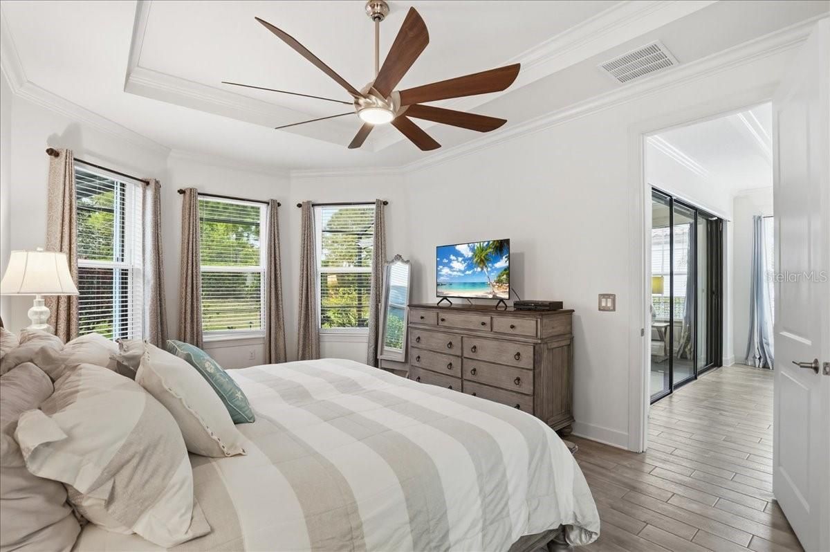 - Ceiling Fan(s), Crown Molding, High Ceilings, Open Floorplan, Main Level Primary, Stone Counters, Thermostat, Tray Ceiling(s), Walk-In Closet(s), Window Treatments