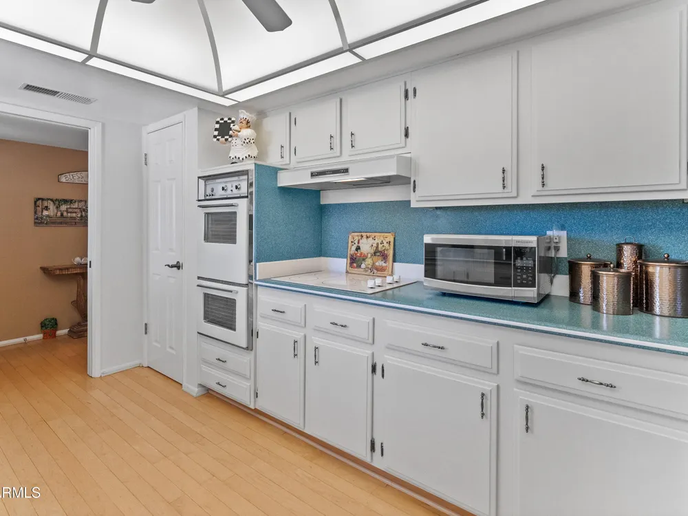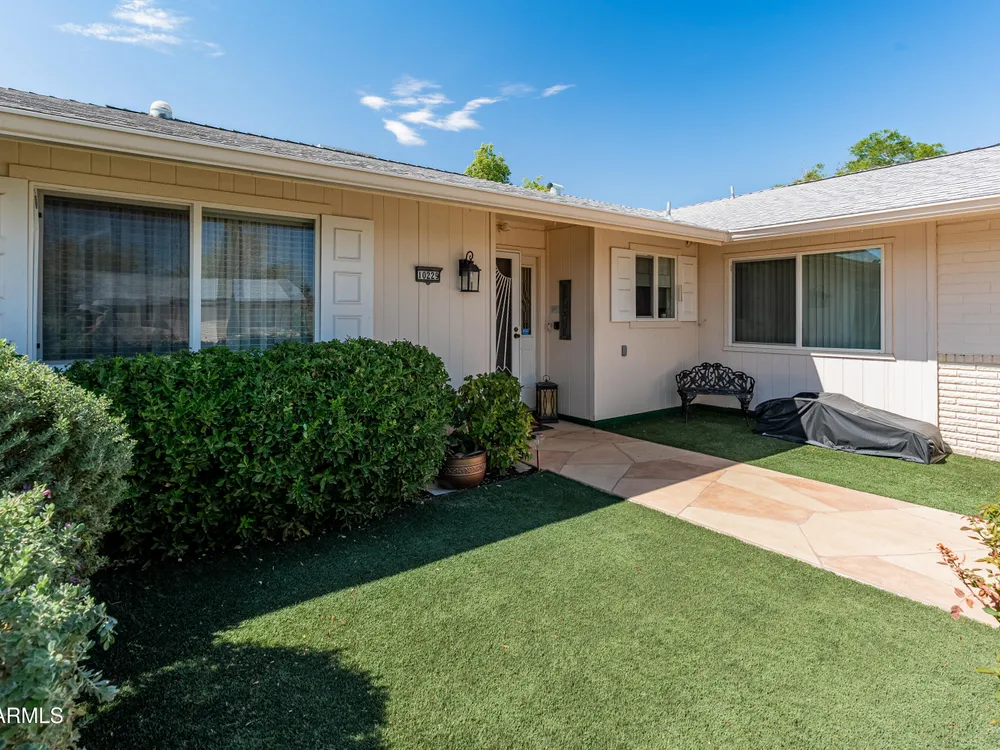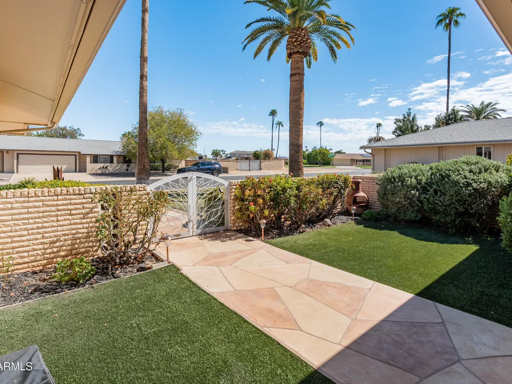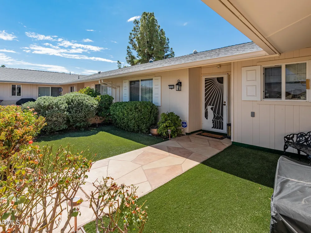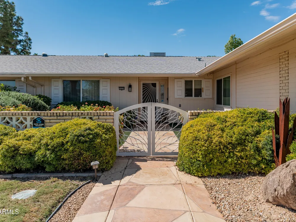 Charming Duplex with Unmatched Greenbelt Views This beautifully updated duplex offers breathtaking, uninterrupted views of a lush greenbelt and mature trees. The expanded living room features oversized windows that flood the space with natural light and frame the stunning scenery. Enjoy a welcoming front patio adorned with artificial turf, vibrant roses, and other lovely plantings. Inside, the home offers two bedrooms and two bathrooms with partial remodels, including walk-in showers for enhanced accessibility—all on one level. Modern touches include removed popcorn ceilings, recessed lighting, skylights, and custom crown molding. An electric fireplace adds a cozy ambiance and conveys with the home. Flooring upgrades include elegant travertine in the living areas.