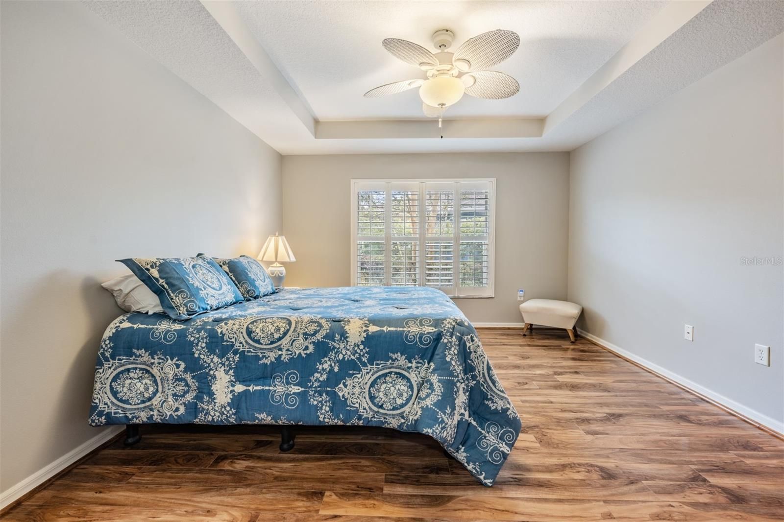MOVE-IN READY and METICULOUSLY MAINTAINED home in the highly sought after Tampa Bay Golf & Country Club! NEW ROOF to be Installed by Seller prior to closing! (Buyers may choose shingle color). This home features NEW interior paint that makes it a blank slate for your decor and customization! High ceilings and a neutral palette greet you as you enter the leaded glass door from the screened front porch. Wood Laminate floors throughout with Ceramic Tile in the Foyer, laundry room and wet areas. Sliding doors, with retractable privacy screen, from Great room give access to your screened lanai. Formal Dining connects off of the kitchen creating the perfect space for hosting friends and family for a meal! Kitchen has warm cabinets, neutral counters and all Samsung stainless-steel appliances including a smooth top range and a BRAND NEW 2024 Samsung Refrigerator. The kitchen also features an eat-in space with a bay window complete with plantation shutters and a view of the landscaped backyard. Owners RETREAT with tray ceilings is at the rear of the home with bath Ensuite. Lots of closet space with 2 walk-in closets featuring custom cabinetry for built-in organization, dual sinks, soaking tub, shower and water closet. Secondary bedroom has large window which overlooks front lawn and Full bath located at the front of the home. DEN/Flex space adjacent to Secondary bed & bath can be used as a home office, fitness area or 3rd bedroom if a closet is added. Inside laundry room with front load LG washer and dryer plus room to add storage. This home is also equipped with a No-Salt Water Conditioning System. REST EASY and enjoy all the AMENITIES this Man Guard Gated Community has to offer! Tampa Bay’s premier active 55+ community features a variety of recreational options. Enjoy two Golf courses... the 18-hole Championship course and a 9-hole executive course with optional memberships. Amenities included in the HOA fee include two swimming pools, with the large resort-style pool featuring fountains and heated to 80 degrees. Engage in activities such as pickleball, tennis, bocce ball, shuffleboard, cornhole, and card games. The newly upgraded activity center includes a state-of-the-art fitness facility, billiards room, craft/hobby room, library with computers and a card room. The community has no CDD fees and offers affordable HOA dues that includes lawncare with annual mulching and sprinkler system maintenance, basic cable with 2 boxes and high-speed internet. Banquet facilities are available with a stage and dance floor for inhouse events, full service restaurant and bar/grill, onsite entertainment, bingo, dinner shows and Sunday Brunch! Located north of Tampa close to major highways for easy access to shopping, malls, medical facilities, airports and the Beaches! CALL TODAY!