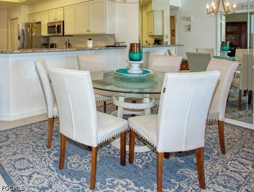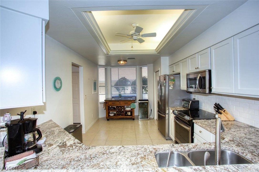 Looking for first-floor convenience? This Abbey has it all. Enjoy the ease of ground-floor living paired with thoughtful updates throughout. Floors are tile and new laminate in primary bedroom/bath. The kitchen has been refreshed with granite countertops, refaced cabinetry, and a stainless steel appliance package. The wine cooler and the freezer in the garage stays. The custom built mobile island in kitchen adds storage. The guest bath features a walk-in shower, comfort height toilet and vanity that will impress visitors. The primary bath has been refreshed with a new shower, quartz countertop, dual sinks, and a comfort-height toilet. The heavy lifting is already done! Furnishings and fixtures updated and everything you see stays—making this an easy move-in opportunity. The south facing lanai overlooks the 15th island hole, offering stunning views of the lake and golf course. Impact glass throughout, a safe in the primary closet and a 2019 AC give you peace of mind. A one car garage completes the package. Located within an easy walk to the clubhouse, pro shop, activity center, and a nearby neighborhood pool, this home combines location, updates, and lifestyle. Residents of Heritage Palms Golf & Country Club enjoy an active, resort-style lifestyle with two 18-hole golf courses, tennis and pickleball leagues, multiple pools and spas, fitness center, activity center, and three on-site restaurant venues—all in a beautifully maintained, gated community in the heart of Fort Myers.