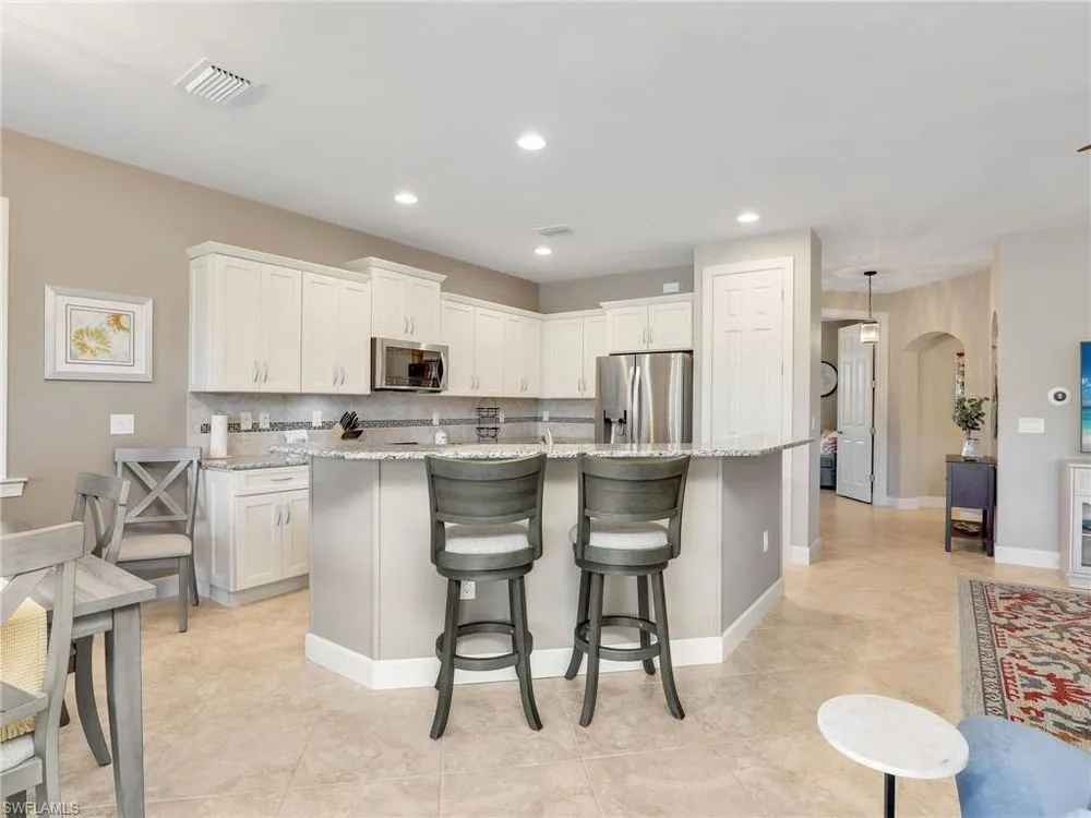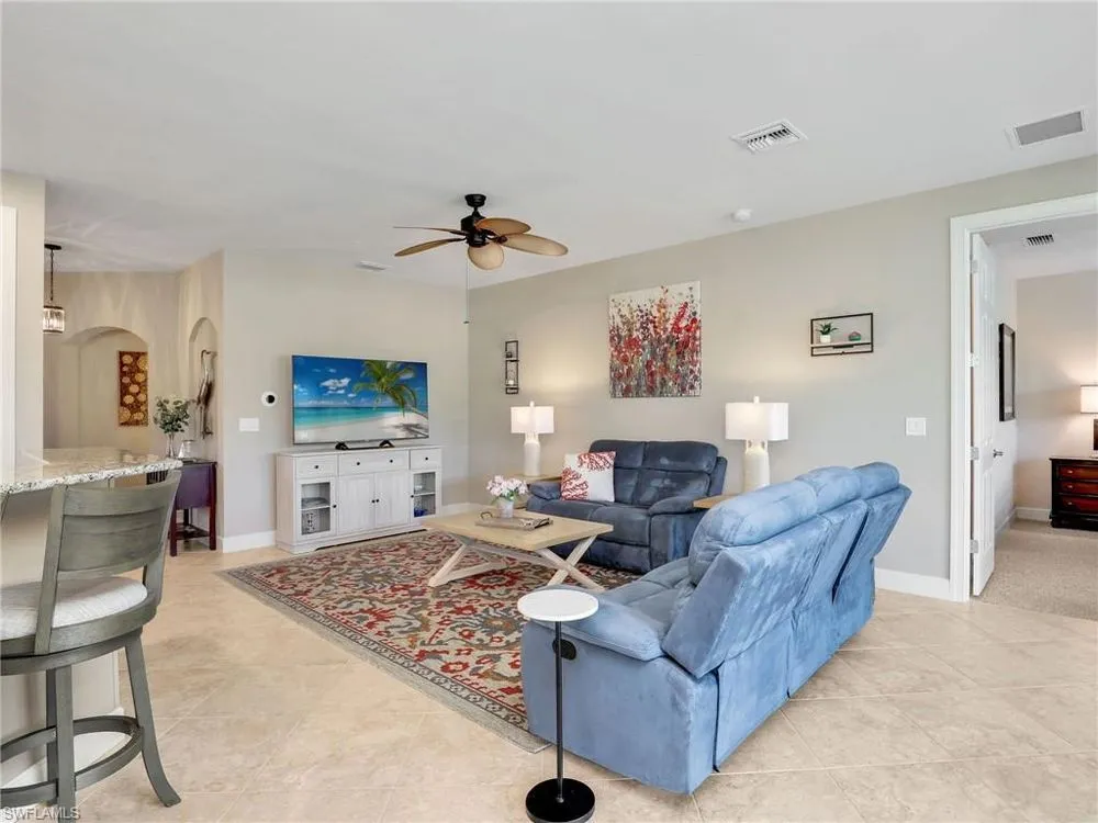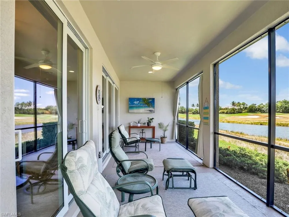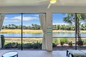Enjoy stunning lake and golf course views from this beautifully maintained first-floor carriage home in one of Fort Myers’ most sought-after gated communities. This spacious residence features 2 bedrooms, 2 bathrooms, a den (perfect for a home office or optional third bedroom), and an attached 2-car garage. Offered turnkey furnished, the home is move-in ready with thoughtful upgrades and elegant finishes throughout. The open-concept layout showcases high 10’ ceilings, 8’ doors, and tile laid on the diagonal, creating a bright and expansive feel. The kitchen is both functional and stylish with granite countertops, stainless steel appliances, white cabinetry, a cozy breakfast nook, and a custom tile backsplash. Two sets of sliding glass doors open to a screened lanai where you’ll enjoy serene water and fairway views—ideal for relaxing or entertaining. The primary suite is a peaceful retreat with a large walk-in closet, dual vanities, an oversized soaking tub, and a separate glass-enclosed shower. Hurricane-impact windows and doors offer added security and peace of mind, while upgrades like plantation shutters, custom vertical blinds, a freshly painted interior, epoxy-coated garage floor, and a 2024 A/C unit add value and comfort. A well-appointed laundry room includes a washer, dryer, and utility sink. The HOA covers essentials such as cable, internet, water, landscaping, exterior insurance, and pest control—offering worry-free living. Located in The Plantation Golf & Country Club, residents enjoy access to top-tier amenities including a resort-style pool and spa, fitness center, tennis and pickleball courts, bocce ball, clubhouse dining, and an optional golf membership. Conveniently located near I-75, RSW airport, shopping, dining, and Gulf Coast beaches, this home blends luxury, location, and lifestyle seamlessly.