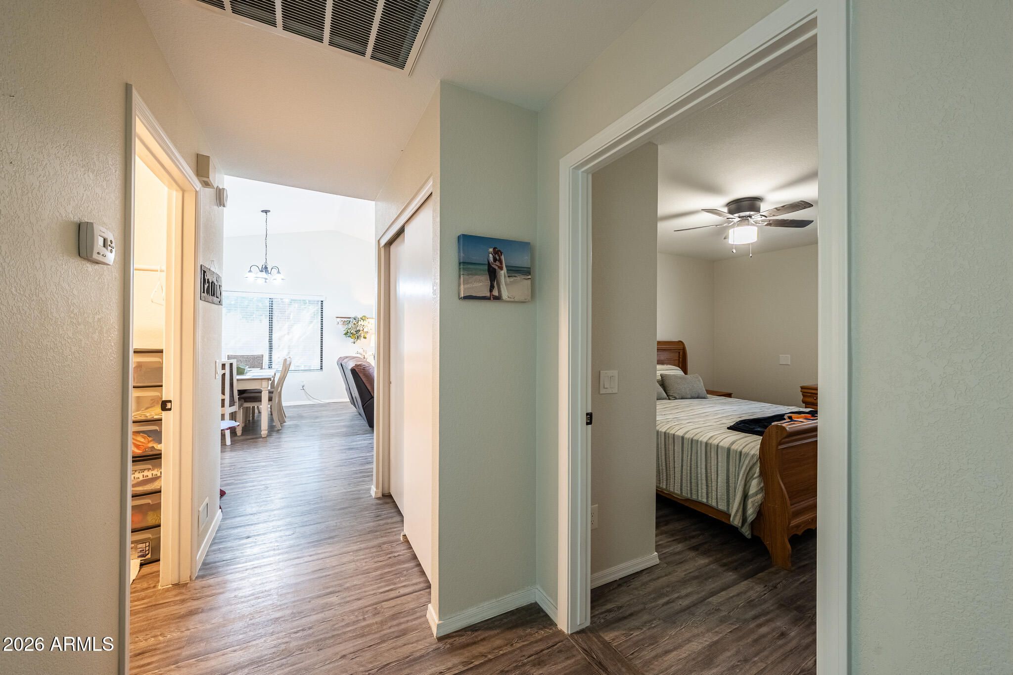 This well-kept Cortez model in Sun Lakes offers 1,323 sq ft with 2 bedrooms and 2 baths. Wood-look plank flooring runs throughout. The kitchen features stainless appliances, a large side-by-side fridge, and a cozy breakfast area. The living and dining rooms have vaulted ceilings and open to a spacious covered patio with pavers. The primary bedroom includes a walk-in closet, dual-sink bath, and patio access to the included hot tub. A gas griddle, LG washer and dryer, and an extra garage refrigerator all stay. The garage has an epoxy floor, storage cabinets, and a water softener.