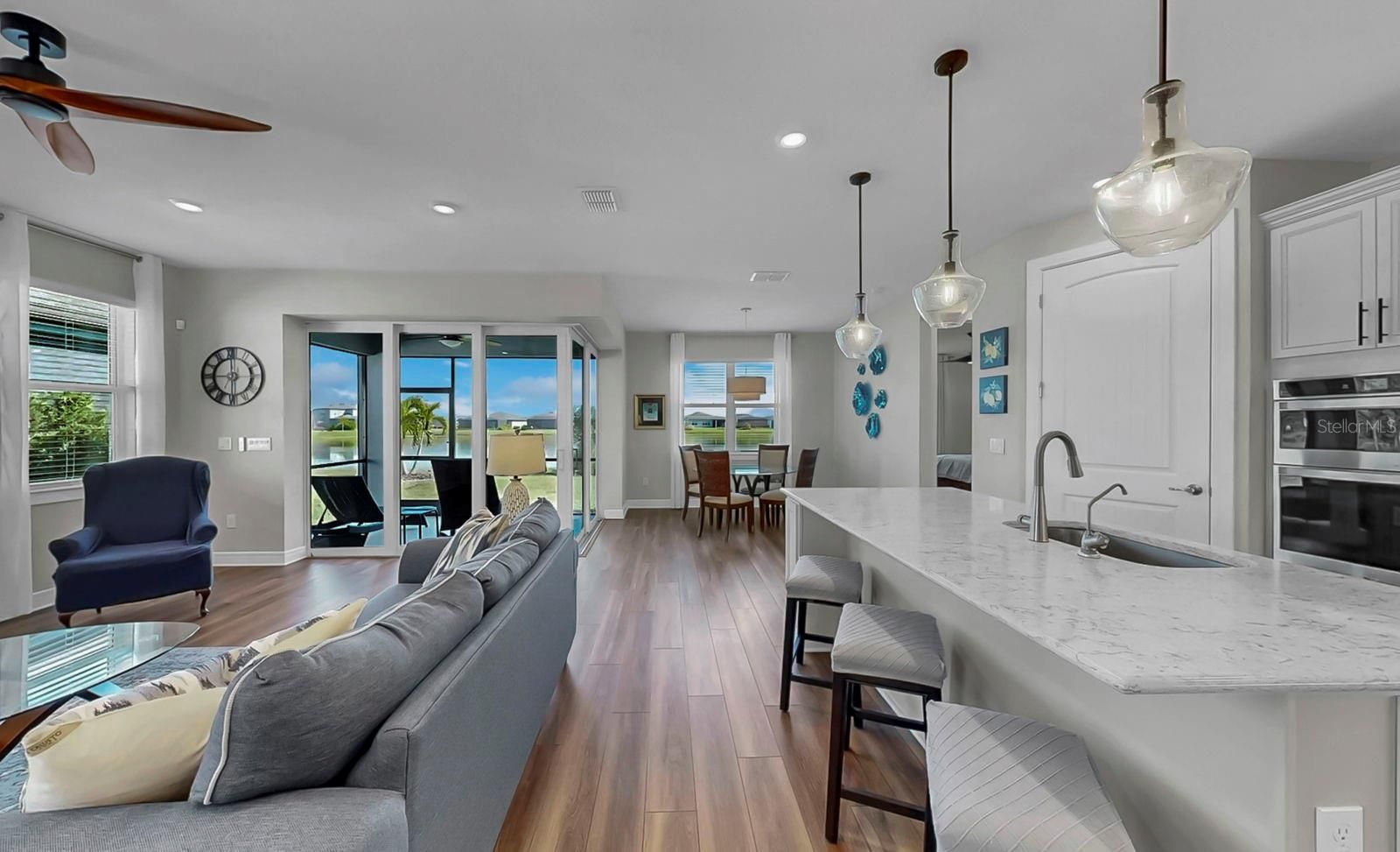 Welcome to Bayview, an exceptional 55+ gated & golf cart community where you can live everyday like you're on vacation the Bayview Way! Discover new friends, become involved in many social activities, enjoy state of the art amenities including a nearly 25,000 sqft amenity center, resort style pool with cabanas and resistance pool, our own restaurant the "Sailfish Grill" with full bar inside & out, flat screen tv's, billiard tables, bandshell area for live entertainment, dock on water with kayak launch, corn toss, bocce ball/pickleball/tennis/shuffleboard courts, hot tub, firepit sitting area, walking trails, dog park, fitness center, garden center, garden club and much more. Arriving at your new water view home the Mystique model, notice the great curb appeal, pavered driveway & entranceway, wide 50 ft lot gives extra space for more privacy, 2 car garage + tandem area for golf cart or hobby enthusiast, garage keypad, rain gutters, coach lights, impact windows throughout, hurricane garage door and front porch sitting area to say hi to your neighbors or just sit and relax! Step inside this beautiful home complete with 1919 heated sqft, 2 bedrooms with flex/office/den area featuring double french doors, 2 full baths and tons of upgrades! Open floorplan is complemented with 8 ft interior doors, volume ceilings, upgraded baseboards, luxury vinyl 7" wide flooring, 2" faux wood blinds, LED downlights in gathering room &more! Gourmet kitchen area features Aristokraft cabinetry, 42" soft close uppers & lowers w/ pullouts on lowers, brushed nickel hardware, hooded exhaust, built-in oven, natural gas, closet pantry, Whirlpool stainless steel appliances, RO water system under kitchen sink, disposal, recessed lighting, quartz countertops, mosaic tile backsplash and pendant lights over large island with sink. Enjoy the spacious gathering/living area with expansive water views, zero corner sliders allow for fresh air & natural light, floor outlet designed for not having cords across floor, electrical port included for hanging tv's & has a ceiling fan. Dining area also allows for fantastic water views. Spacious primary suite offers fantastic water views, ceiling fan, walk-in closet, large primary bath area includes dual sink vanity, Aristokraft soft close cabinetry, brushed nickel hardware, frameless shower glass w/ upgraded tile, grab bar & recessed tile shelf, comfort height oval toilet & tiled flooring with closet linen storage. Our guest suite is well appointed at opposite end of home featuring bay windows, ceiling fan, spacious closet & guest bath features tiled shower with tub, grab bar, Aristokraft soft close cabinetry with brushed nickel hardware. Flex room can be used as 3rd bedroom, den, office, whatever you choose, complete w/ french doors & ceiling fan. Spacious indoor laundry features dryer which is gas or electric as well as extra "alcove" area for extra space or storage. Enjoy expansive water views as you relax on your screened in lanai w/ ceiling fan, LED hatlights, flood light out back & hurricane shutters for added peace of mind & security. Community has a CDD included in tax bill of 1497.00 per year, HOA only 385.00 monthly (433.00 in January) includes, shrubs, lawn, trimming, reclaimed water for irrigation, internet & cable, private roads, guard at gate, virtual gate after hours. The Sailfish Grill is 410.00 per year which you get to spend each year that amount free. Call for your private viewing of this magnificent home!