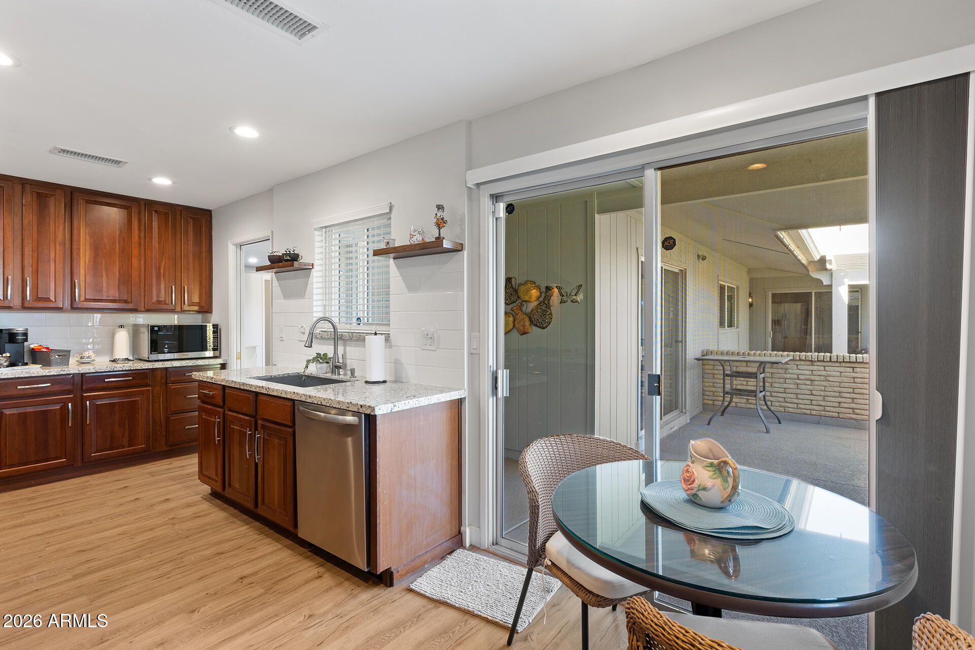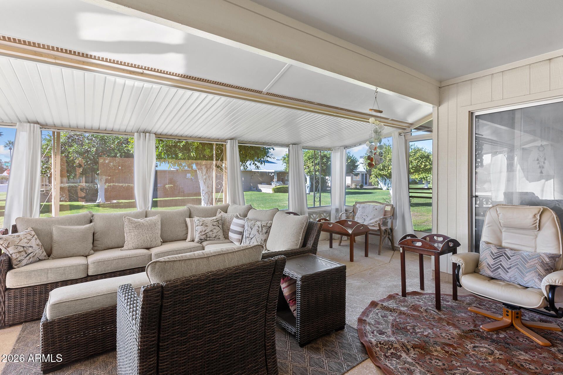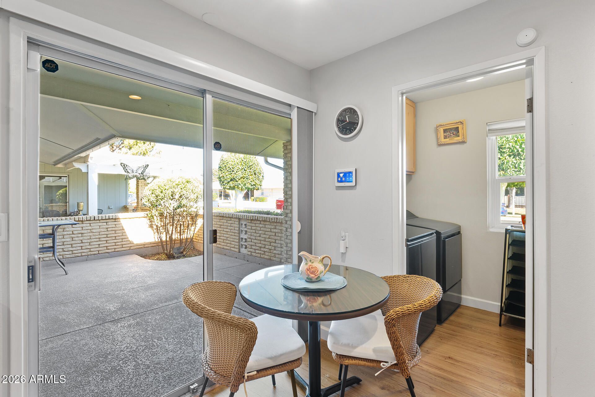 Welcome to this fully remodeled 2-bedroom, 1-bath home offering 1,471 sq ft of stylish, comfortable living on a desirable corner lot. Thoughtfully updated throughout, this home features luxurious vinyl flooring, energy-efficient dual-pane windows, a newer AC (only 3 years old), and a brand-new washer and dryer for added peace of mind. The renovated kitchen is both functional and beautiful, showcasing granite countertops, spacious cabinetry, a gas range, a modern, stylish vent hood, and stainless steel appliances—perfect for everyday cooking and entertaining. The updated bathroom features a beautiful vanity and quality finishes that elevate the space. One of the home's standout features is the huge Arizona room, ideal for enjoying Arizona's glorious weather, relaxing year-round, or creating a versatile bonus living space. Located in Sun City, residents enjoy access to exceptional recreation centers, amenities, clubs, and activities, making this home an excellent opportunity to embrace an active, vibrant lifestyle.