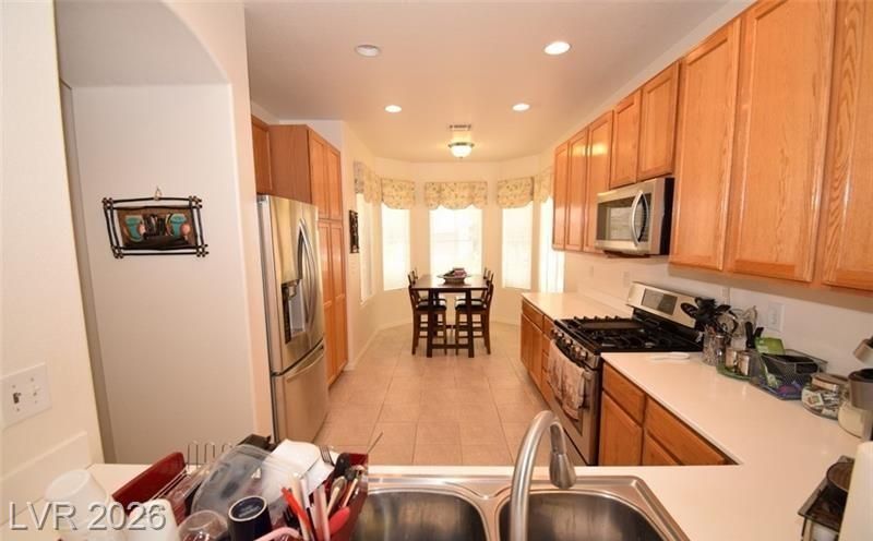 Located in Summerlin community of Siena, a premier 55+ guard -gated community. Open floorplan, with tile flooring in living room and kitchen/ dining and upgraded wood floor in both bedroom. Solid kitchen countertop, custom cabinets, almost new appliances. Check out the big and extended covered patio. Bay window at the dining area and the master bedroom. A must see!