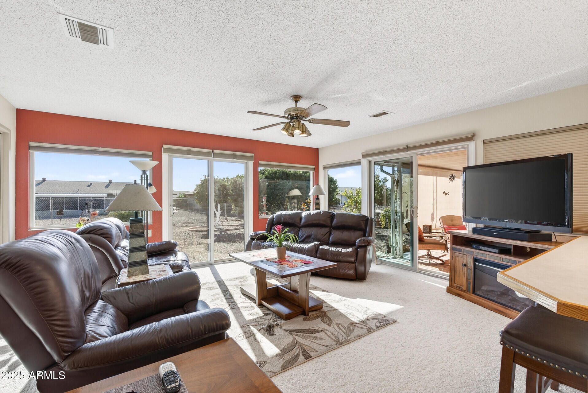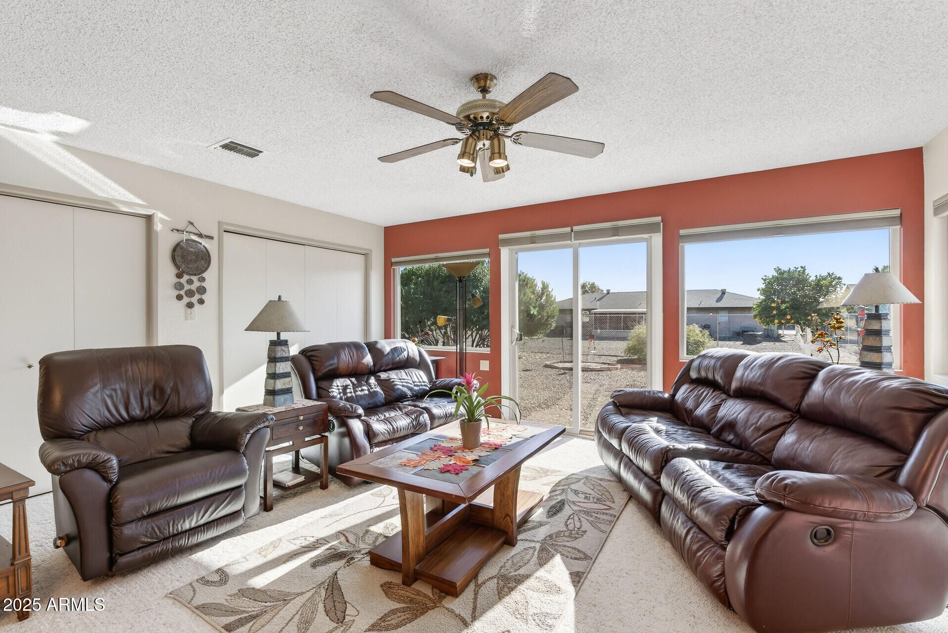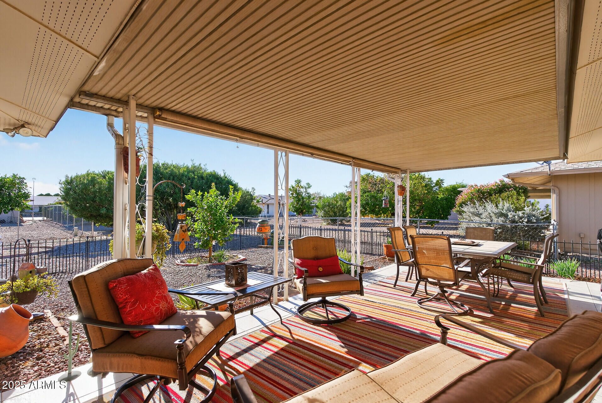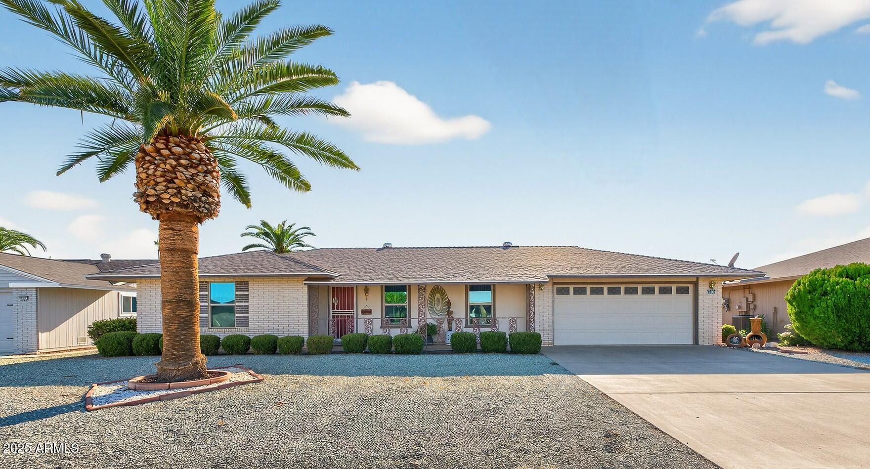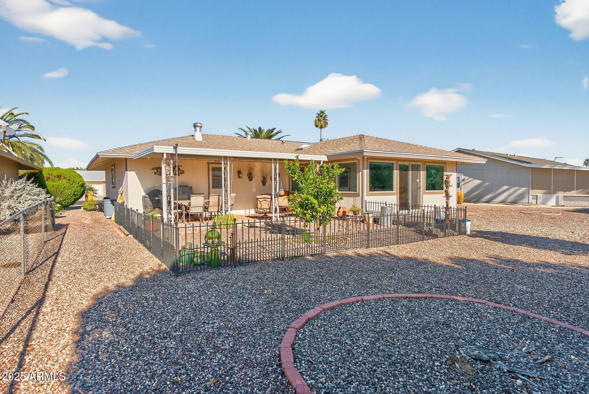 GREAT LOCATION AND SENSATIONALLY MAINTAINED! This Sun City Gem is sure to check a lot of boxes! New HVAC system in July of 2025, New windows and sliding glass doors throughout in 2023, H20 replaced in 2020, Roof replaced in 2009. The kitchen is open to the added family/AZ room with an eat-up peninsula, stainless steel appliance suite with a Samsung French Door fridge. The primary suite is spacious with an ensuite bath featuring an enclosed walk-in shower. The secondary bedroom is HUGE and the guest bath has a shower/tub combo. The AZ/Family room addition has a wall of storage cabinets. Ceiling fans and honeycombed shades throughout. 2 Car EXTENED garage is 25' deep with a newer Samsung Front load washer, utility sink and dryer set plus lots of additional storage cabinets. Large 8904 sqft lot with plenty of room to add a pool. Extended covered back patio looks out to the back yard featuring mature desert landscape and an orange and lemon tree. The W/D, Fridge, Counter top microwave and BBQ (not the smoker) are all included in the sale. Low Taxes and NO HOA fee. This clean, move-in ready is ideally located close to shopping, restaurants, entertainment, hospitals, rec centers and golf courses, yet situated in quite neighborhood. Sun City has so much to offer with over 100 chartered clubs, eight golf courses, and seven recreation centers, pools, countless opportunities for social engagement and physical activity. The warm, sunny climate allows for year-round outdoor living!