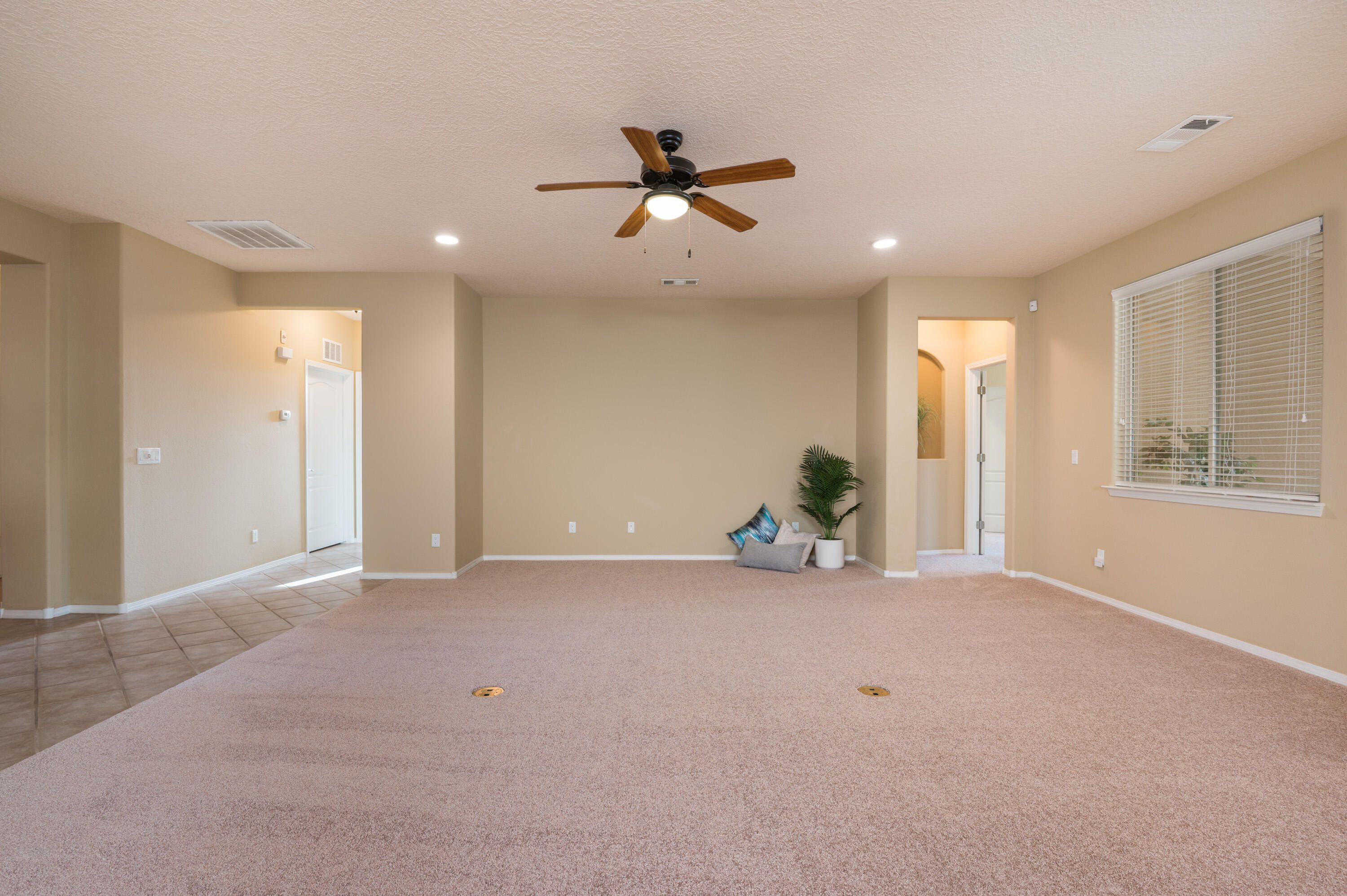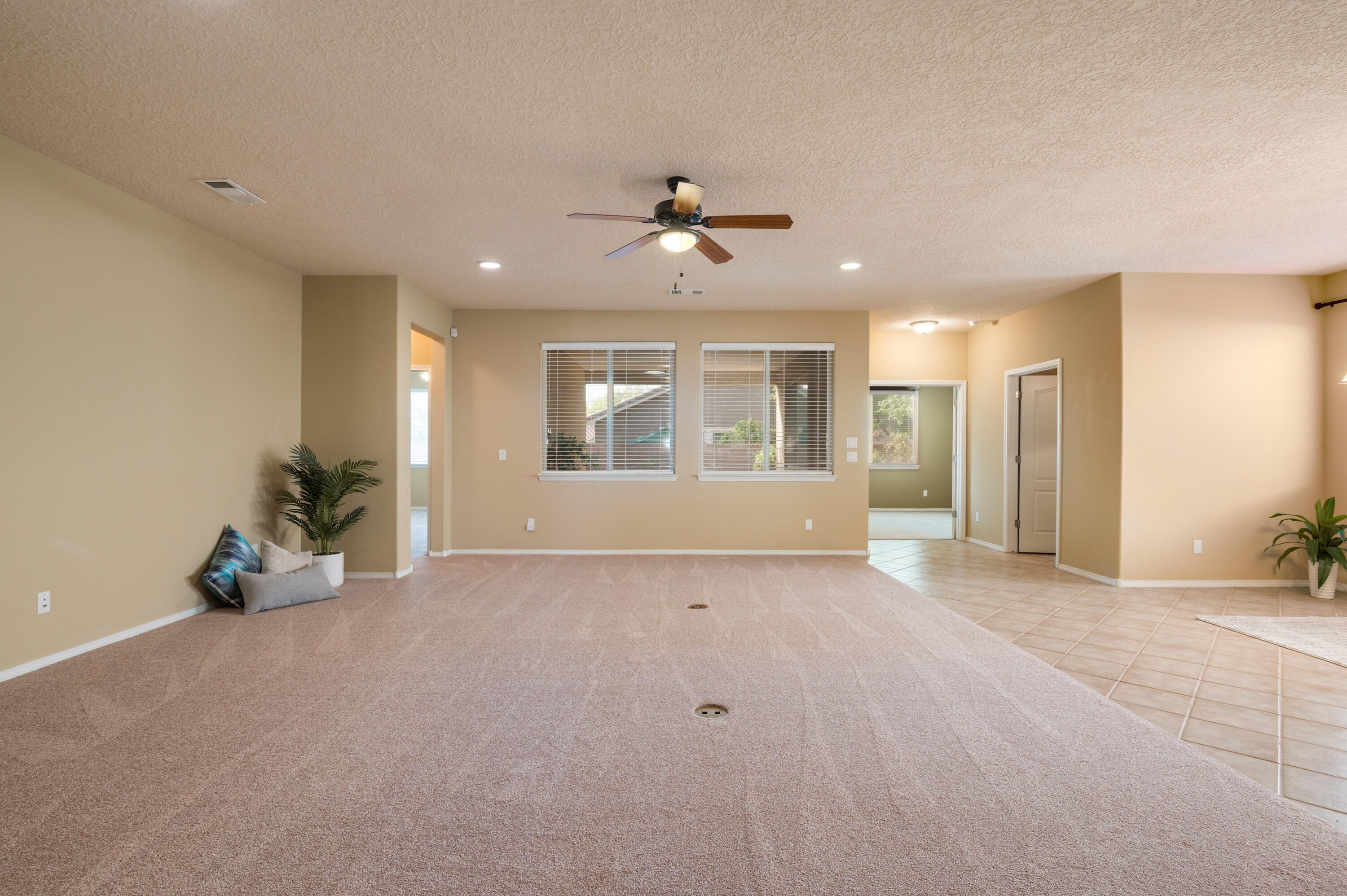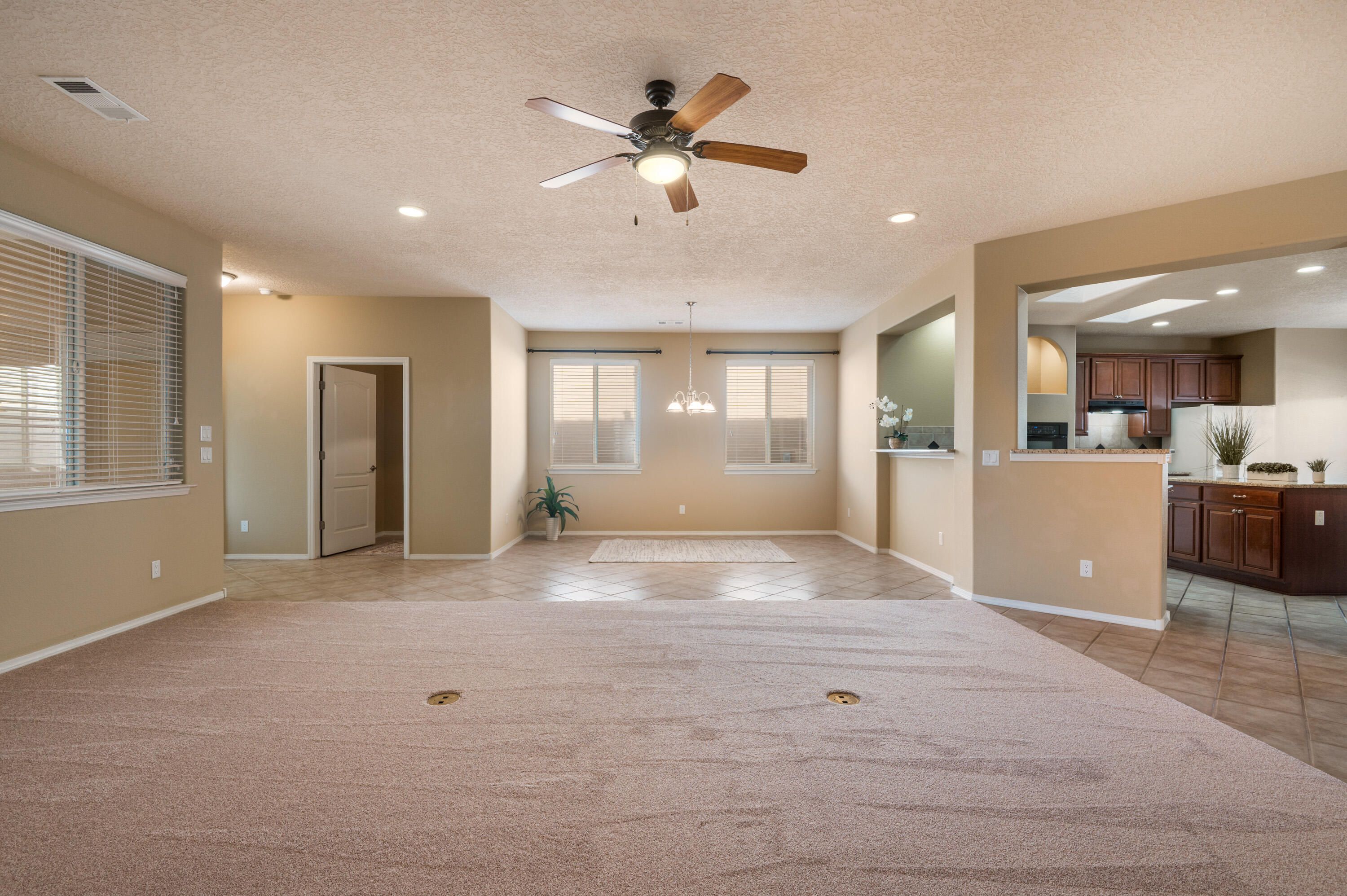 Welcome home to this stunning & gracious single story residence, located in the desirable and beautiful Del Webb gated community at Alegria! Exquisite setting, with access to walking trails, the Bosque & Sandia Mountains as the back drop! Enjoy the numerous amenities: 2 pools, club house, fitness room & more! Discover an open & spacious floor plan with light filled rooms! Deluxe kitchen offers abundance of cabinetry, center island, granite counter tops, pantry and breakfast nook! NEW carpet Aug 2025, freshly paint in some rooms & new front landscaping! French doors open to the generously sized study with handsome built-in cabinets! Professionally deigned private backyard with moss rock, mature plantings, covered & open patios! Solar owned!Separated master retreat...MORE!