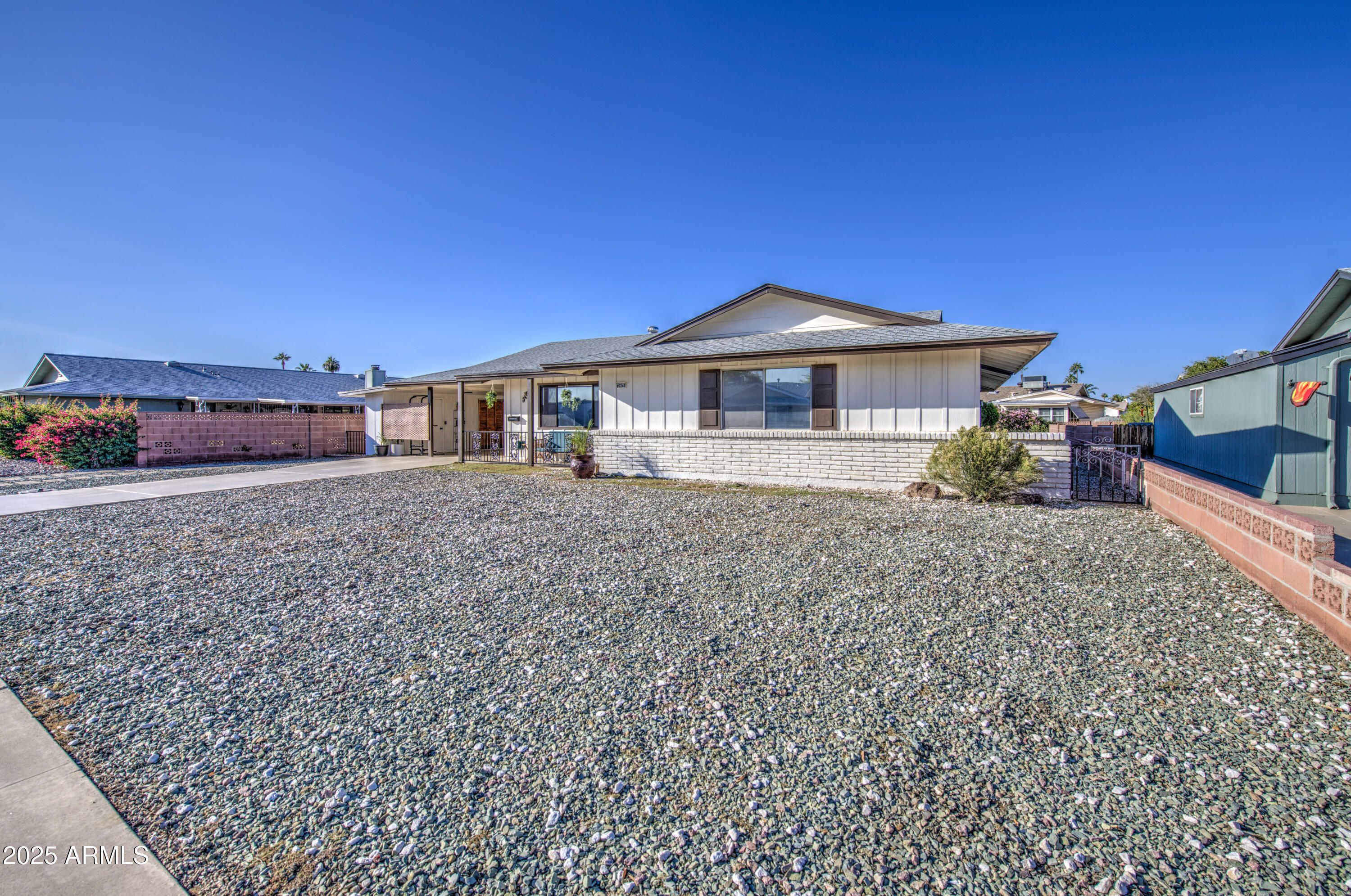 What a bright, cheery deceptively large home in beautiful Sun City! North/South exposure! Great curb appeal and attractive landscaping. A sunny open floor plan with spacious living room, a large separate family room and formal dining room. Good sized bedrooms, both with ceiling fans. The kitchen offers tile countertops, plenty of cabinet and storage space with a cozy breakfast bar. Huge fenced backyard with covered patio, producing citrus trees and tons of room to relax and entertain. Close to golf, pickleball, swimming pools, rec centers, shopping, restaurants, medical facilities & highways. Updates include: Newer roof, newer AC, replaced sewer lines, new appliances, new paint, new light fixtures and faucets, motion activated outdoor lighting, etc...Don't miss this immaculate home! Concord Highlights " Southern Facing " Loads of Storage " Fully Fenced Backyard " Newer Roof " Newer AC " All Sewer Lines Recently Replaced " Brand New SS Appliances " New Paint " New Lights " New Faucet Fixtures " Two Large Carport Storage Areas " Retractable Ladder into the attic " Wide Backyard Gate " Motion Detecting Security Lights in front, back and carport " Two pools, spa, golf, mini golf, pickleball and tennis are all less than 5 min away, as well as all conveniences. " Can be left furnished