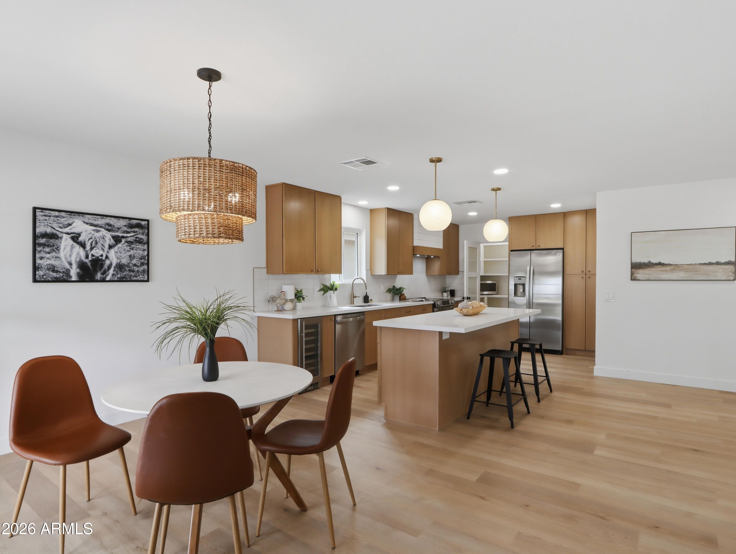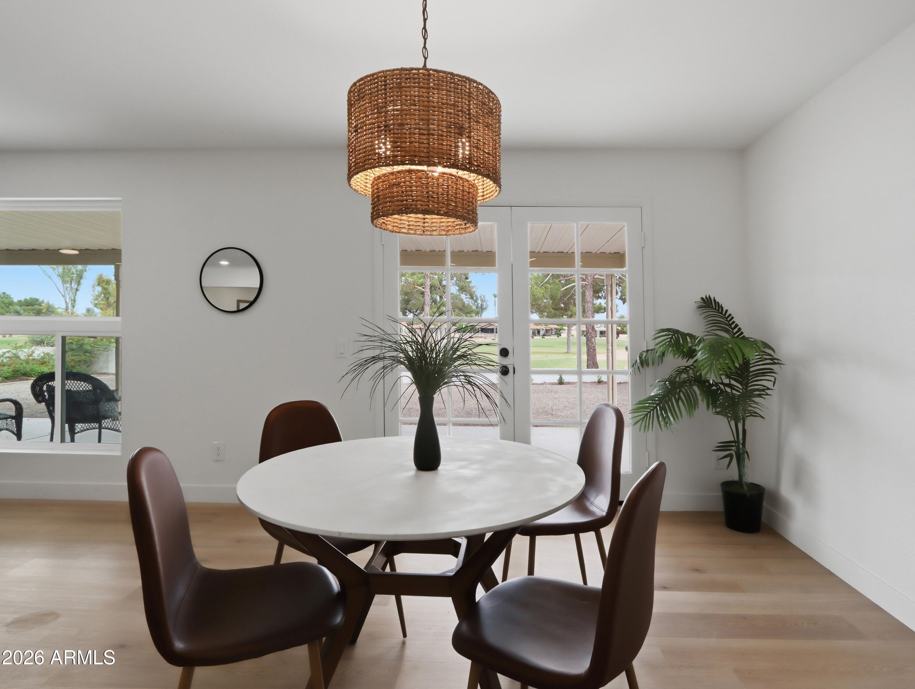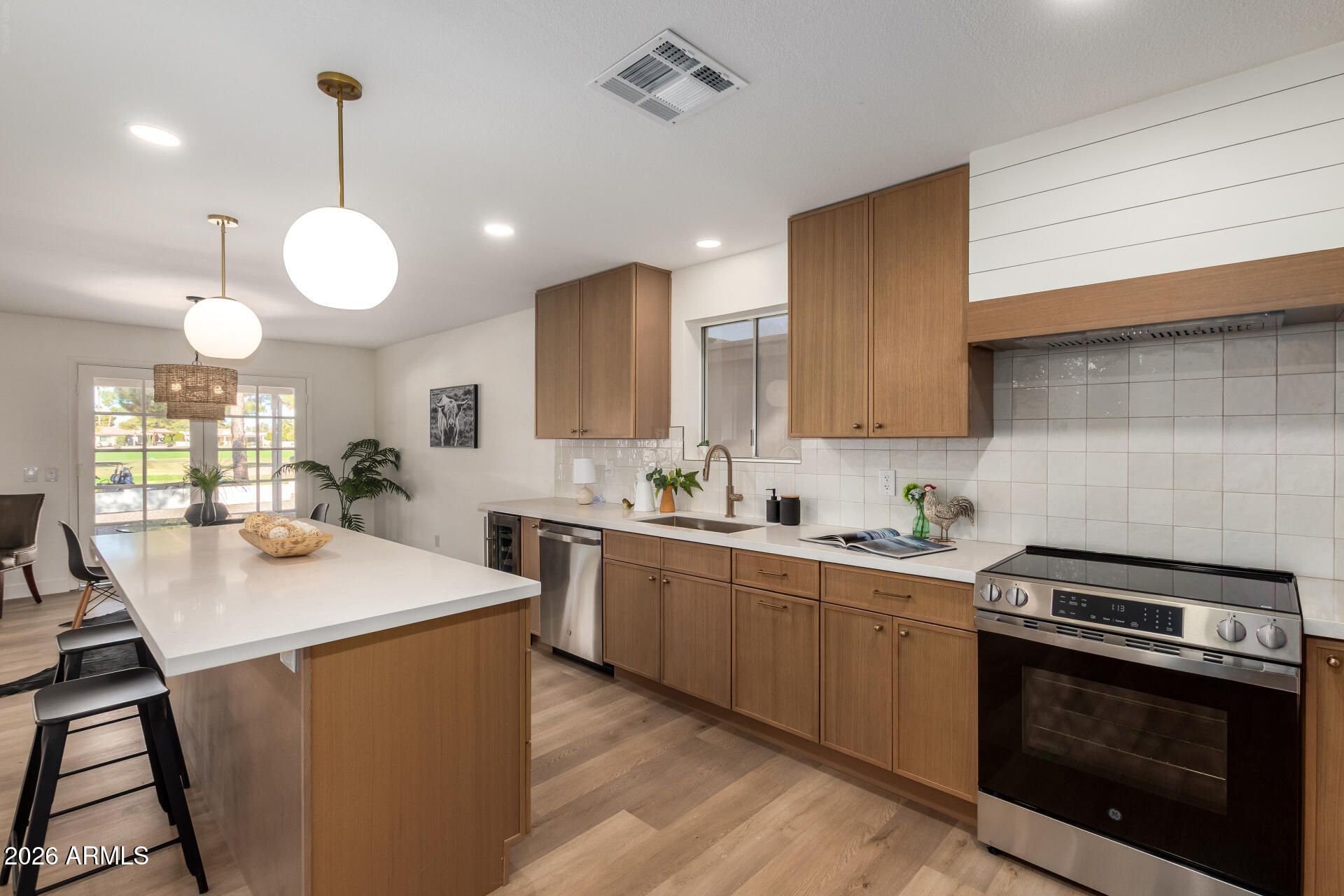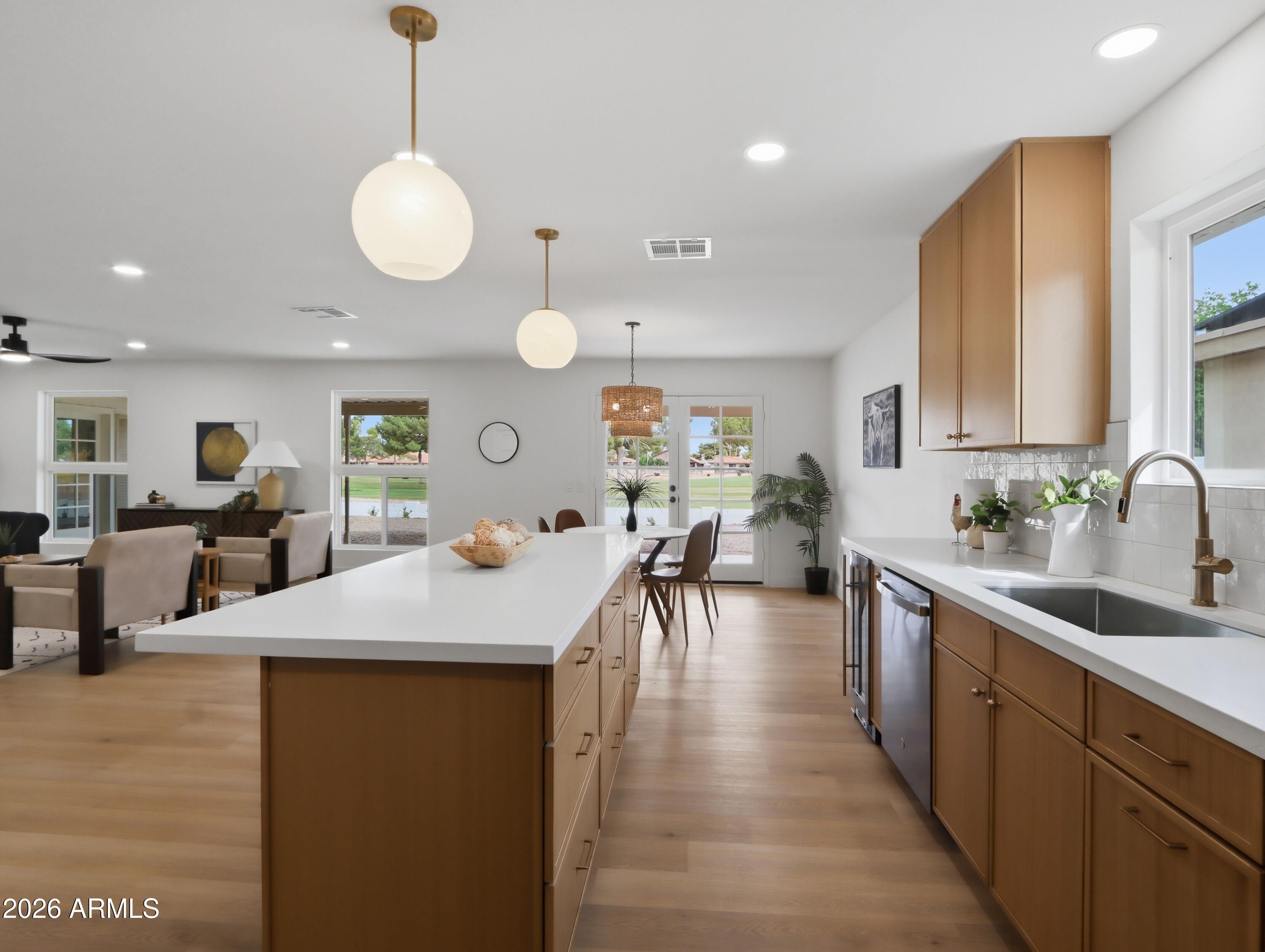 Stylishly updated Sun Lakes golf course home with sweeping fairway views, set along the 9th tee box. This single-level 3-bedroom, 2-bath residence offers an open layout designed for easy everyday living and effortless entertaining. The well-appointed kitchen features quartz countertops, stainless steel appliances, a spacious walk-in pantry, a built-in wine fridge, and updated windows that enhance natural light throughout the home. The primary suite enjoys serene golf course views with direct patio access, while two additional bedrooms offer flexibility for guests, hobbies, or a dedicated home office. The expansive patio overlooks the fairway, offering a front-row setting to enjoy the golf course views. Experience resort-style living with amenities that include golf, tennis, pickleball, bocce, pools, a full fitness center, restaurants and a wide variety of social clubs and activities.