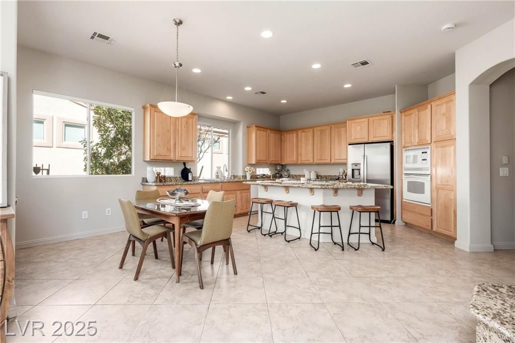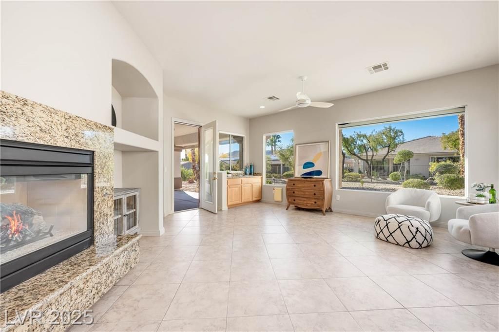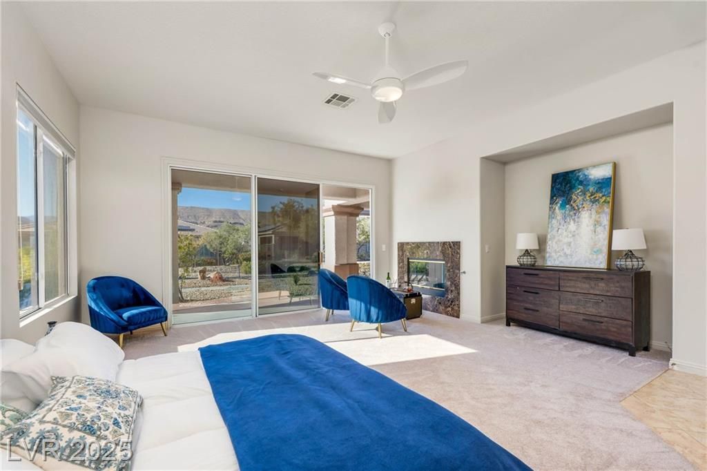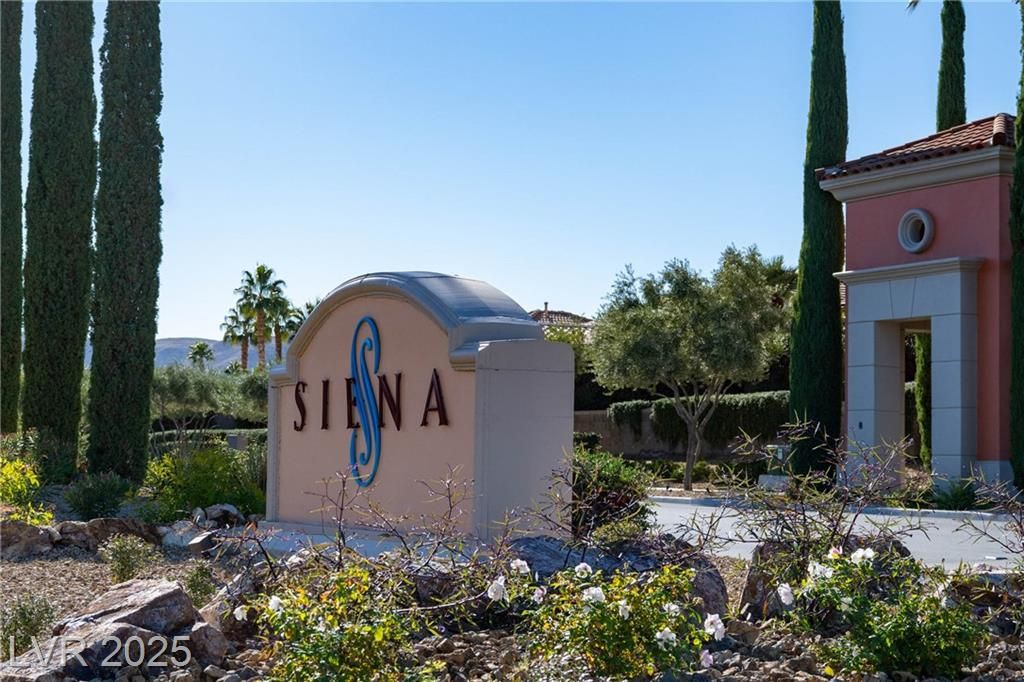 Nestled in the corner at the end of a highly desired cul-de-sac, you'll find this sought-after Model 8110 on over 1/4 of an acre lot. Stunning curb appeal leading up the XL driveway framed beautifully by custom desertscape. Enter the private courtyard through double entry doors greeted by serene mountain views and a bright open great room with designated dining area. Head into the spacious kitchen with island seating, walk-in pantry and plenty of cabinet space. Directly off the kitchen is an inviting family room with mountain views, wet bar and fireplace. The elegant and generously sized primary suite has a fireplace, sliding glass doors to backyard and more mountain views! Upgraded bathroom with built ins, walk in tub and custom closets. Double room den/office with custom cabinetry and its own entrance. Large Backyard with covered patio overlooking a beautifully landscaped desert garden. Siena is a guard gated premier 55+ community offering a lifestyle for active adults in Las Vegas