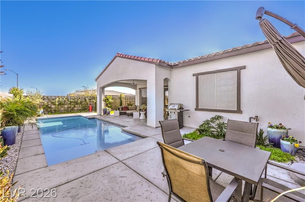 BETTER THAN NEW! Priced below comparable new homes by Woodside Homes in Sunstone - WITHOUT THE WAIT! This 1-year-old POOL home sits on an oversized corner lot with professionally landscaped back and side yards inside gated Estrella at Sunstone and offers over $125,000 in upgrades w/premium finishes and completed outdoor living. Dual sliding doors create seamless indoor/outdoor living with mountain views. Backyard oasis features a sparkling pool, 24’ x 14’ extended covered patio, abundant deck space, and low-maintenance design. Open floorplan with dramatic entry and spacious great room with 12-foot ceilings. Gourmet kitchen includes quartz countertops, island w/breakfast bar, upgraded cabinetry and sink/hardware, stainless appliances, and walk-in pantry. Primary suite w/private backyard access, oversized custom walk-in shower, and walk-in closet. Additional highlights: 25’ deep garage with 8’ tall door for oversized vehicles and additional floor tile to finish off all the common areas!