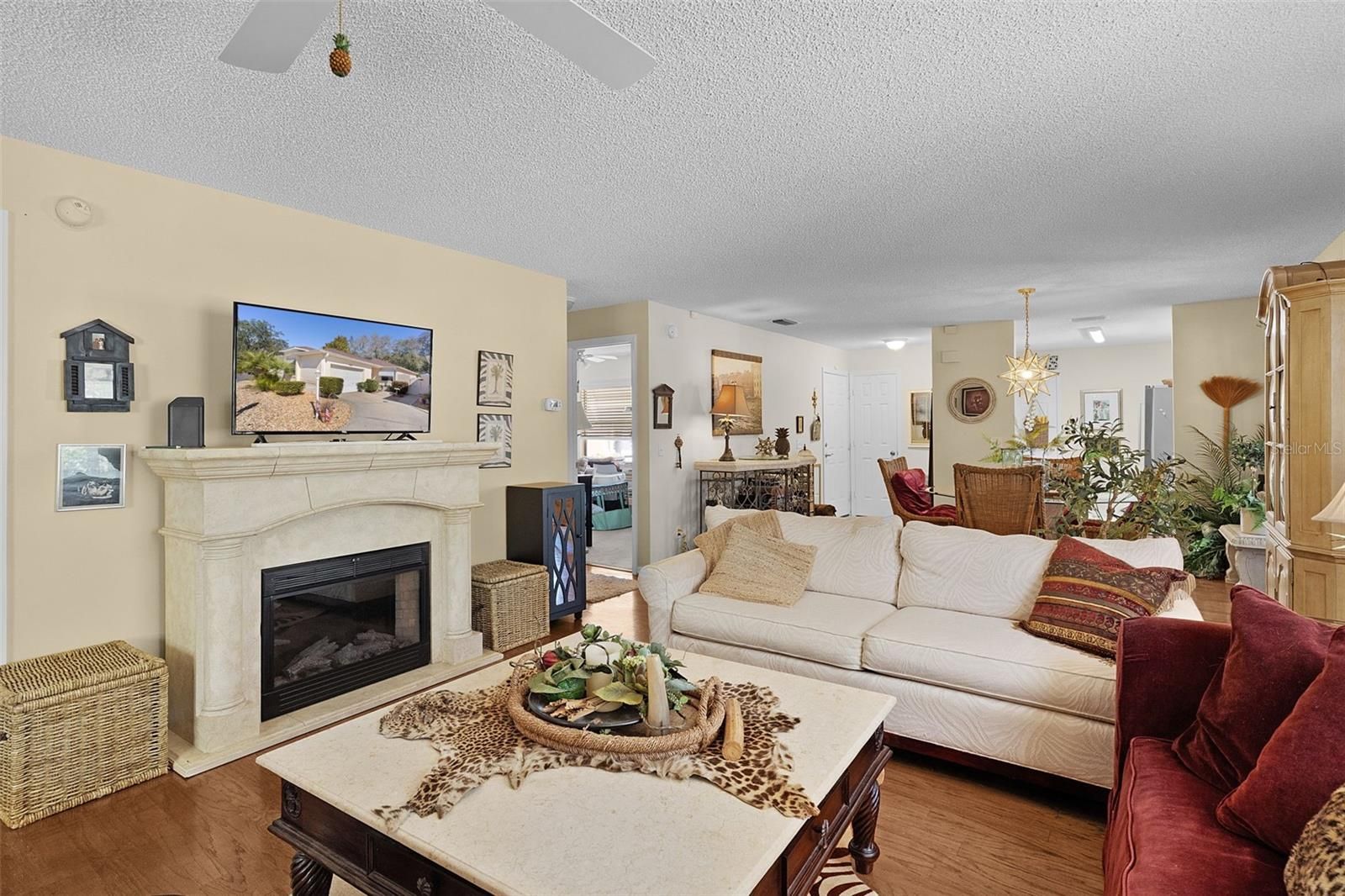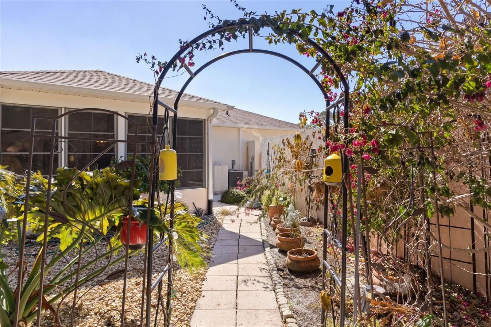 They say location is everything, and this beautifully maintained courtyard villa in The Villages delivers. Ideally located just minutes from Spanish Springs Town Square, this home sits on a desirable corner lot and offers a rare, extra-large yard with two private courtyard areas, framed by lush, mature landscaping—perfect for relaxing or entertaining. The home features 2 bedrooms, 2 bathrooms, plus a den, providing flexible space for guests, a home office, or hobbies. The kitchen is thoughtfully designed with quartz countertops, new appliances, and ample cabinetry. The inviting lanai overlooks the lush courtyard, creating a peaceful retreat for morning coffee or unwinding in the evening. After enjoying the dining, entertainment, and nightlife The Villages is known for, you’ll love coming home to your own private oasis, just minutes from the action. Additional highlights include a NEW ROOF (2024), NO BOND, and a location within 2 miles or less of shopping, restaurants, and entertainment. This villa offers the ideal combination of location, privacy, and lifestyle. Schedule your private showing today!