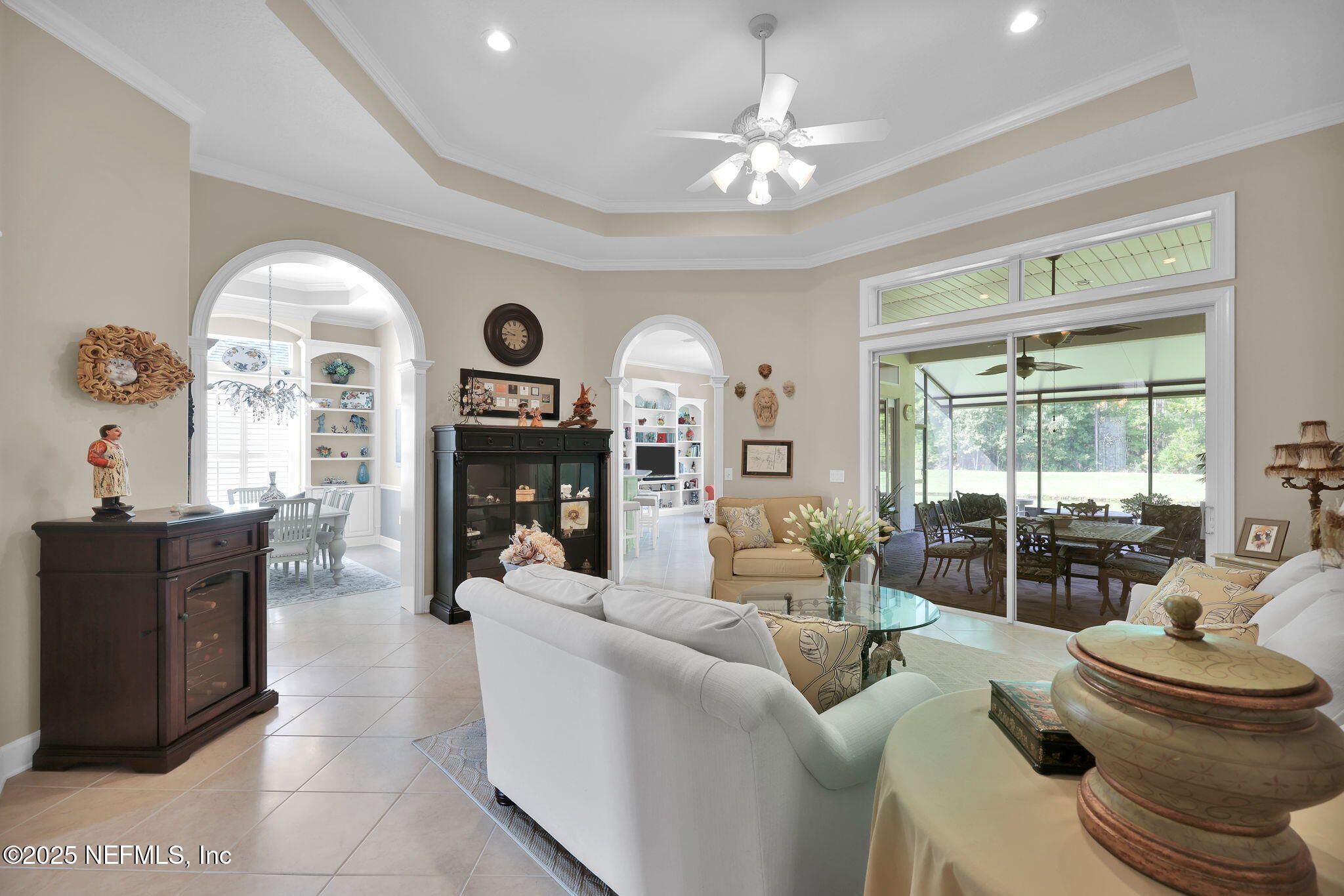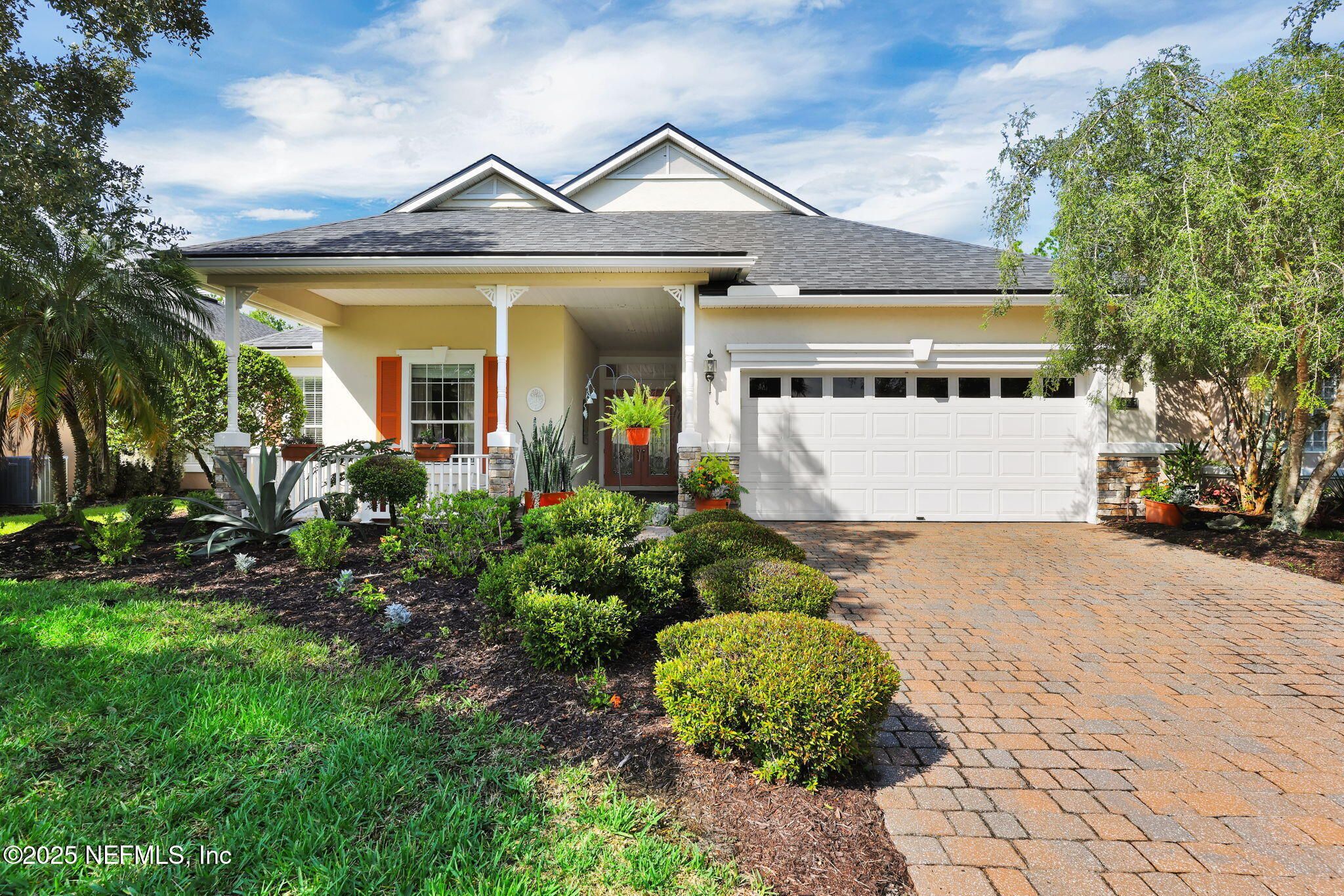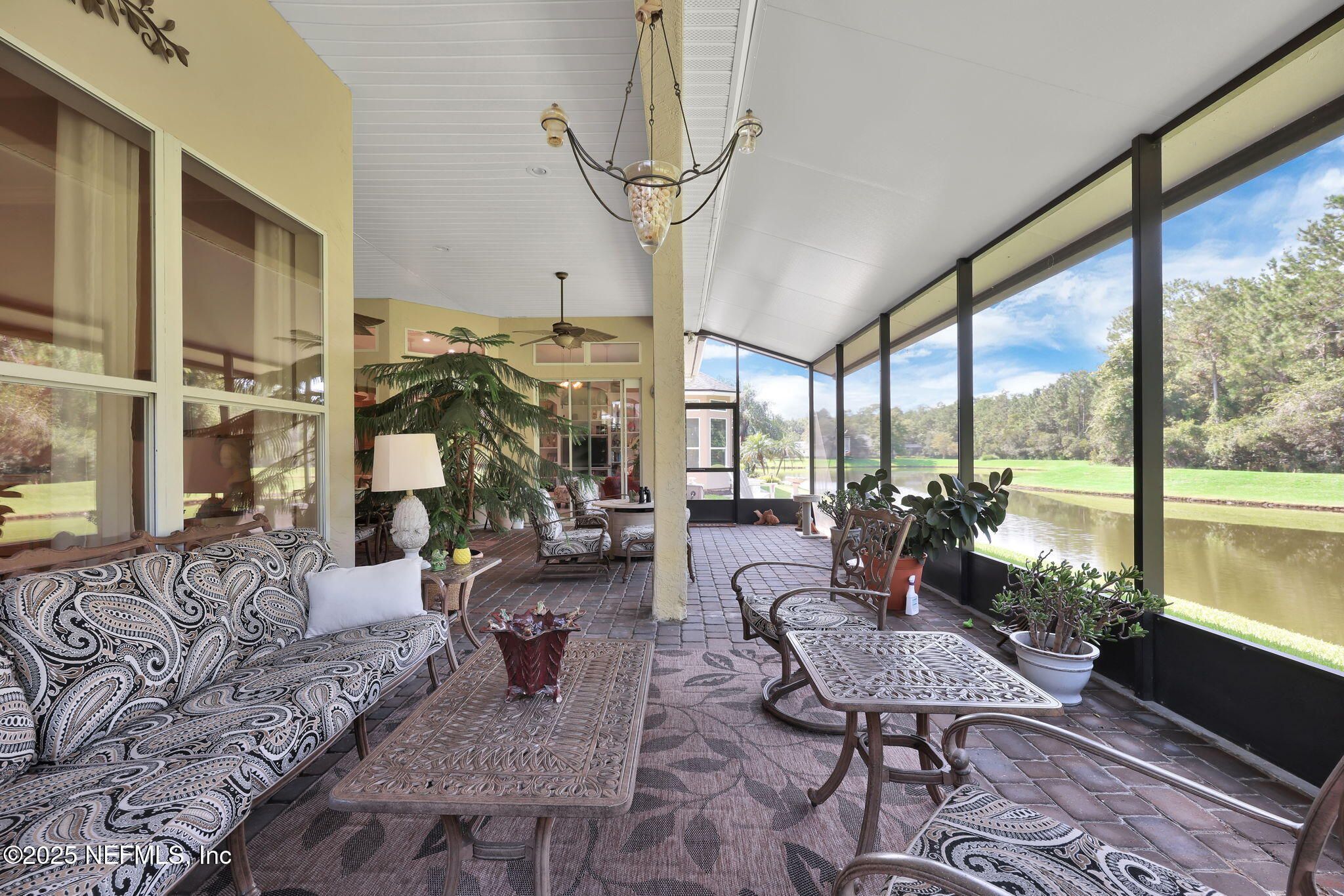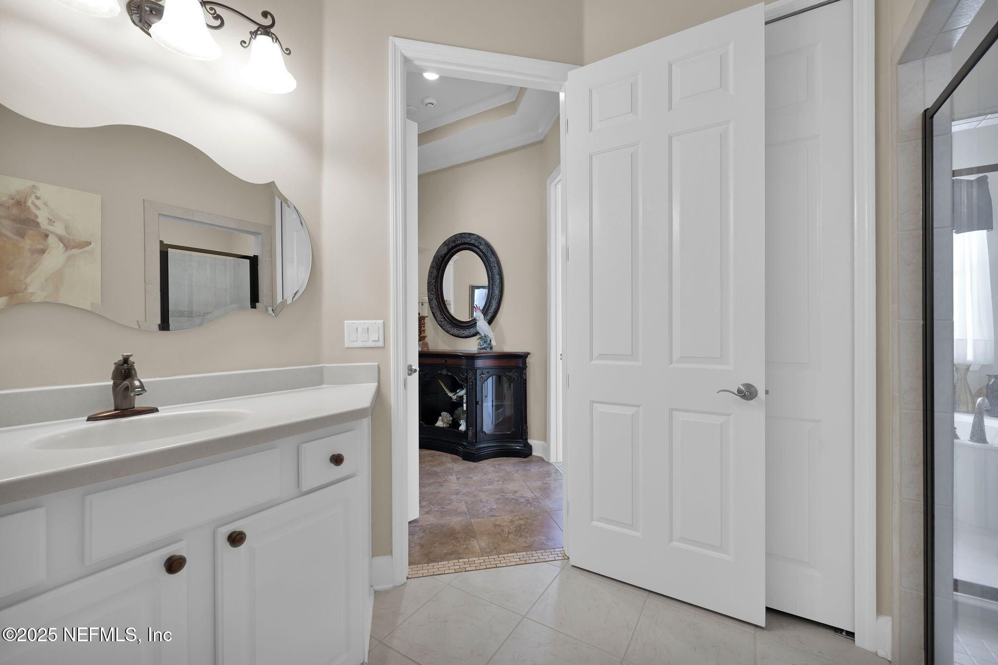 Located in the Cascades at World Golf Village, a premier 55+ gated community, this home offers timeless craftsmanship, thoughtful design, and serene views overlooking a preserved pond. The grand foyer, with 12-foot ceilings and custom casing doorways, leads to open living spaces featuring tile floors, tray ceilings, and expansive windows. An oversized lanai provides the perfect setting for entertaining. The kitchen features double ovens, a custom pantry, and a breakfast nook with a built-in bench, while the den boasts a 10-foot custom bookcase. The owner's suite features two walk-in closets and a distinctive dual-bath layout, complete with two private toilets, vanities, a soaking tub, and a separate shower. Additional highlights include formal dining with built-ins, a laundry room with a sink, an EV-ready garage outlet, and extensive trim throughout. Enjoy an active lifestyle in one of St. Johns County's most sought-after 55+ communities.