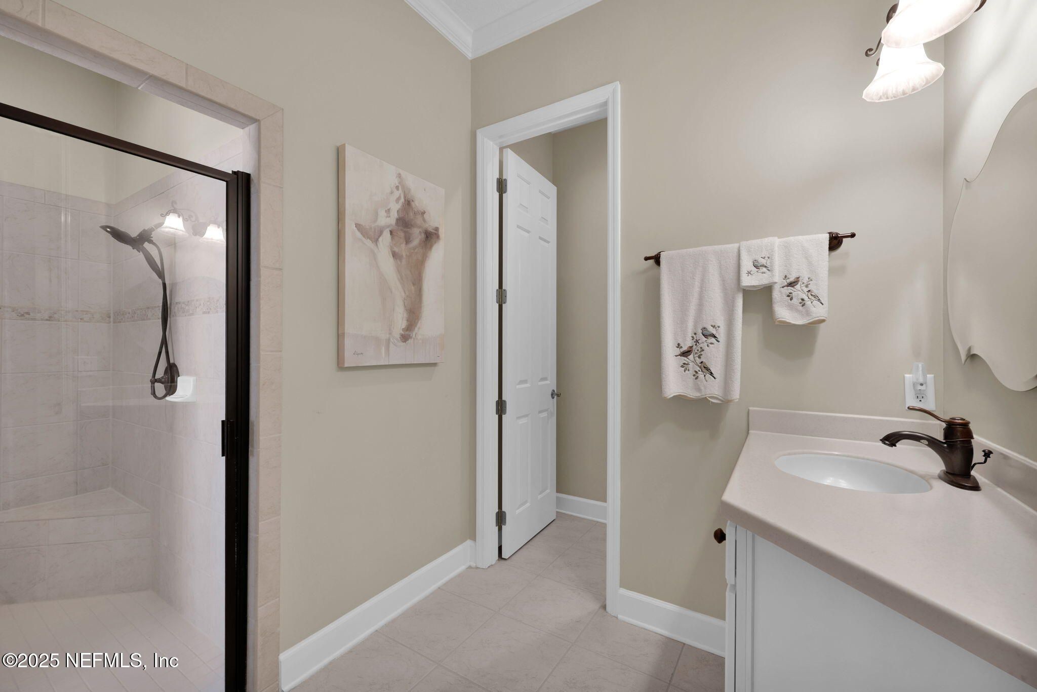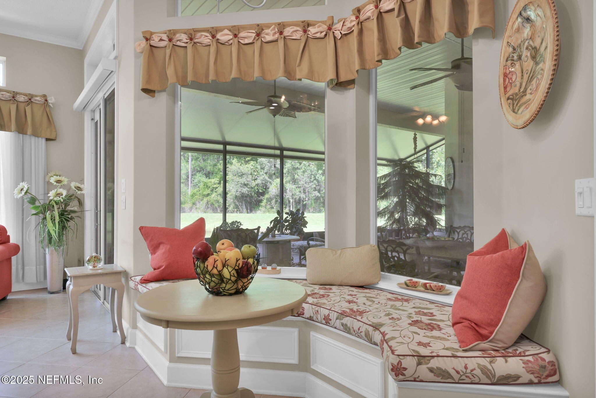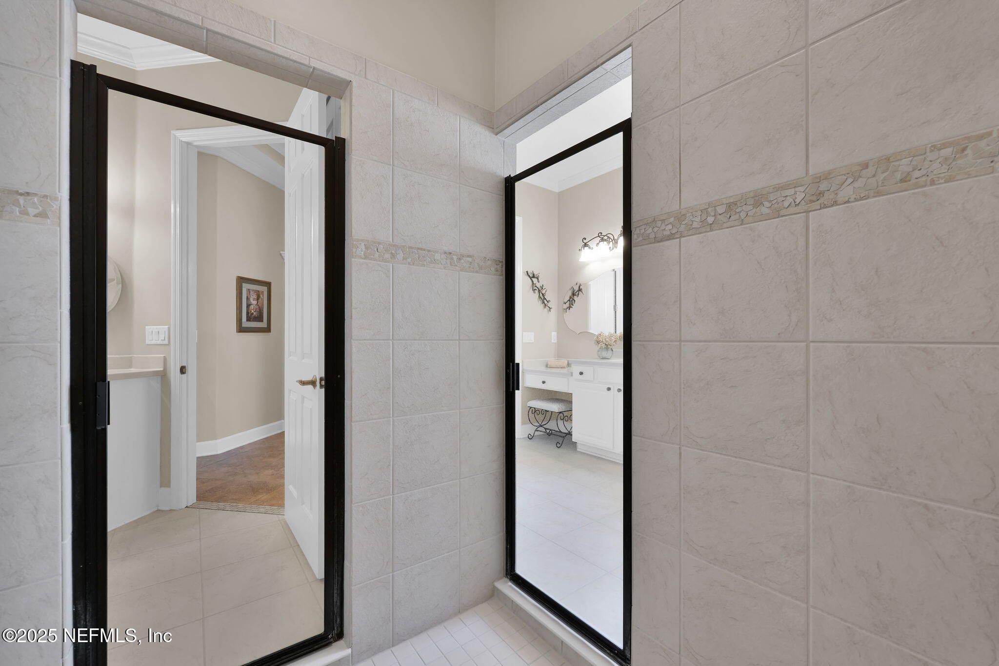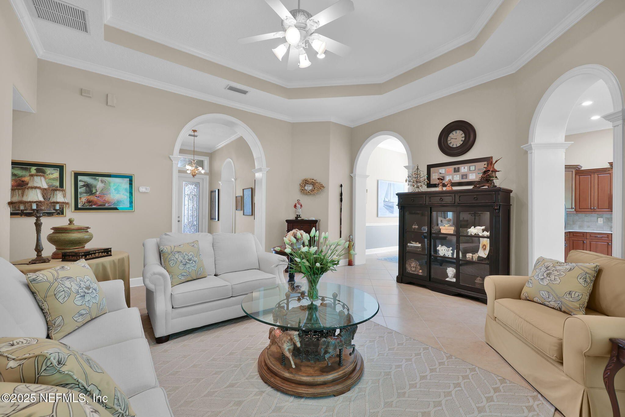 Located in the Cascades at World Golf Village, a premier 55+ gated community, this home offers timeless craftsmanship, thoughtful design, and serene views overlooking a preserved pond. The grand foyer, with 12-foot ceilings and custom casing doorways, leads to open living spaces featuring tile floors, tray ceilings, and expansive windows. An oversized lanai provides the perfect setting for entertaining. The kitchen features double ovens, a custom pantry, and a breakfast nook with a built-in bench, while the den boasts a 10-foot custom bookcase. The owner's suite features two walk-in closets and a distinctive dual-bath layout, complete with two private toilets, vanities, a soaking tub, and a separate shower. Additional highlights include formal dining with built-ins, a laundry room with a sink, an EV-ready garage outlet, and extensive trim throughout. Enjoy an active lifestyle in one of St. Johns County's most sought-after 55+ communities.