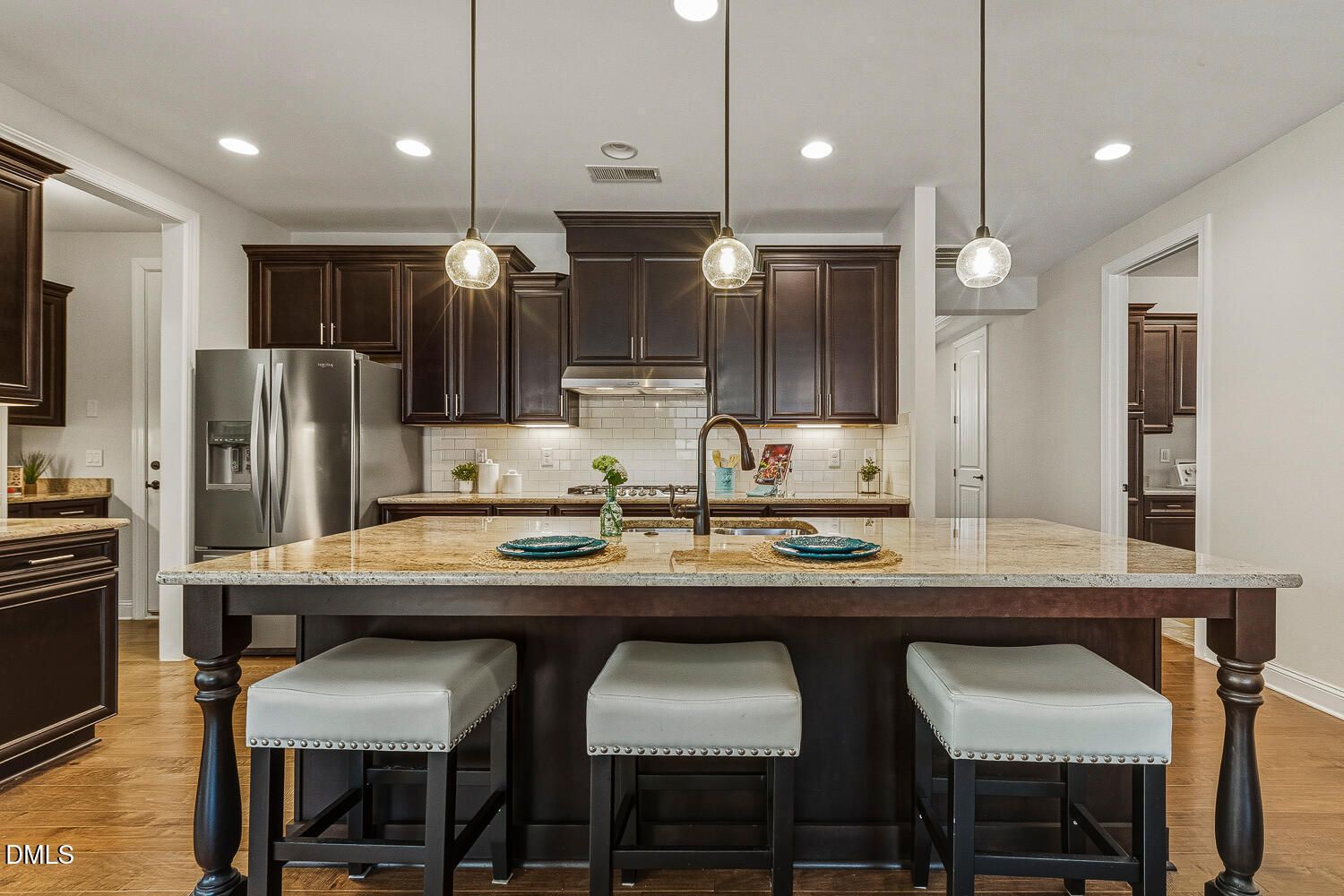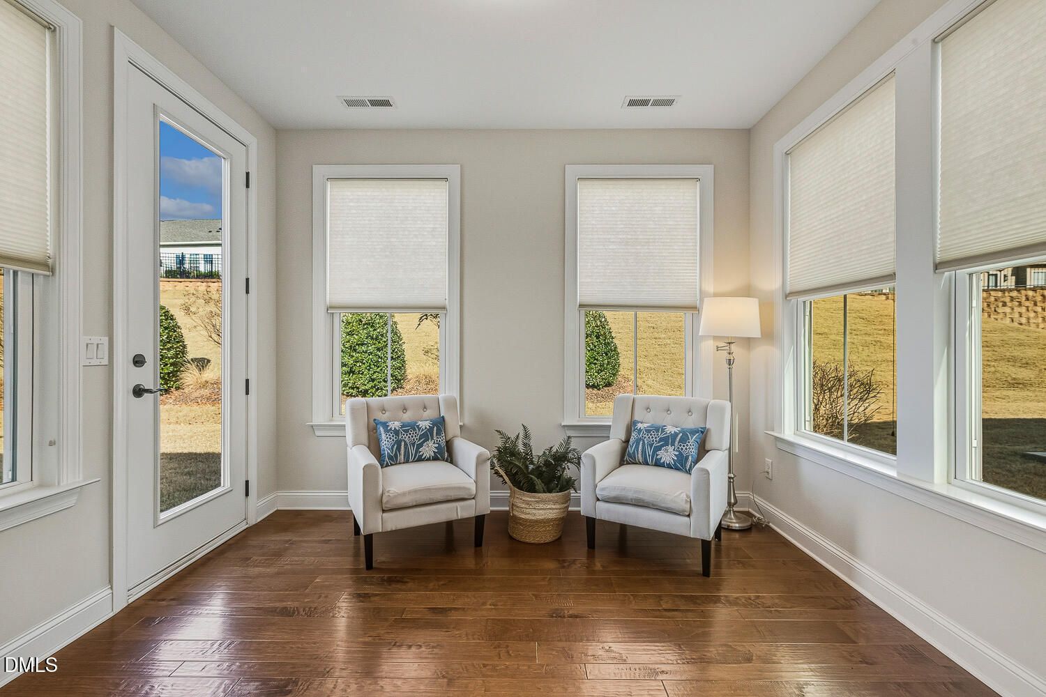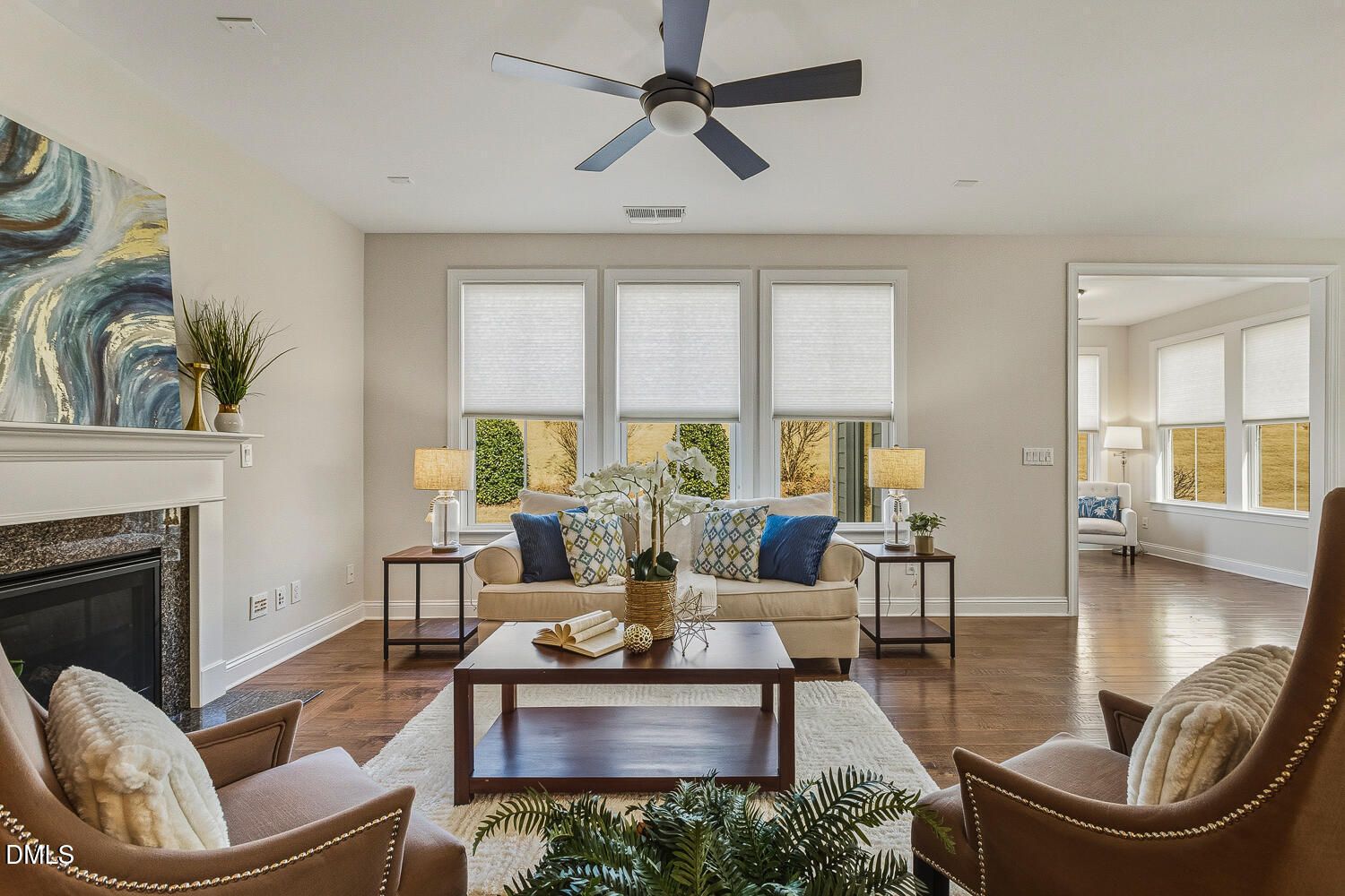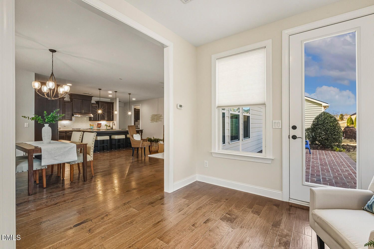Beautiful and meticulous one-level/ranch style home on one of the best streets in the neighborhood! This Melville floorplan features hardwood floors and a gourmet kitchen with stainless appliances, granite counters, center island, soft-close cabinets, tile backsplash, recessed lights, butler's pantry, and walk-in pantry. The family room offers a gas log fireplace, and the dining area and bright sunroom fill the home with natural light. The owner's suite includes a tray ceiling, wall of windows, walk-in closet, laundry access, and a spa bath with double granite vanity, tiled walk-in shower, and water closet, plus a secondary bedroom/flex room ideal for fitness, meditation, or caregiving. A guest bedroom w/ nearby hall bath, home office, and powder room complete the layout. Enjoy the spacious covered front porch or spend time in the private backyard w/ extended brick patio and retractable awning. Located on a cul-de-sac street near a convenient park/trail. This sought after 55+ Active Adult Community includes the award-winning clubhouse with a fitness center, hobby rooms, resort-style pool, tennis, bocce, pickleball, trails, ponds, and parks. Located close to Brier Creek, Southpoint, RDU Airport, and major highways...schedule a visit now!