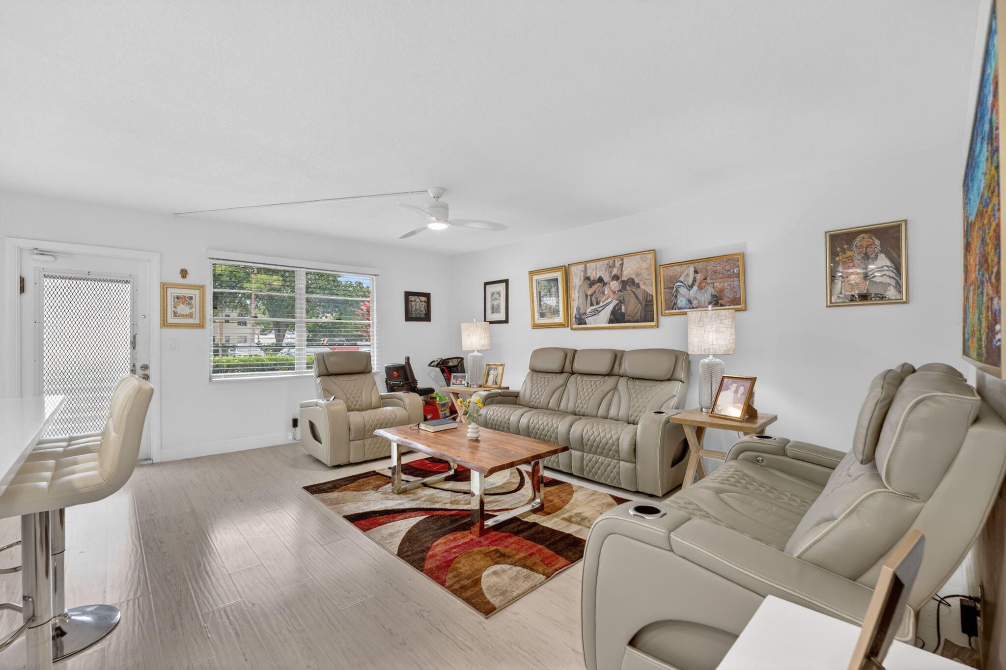 Rarely available, beautifully updated first floor residence in the highly desirable 55+ community of Century Village East! This light & bright home features a stunning renovated kitchen with white shaker cabinetry, quartz countertops, designer backsplash, stainless steel appliances, and elegant gold accents. Enjoy the open-concept layout with a spacious breakfast bar. The updated bathrooms offer modern finishes, sleek vanities, and glass-enclosed showers. Neutral flooring flows seamlessly across the living areas. Relax and unwind in the enclosed patio with tranquil garden views. Century Village East offers resort-style living with a state-of-the-art clubhouse, indoor and outdoor pools, fitness center, theater, tennis, pickleball, courtesy transportation, and endless clubs and activities.