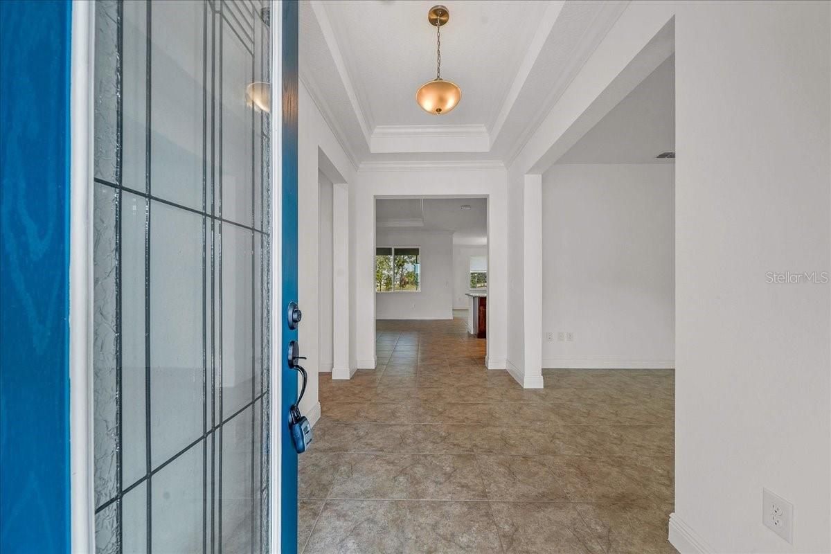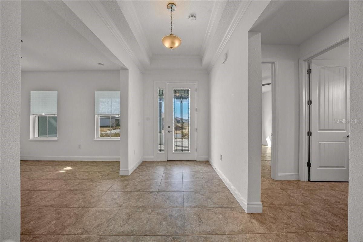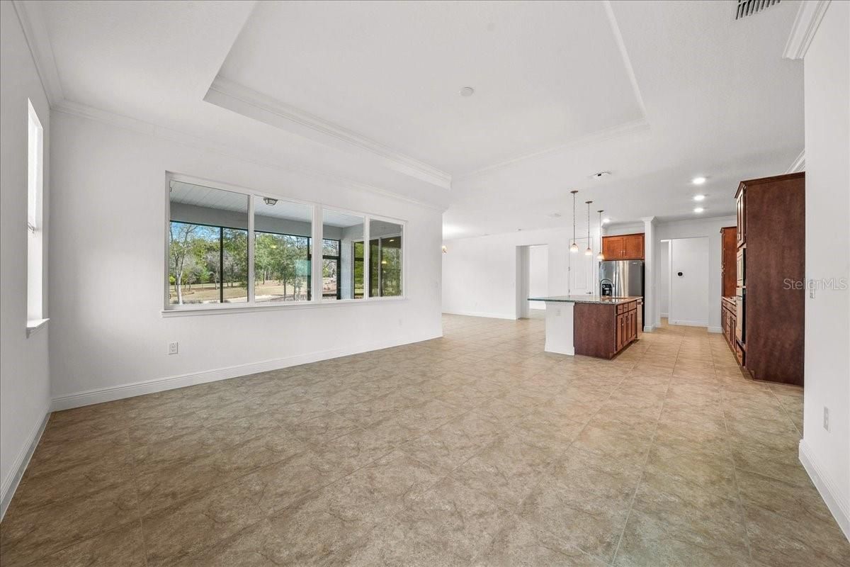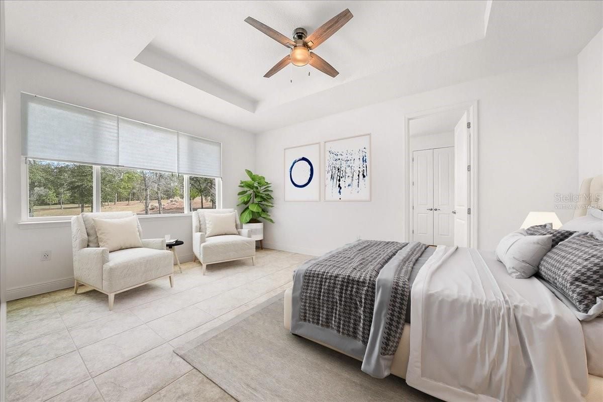 - Ceiling Fan(s), Eat-in Kitchen, High Ceilings, Kitchen/Family Room Combo, Open Floorplan, Main Level Primary, Solid Surface Counters, Split Bedrooms, Thermostat, Tray Ceiling(s), Walk-In Closet(s), Window Treatments