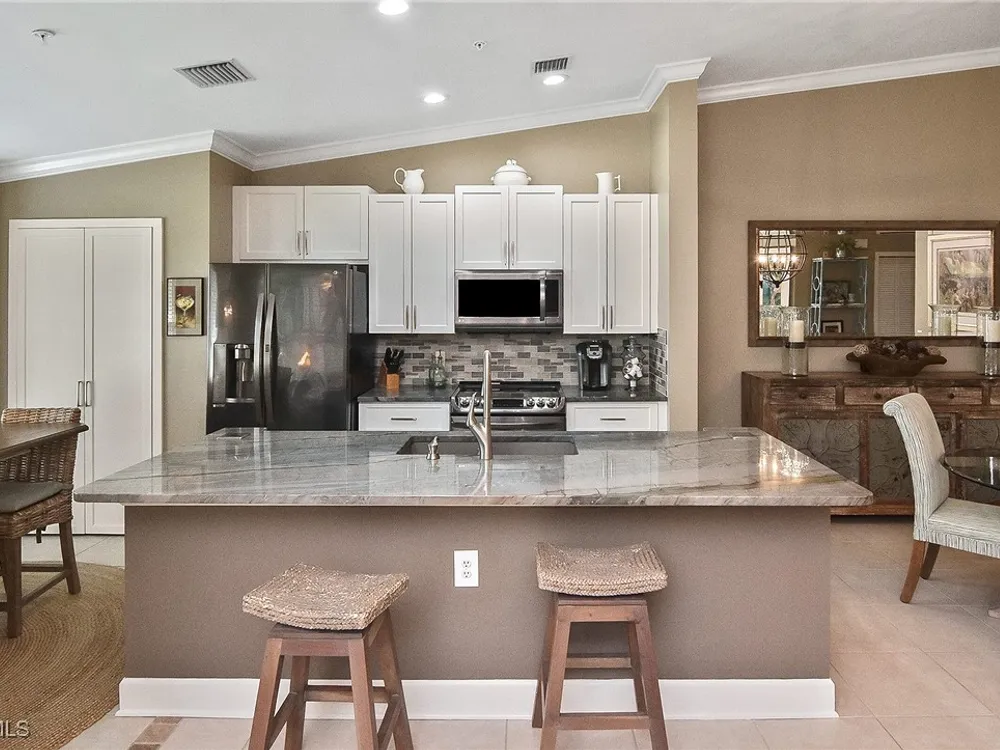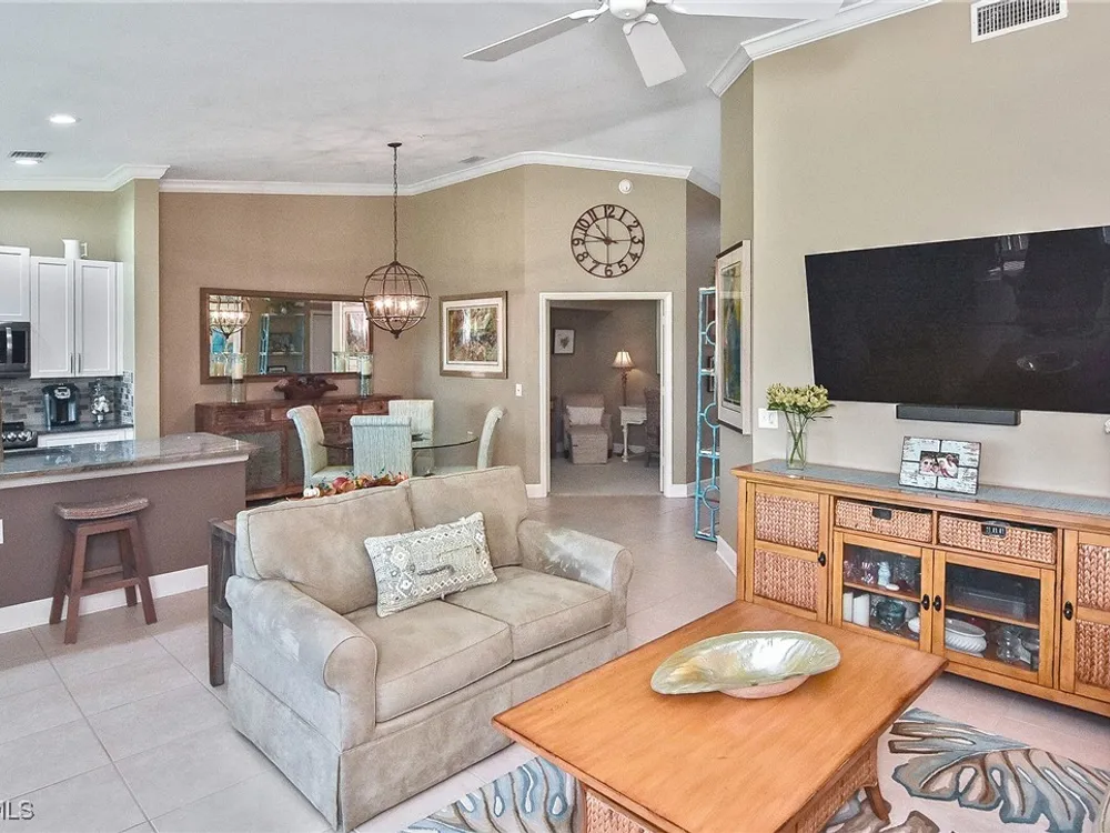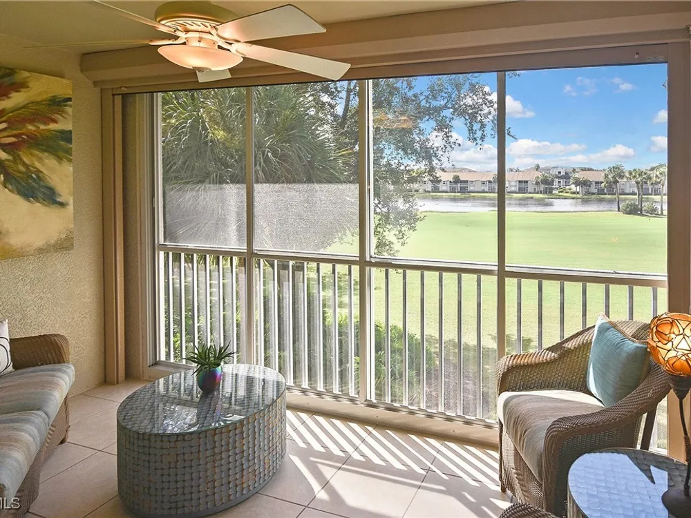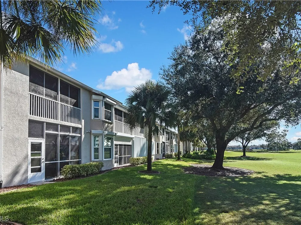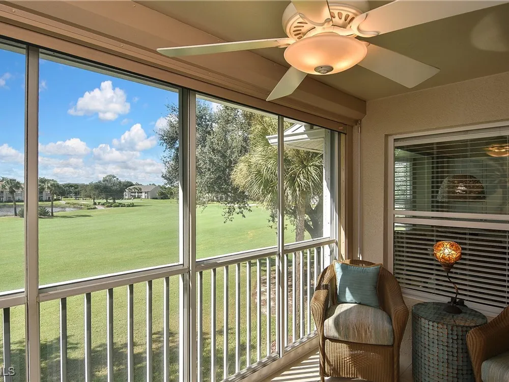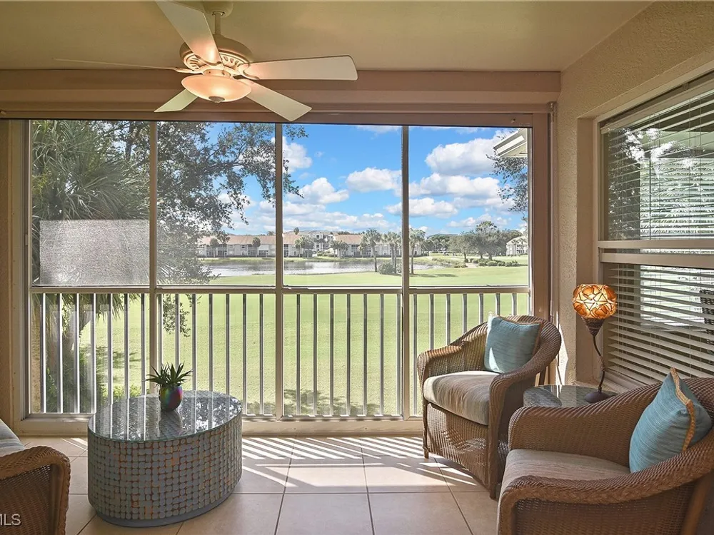 UPDATED AND MOVE IN READY! This beautiful condo definitely checks all the boxes! The sought-after Dogwood floor plan shines with thoughtful renovations and modern upgrades. Enjoy breathtaking lake and golf course views overlooking the 16th hole of Royal with southern exposure with sliding doors that pocket. Featuring 2 bedroom+ den 2 bath, and private garage, this home blends style with comfort. The kitchen impresses with granite countertops, sleek backsplash, crisp white cabinetry, LED canned lights, updated fixtures and newer LG appliances (2019). Both bathrooms offer step in showers tiled to ceiling, frameless glass doors and beautiful vanities while tile seamlessly flows throughout main living space. You will have peace of mind knowing your home is equipped with Storm Smart electric screen on lanai and 3 impact glass windows in kitchen. MORE HIGHLIGHTS include brand new washer & dryer in 2025, both AC unit and water heater were replaced late 2021, lead glass entrance door, new garage door opener (2024) and custom California Closets on lanai for additional storage and extra wide baseboards throughout! Meticulously cared for, this condo is a true gem! Even the air ducts have been cleaned and sanitized this year! This building sit on a quiet street and close to the neighborhood pool. Located in the highly desirable Heritage Palms Golf & Country Club, a gated community offering amenities including 36 holes of championship golf with a driving range, practice putting and chipping greens. The community also features 8 tennis courts, 4 pickleball courts, 9 community pools total, along with a newly, almost completed, OASIS/ TIKI POOL BAR. Conveniently located for easy access to I-75, Minnesota Twins Spring Training Facility, JetBlue Park, and RSW International Airport, this property is the ideal spot to enjoy SW Florida living at its finest. SCHEDULE YOUR SHOWING TODAY!