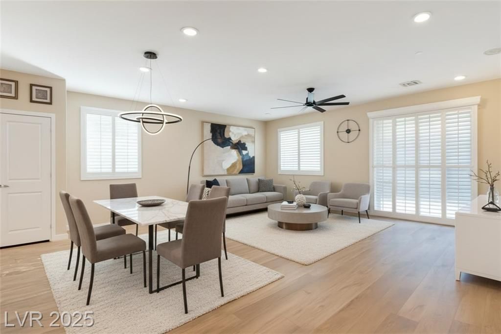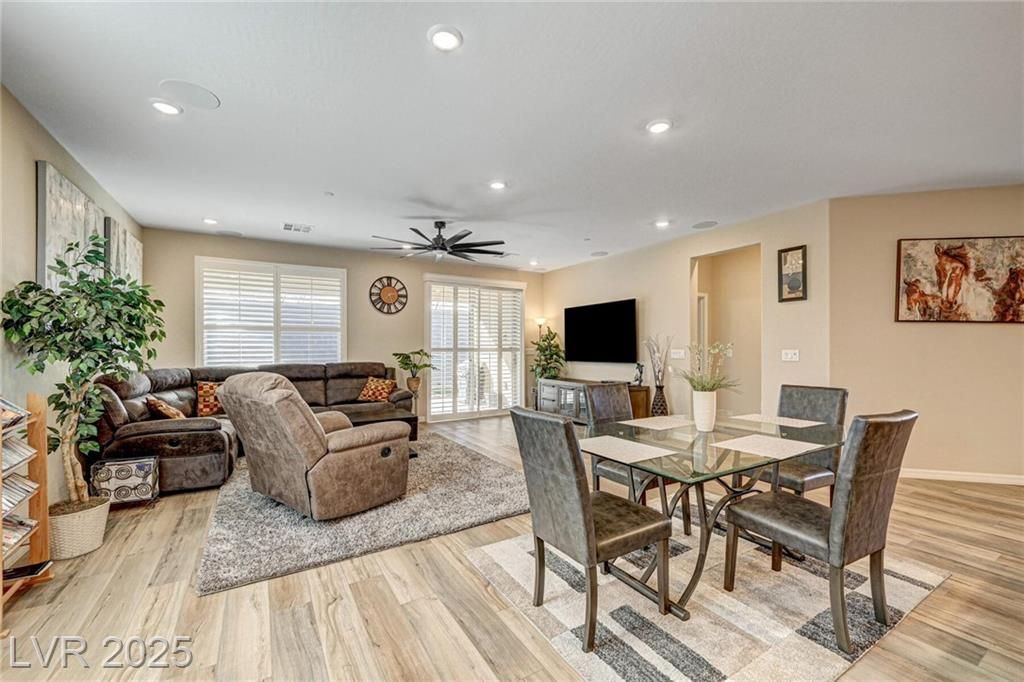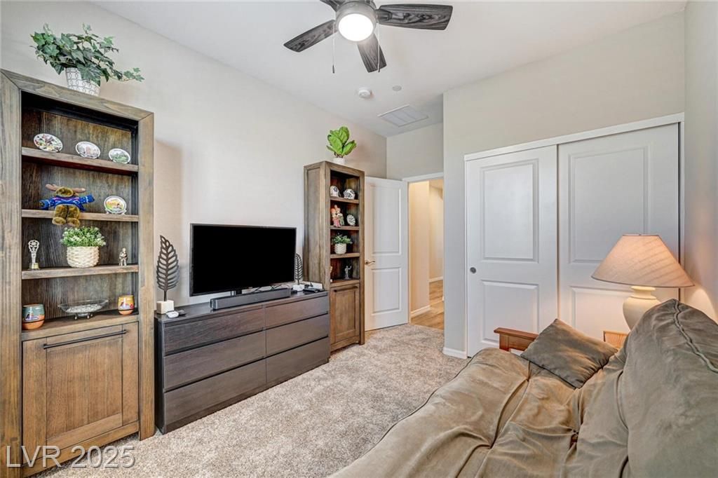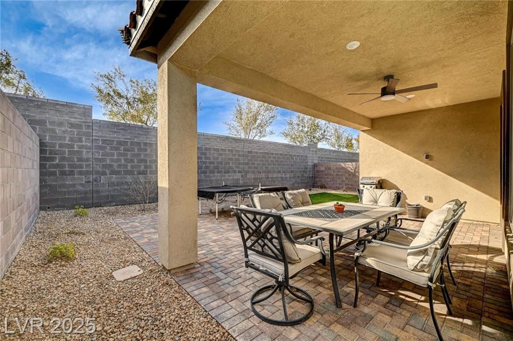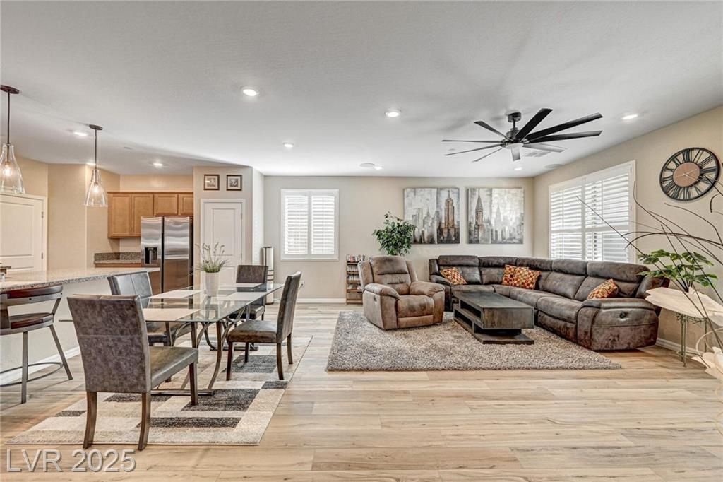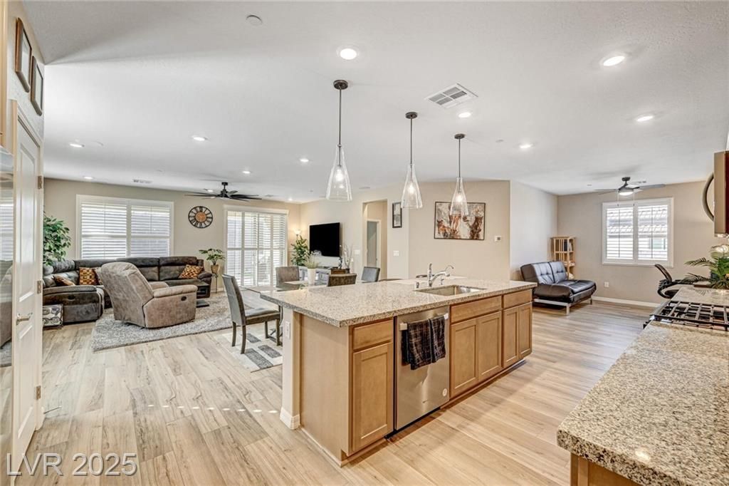 If you love The Dream model in this community, this home is for you.The Solar is PAID OFF!Shutters,Ceiling Fans,Stainless Fridge,Washer & Dryer,AC Smith soft water system & satellite dish.The upgrades in this home go on & on starting w/the flooring throughout,pendant lights above the kitchen island,(same as in the model Dream)the primary bathroom shower has upgraded tile,additional recessed lighting,electric in family room(wires are hidden in the wall) & in the primary is TV height,surround Sound,backyard landscaping w/turf.This home is the Dream model & is set up as two bedrooms w/a den.The primary is separate from the rest of the home & is a nice size w/a great walk in closet & the extra cabinet for linens is amazing.The den is off the kitchen & open to the living space.The front of the home has the 2nd bedroom & bath plus a 6X9 laundry room.The yard is private w/ nobody behind & it faces the side of the home across the street. All construction in the immediate area is complete.