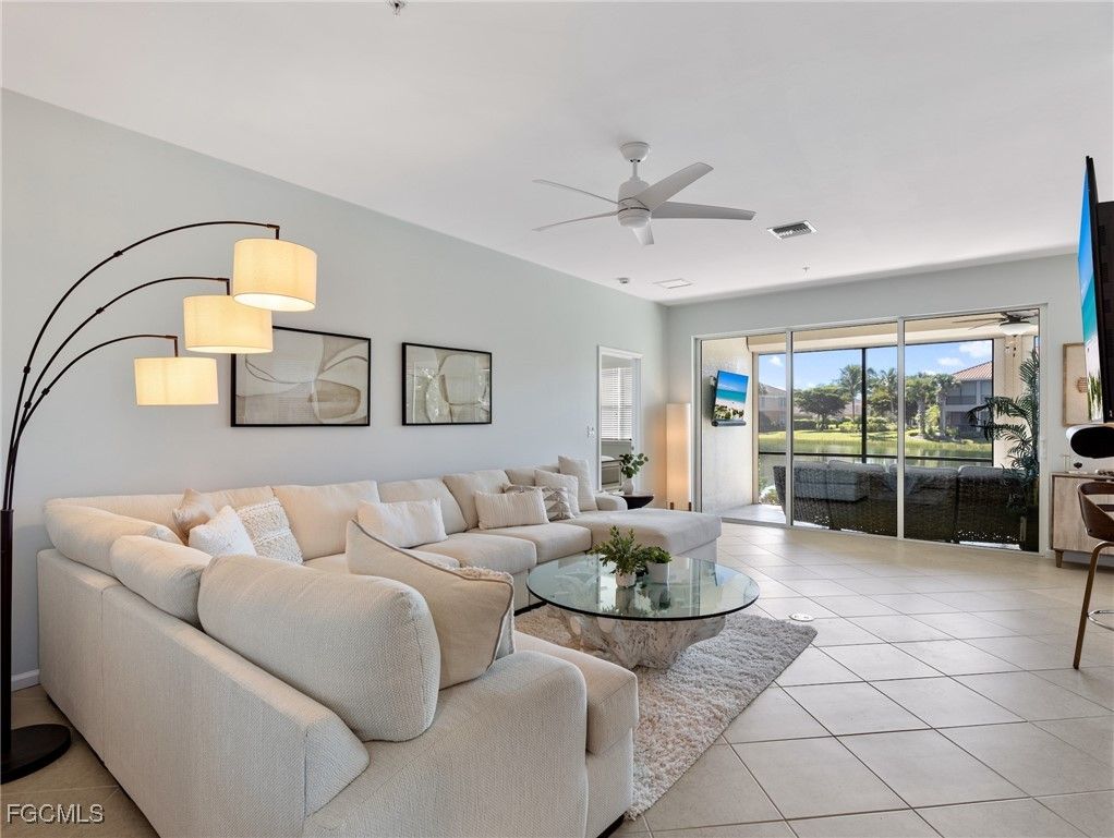 Discover the opportunity to reside in one of Southwest Florida's most sought-after communities—Somerset at The Plantation. This "Turnkey" first-floor condo features 2 bedrooms plus a den and offers more than 1,500 square feet of living space. Enjoy breathtaking views of lush landscaping and the expansive lake from your home. The main living areas of the condo are adorned with tile flooring, while the bedrooms are comfortably carpeted. The open and bright layout ensures abundant natural light throughout. The primary bedroom is designed for privacy, being split from the other rooms, and includes two spacious walk-in closets. Designer elements enhance the condo, such as a glass-etched entry door, a tile backsplash in the kitchen, and stylish tile on the outdoor lanai. The kitchen is equipped with granite countertops and stainless steel appliances, making it both functional and visually appealing. Step out onto the large, spacious lanai, perfect for relaxing and enjoying stunning western sunsets throughout the year. Electric hurricane shutters for protection and comfort. Affordable HOA fees cover insurance, cable, internet, water, and more. You are just minutes away from the impressive amenity center, which boasts a resort-style pool and spa, tennis courts, pickleball, a fitness center, and much more. For those interested in golf or additional social opportunities, the Country Club is available, with golf membership being optional. Somerset at The Plantation is conveniently located near fine dining, excellent entertainment options, premier shopping, Major League Baseball, and the Southwest Florida International Airport. Welcome home!