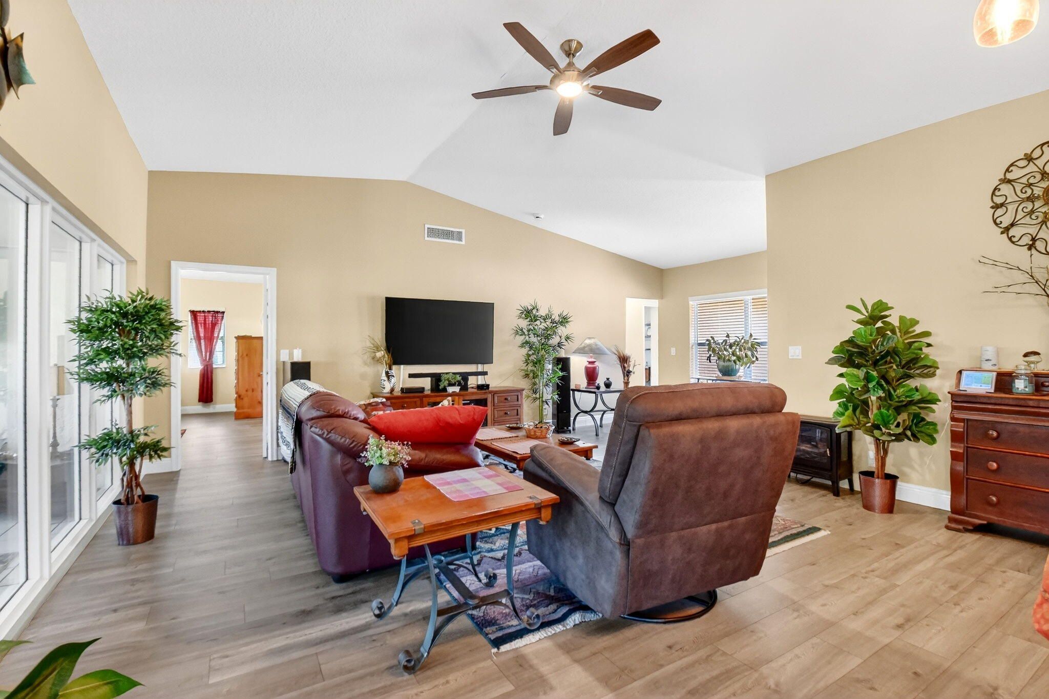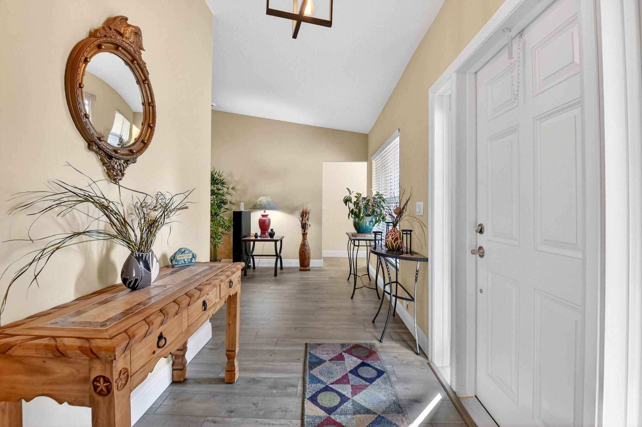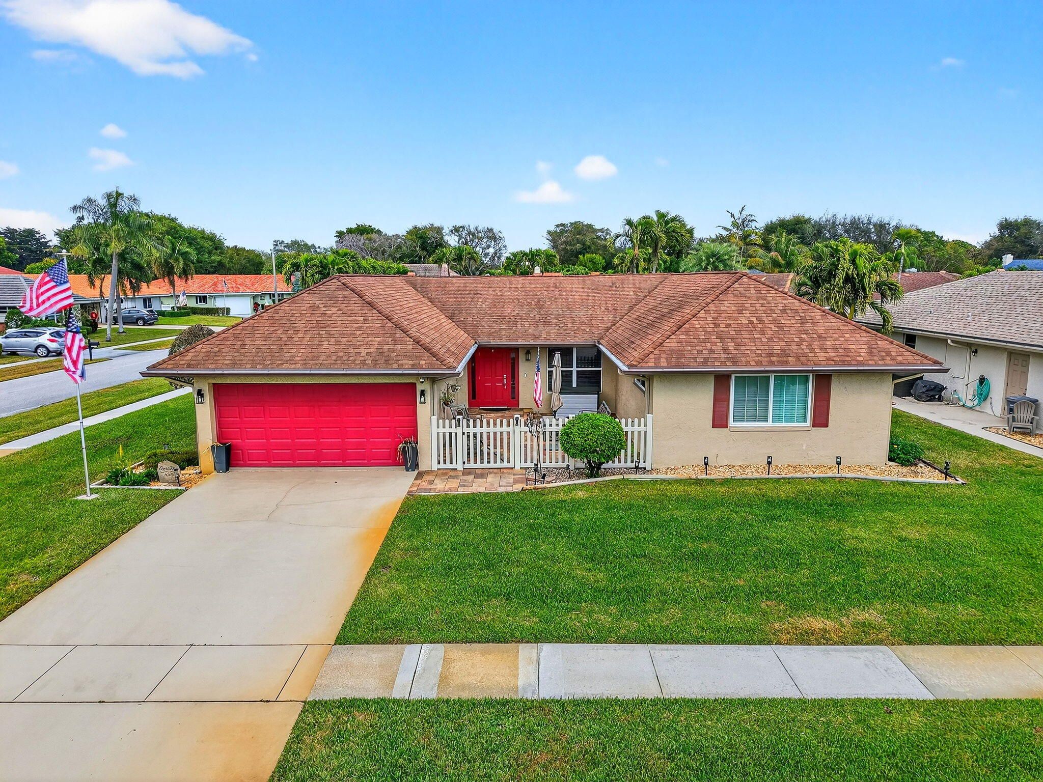 Welcome to 10260 Greentrail Drive N, a meticulously upgraded residence in the heart of Boynton Beach, Florida. This elegant home offers 2,304 square feet of thoughtfully designed living space, featuring three spacious bedrooms and a host of modern amenities that cater to both comfort and style. From 2020 to 2023, this property has undergone significant enhancements to ensure a seamless living experience. The home is equipped with a state-of-the-art Lennox Merit series HVAC system and a Lennox Elite series air handler, both backed by an extended 10-year manufacturer warranty, ensuring peace of mind for years to come. In 2022, the kitchen was upgraded with new Samsung appliances, including a refrigerator, stove, microwave, and dishwasher, providing a contemporary culinary experience. The entire home, both interior and exterior, has been freshly painted, offering a clean and inviting atmosphere. In 2021, new seamless gutters and leaders were installed, and in 2023, Tremron pavers were added to the back porch, courtyard, and side garage door, enhancing the property's curb appeal and functionality. For energy efficiency, the home features blown-in insulation with an R-38 value, installed in 2020. Safety and security are prioritized with new impact-resistant living room picture windows, a kitchen slider, front door, and garage side door, all installed in 2020, completing the whole-home impact safety, including the garage door. The flooring throughout the house, excluding the kitchen, consists of Franklin Oak laminate plank, complemented by new 6-inch baseboards. The bathrooms and enclosed back porch feature durable tile flooring. In 2021, a new Kraus 33" single bowl kitchen sink and Moen ¾ hp garbage disposal were installed, adding to the kitchen's functionality. Additional features include a Race Deck floating garage floor set for 2024, a Chamberlain model B6753T garage door opener with a camera and smartphone app for remote control and alerts, and a well pump for landscaping, reducing city water usage. Ceiling fans are installed in all rooms, and the bathrooms have been updated for modern convenience. Cable connections are available in every room, including the garage, ensuring seamless connectivity. This property is a testament to quality and thoughtful upgrades, offering a blend of modern amenities and timeless appeal. Located in a desirable area of Boynton Beach, it provides easy access to local amenities, schools, and recreational facilities. Don't miss the opportunity to own this exceptional home. Schedule a private viewing today
