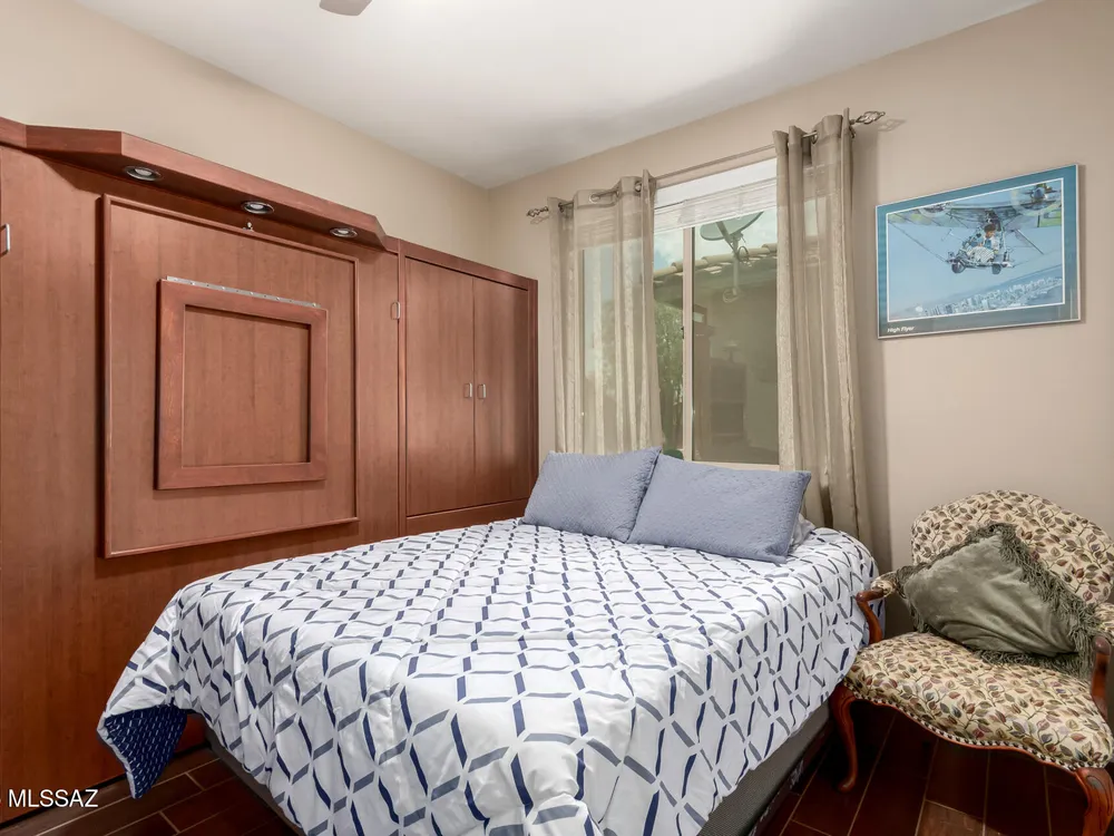 This beautifully cared-for 2 bedroom PLUS den/office, 2 bathroom home is packed with upgrades and move-in ready! Enjoy the durability and easy maintenance of tile flooring throughout--no carpet here. The kitchen is a standout with granite countertops, 42'' upper cabinets, stainless steel appliances, a gas range with double ovens, under-cabinet lighting, and a pantry. The spacious primary bedroom features an en suite bathroom and large walk-in closet with custom built-ins. The second bedroom features a custom-built Murphy bed with a large fold-down table, offering flexible space for guests or a home office. Energy efficiency is top of mind with a tankless water heater and owned solar panels--not leased--for maximum utility savings. The garage includes an epoxy-coated floor,
