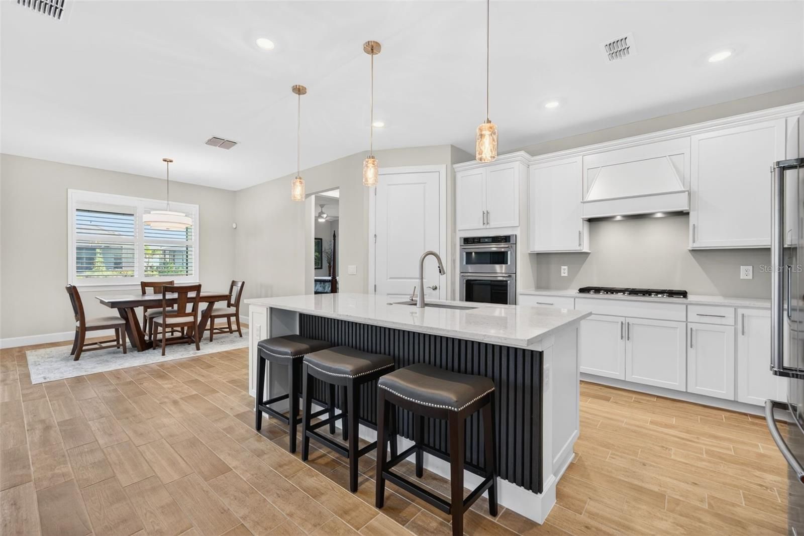 Welcome to coastal elegance in this *** LIKE-NEW, SEASONAL MYSTIQUE MODEL BY PULTE***, offering 3 BEDROOMS, 3 BATHS + FLEX ROOM and ideally positioned on a PREMIUM WATER VIEW LOT. From the moment you enter through the ETCHED GLASS FRONT DOOR, you’ll appreciate the elevated design and seamless flow highlighted by WOOD-LOOK PLANK TILE FLOORING THROUGHOUT THE ENTIRE HOME and PLANTATION SHUTTERS THROUGHOUT, a rare and highly desirable upgrade that creates a refined, cohesive feel in every room. The open-concept layout is designed for effortless living and entertaining, featuring a stunning GOURMET KITCHEN with QUARTZ COUNTERTOPS, CLASSIC SHAKER CABINETRY, STAINLESS STEEL APPLIANCES, and a CUSTOM WOOD-ACCENT ISLAND. The impressive ZERO-CORNER SLIDER DOOR opens fully to the lanai, blending indoor and outdoor living while showcasing tranquil water views, complete with MAGNATRACK HURRICANE SYSTEM fabric roll shutters and OUTDOOR KITCHEN PLUMBING for your future outdoor retreat. This thoughtfully designed home offers TWO PRIVATE EN-SUITE BEDROOMS—including the FRONT GUEST SUITE and the PRIMARY SUITE—along with a third bedroom and versatile FLEX ROOM, ideal for a home office or additional living space. The PRIMARY SUITE features a LARGE WALK-IN SHOWER for a spa-like experience. Additional highlights include HIGH-IMPACT WINDOWS and a GARAGE WITH AC SPLIT SYSTEM for added comfort and flexibility as well as a 4 foot garage extension. Located within the highly sought-after Beachwalk by Manasota Key, residents enjoy a true resort-style lifestyle with an exceptional amenity campus including a TROPICAL RESORT-STYLE POOL WITH LAP LANES AND HEATED SPA, FULL-SERVICE RESTAURANT AND BAR, CLUBHOUSE WITH STATE-OF-THE-ART FITNESS CENTER AND MOVEMENT STUDIOS, TENNIS, PICKLEBALL, AND BOCCE COURTS, FIRE PITS, SOCIAL SPACES, CARD ROOMS, and A FULL CALENDAR OF COMMUNITY EVENTS. Outdoor enthusiasts will love the LAKESIDE BOARDWALK WITH PIER AND GAZEBO, WALKING TRAILS, DOG PARK, and COMMUNITY GARDEN, all set within a beautifully designed gated community just 2.5 MILES TO THE BEACH WITH GOLF CART ACCESS—one of the most unique and desirable lifestyle features in the area. Select furnishings and a golf cart may be available separately, offering a convenient opportunity to enhance your move-in experience. Private showings available—discover what makes this home and community so special.