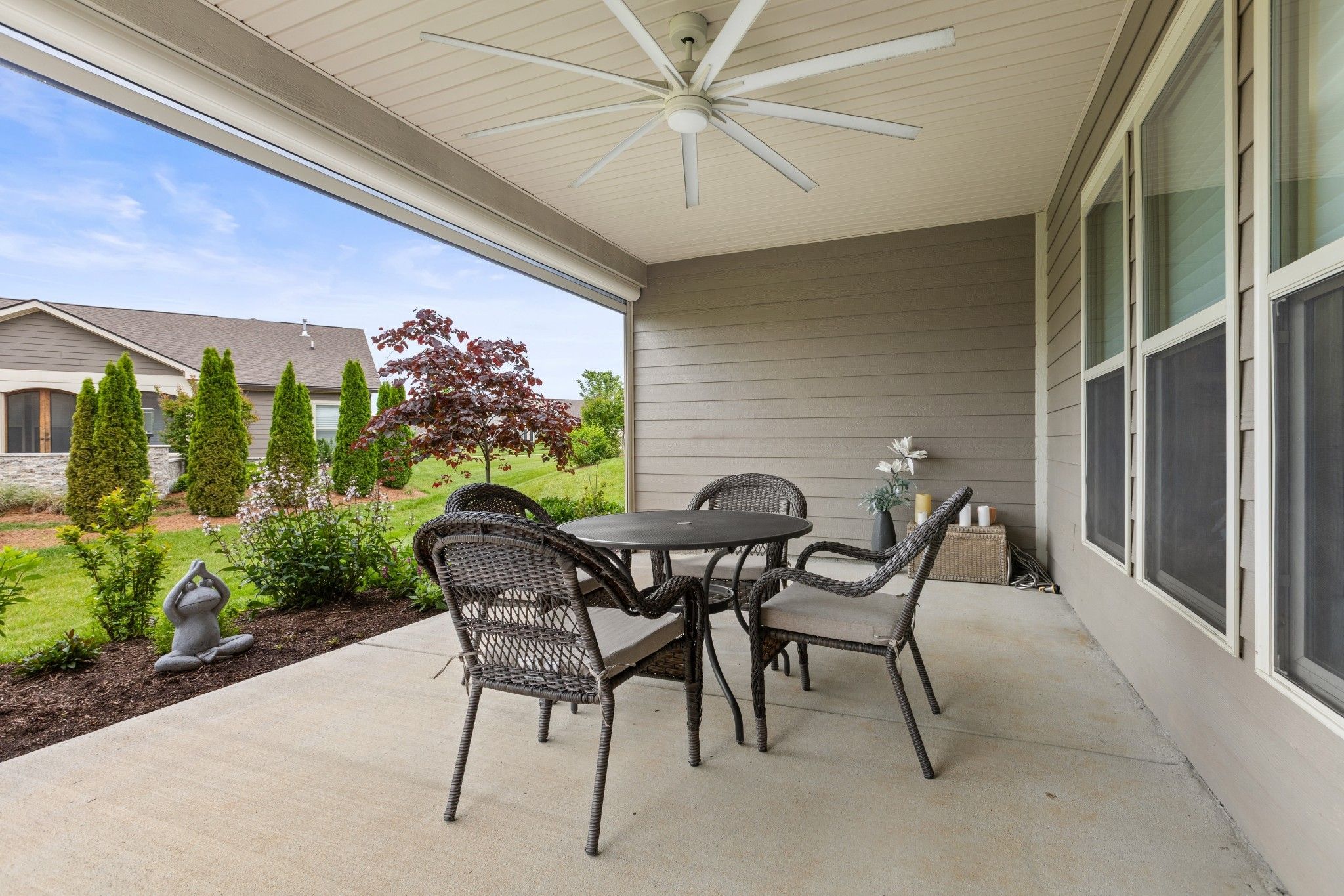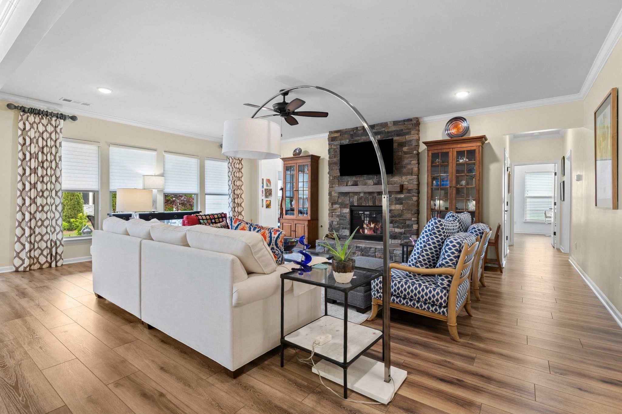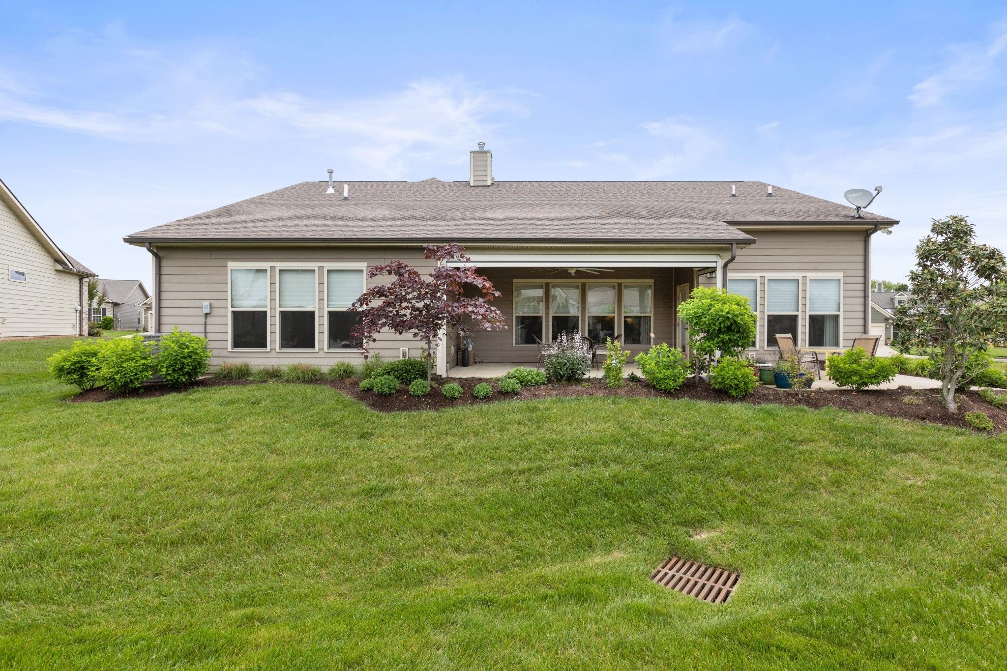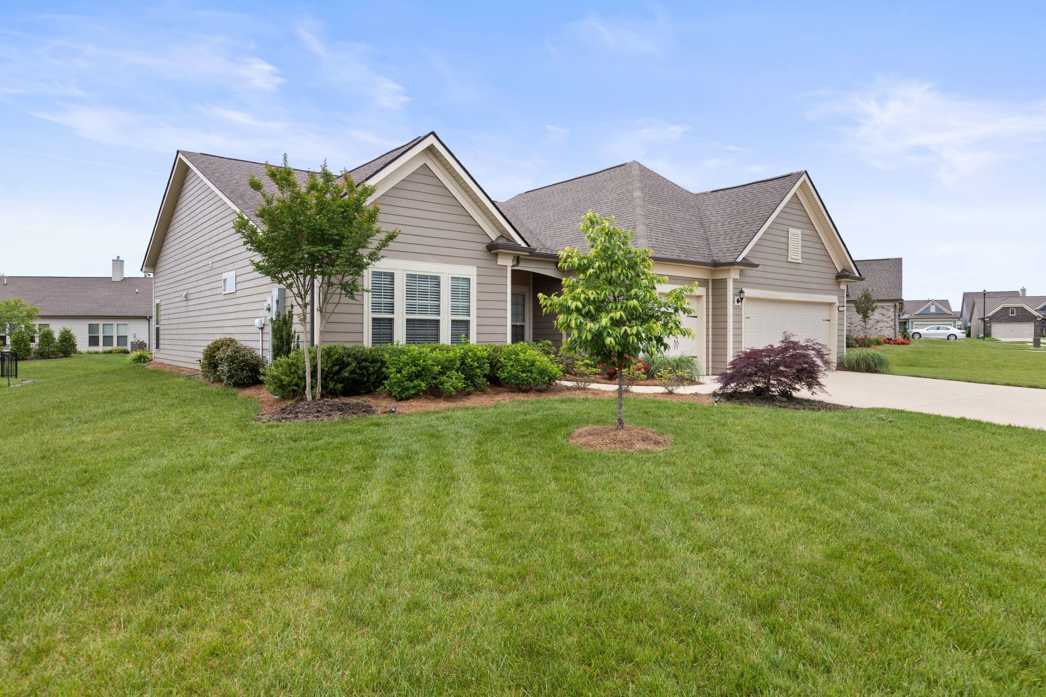 Spacious open concept Dunwoody Way Model with a golf cart garage on a lavishly landscaped lot on one of the most desirable streets in Southern Springs by Del Webb 55+ active adult community. Crown moulding, wainscoting, ceiling fans, high end custom drapes, and stone gas log burning fireplace. Primary bath has double sink vanities, granite countertops, walk-in tile shower, linen closet, and separate water closet with bidet. Primary closet has modular closet system and tons of storage. Kitchen has granite countertops, dovetail drawers, soft close doors, roll out shelving, built-in microwave and oven, gas cooktop, tile backsplash, large island for entertaining, and walk-in pantry with custom shelving and pull out drawers. The flex room office has beautiful custom built-in shelving and desk area. Storm door at front entry. Professionally installed ionizer air cleaner on furnace, whole house surge protector at electrical panel, laundry room with custom built-in cabinetry and countertop. All kitchen appliances as well as washer and dryer convey with property. The large covered patio has ceiling fan and remote controlled Rainier retractable screens for increased privacy. The patio has a gas stub for connecting directly to your grill. Community has both indoor and outdoor pools, pickleball and tennis courts, gas firepit, pavilion with gas grills and patio tables, clubhouse with fitness center and fitness classes, ball rooms, kitchen, conference room, card/game room, massage room, men's and women's locker rooms, and a dog park. Over 70 clubs and special interest groups, special programs, presentations, concerts, Southern Springs choir and band, as well as photography, painting, quilting, solo clubs, coffee club, Veteran's club, and so much more. Living in Southern Springs is like vacationing at a very active resort. Thirty-five minutes to/from BNA.