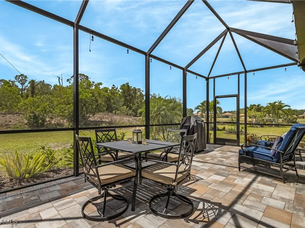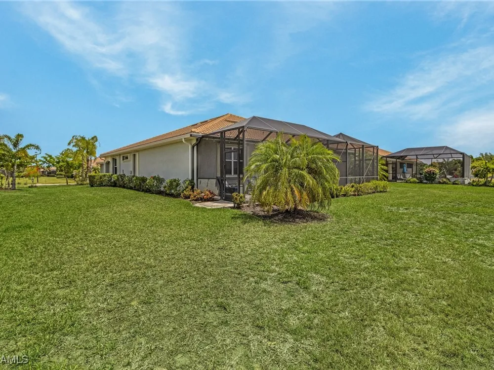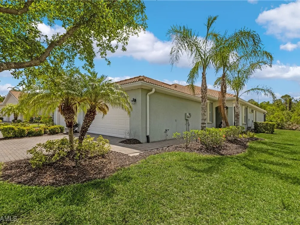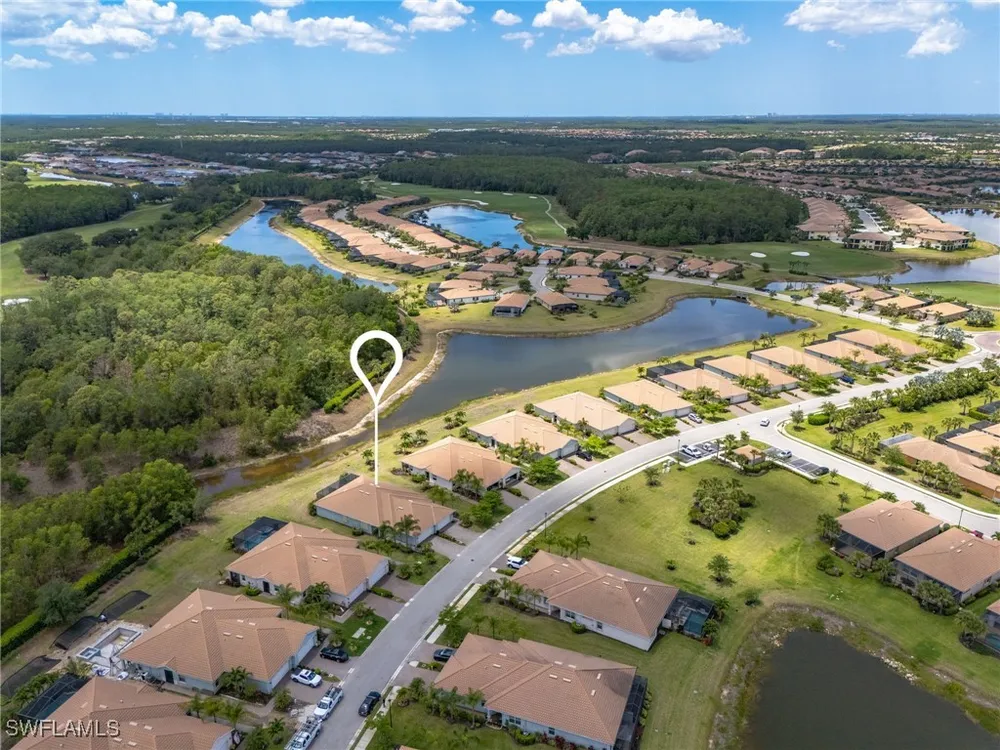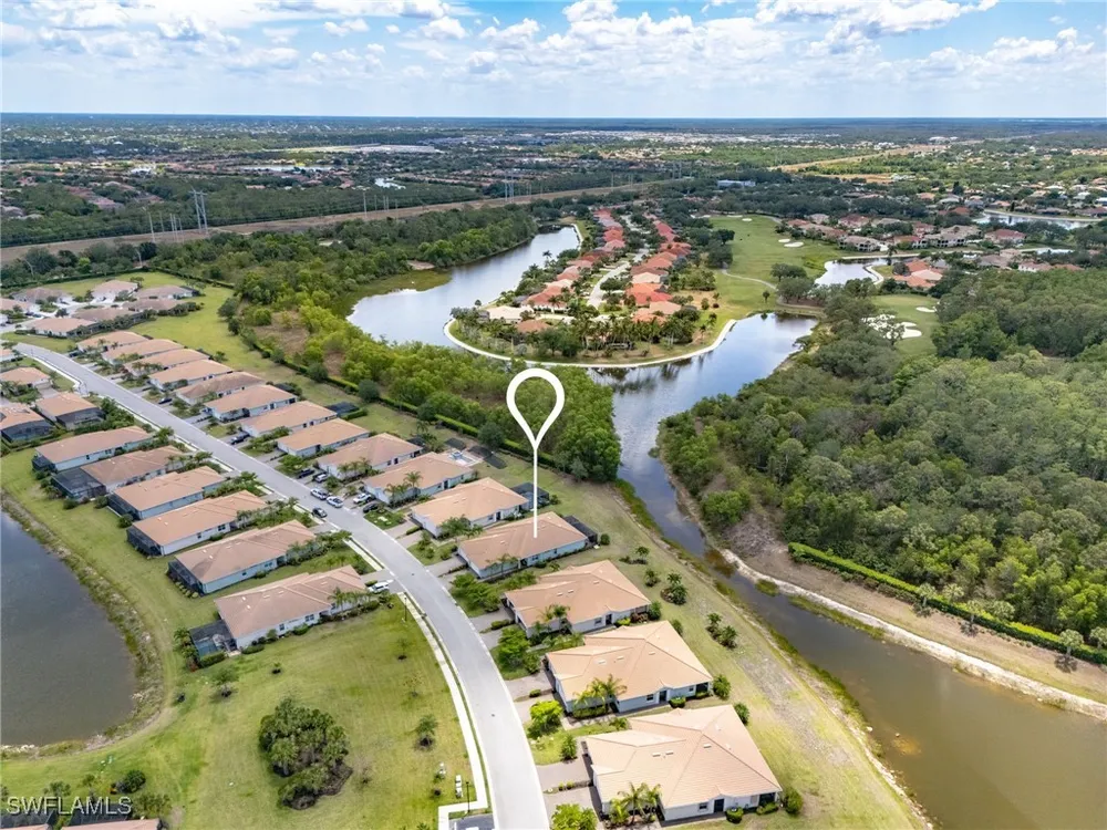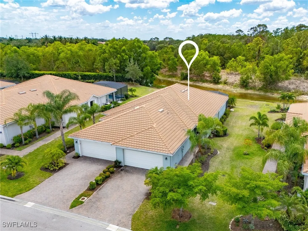 You wont be disappointed with this location. This villa sits on a premium lot with water and expansive landscaping views, with a bonus view of Gateway Golf Club. This lovely home is being offered furnished and includes 2 bedrooms, 2 baths, den and laundry room that leads to the 2 car garage. One of the primary upgrades is the extended screened lanai to enjoy the peaceful setting. Other upgrades include electronic storm screens on the covered portion of the lanai, Accordian shutter for all other windows, window coverings and ceiling fans. Pelican Preserve is a nationally recognized active adult 55+ community with endless amenities including the Flip Flops outdoor restaurant, 3 pools, Tennis, Pickleball, Bocce, Softball, Fitness, Movie Theater, Billiards, Hobby Rooms, Amphitheater, Destinations indoor restaurant, plus many special events throughout the year. The Brokke Center includes a Library, Card Rooms and Coffee Center for socializing with friends. Pelican Preserve has a 27 hole Private Golf Club with optional memberships. Pelican Preserve is a short drive to RSW Airport and many shops and restaurants and the gulf coast beaches.