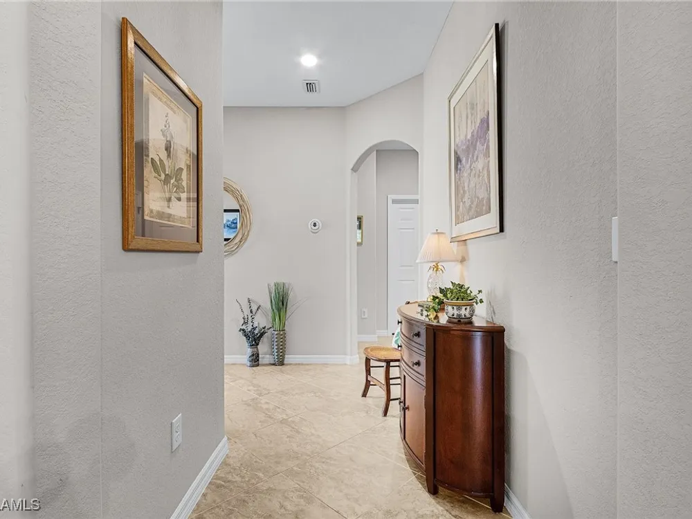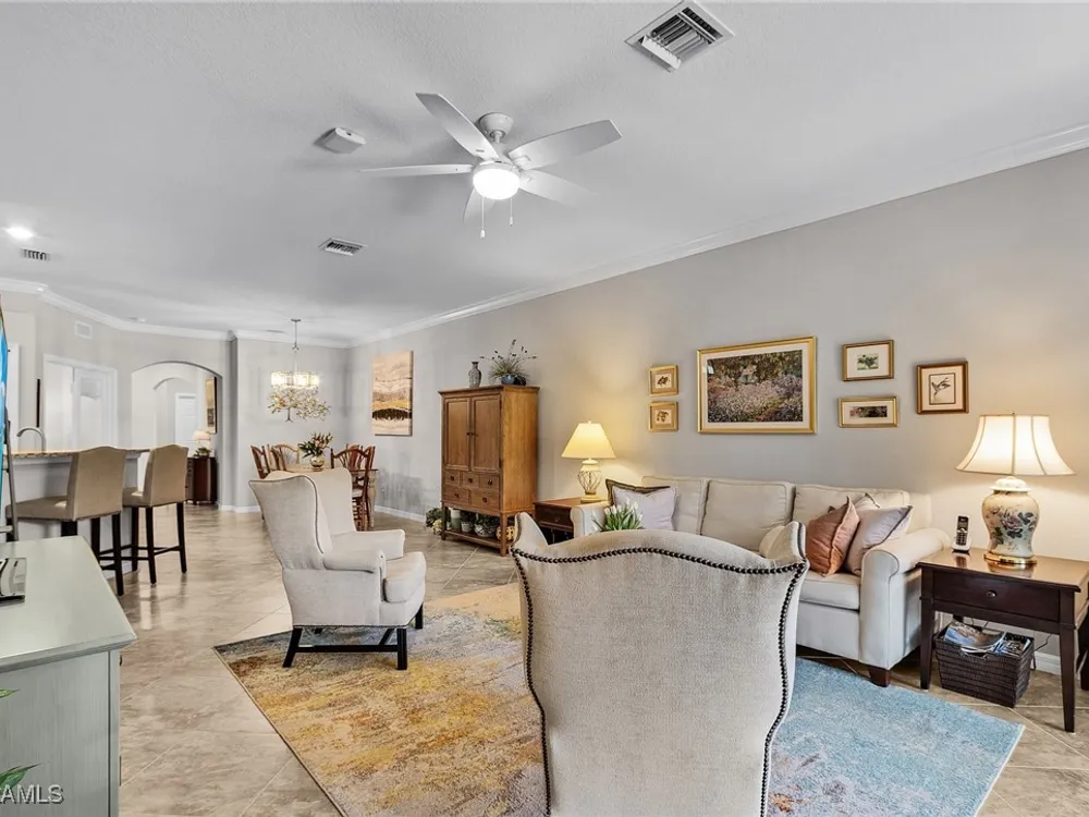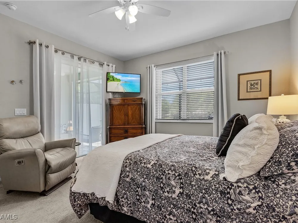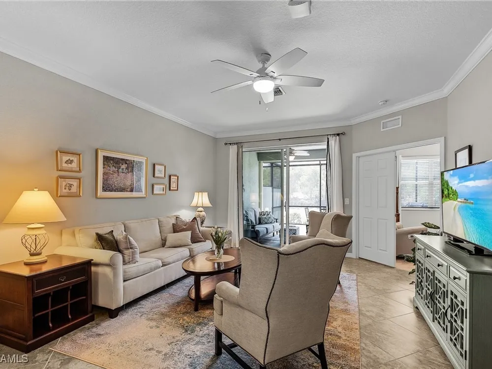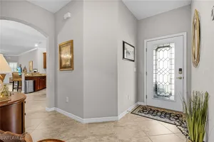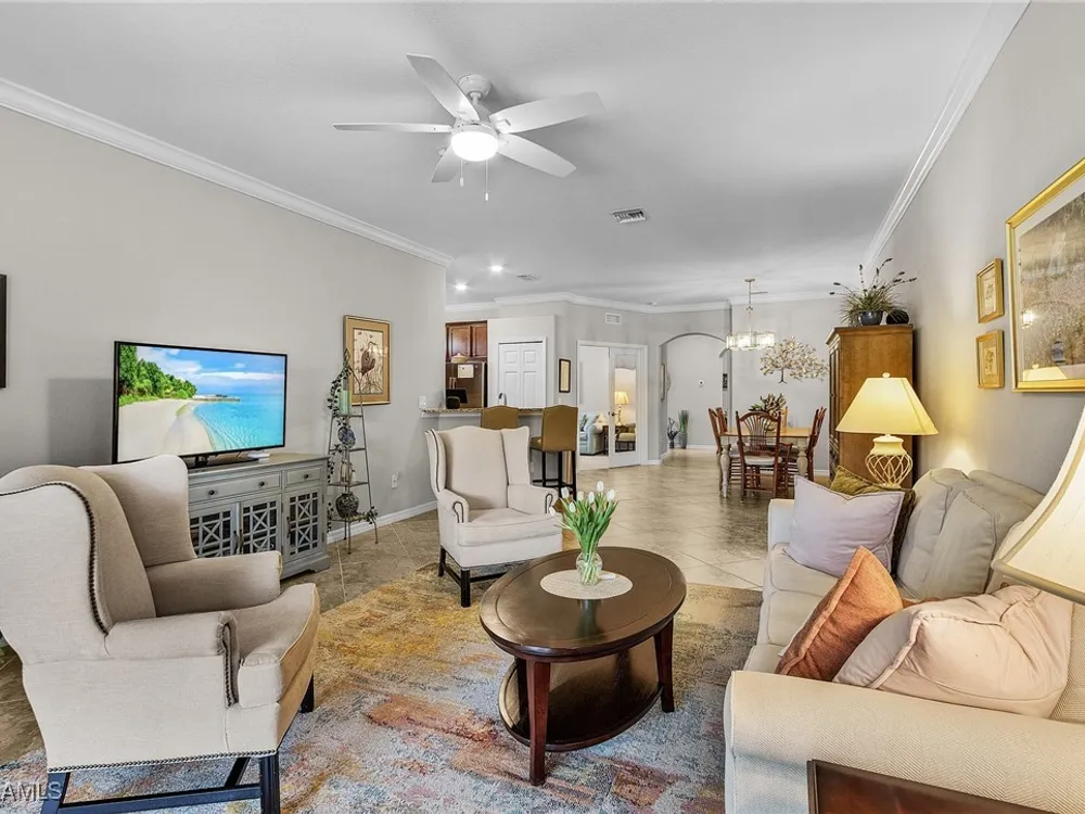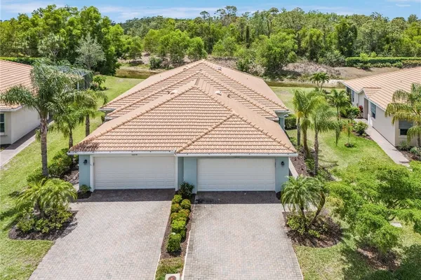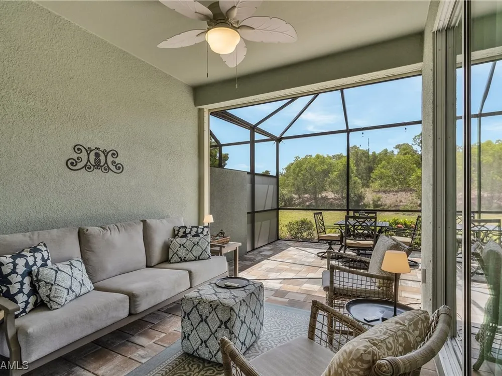 You wont be disappointed with this location. This villa sits on a premium lot with water and expansive landscaping views, with a bonus view of Gateway Golf Club. This lovely home is being offered furnished and includes 2 bedrooms, 2 baths, den and laundry room that leads to the 2 car garage. One of the primary upgrades is the extended screened lanai to enjoy the peaceful setting. Other upgrades include electronic storm screens on the covered portion of the lanai, Accordian shutter for all other windows, window coverings and ceiling fans. Pelican Preserve is a nationally recognized active adult 55+ community with endless amenities including the Flip Flops outdoor restaurant, 3 pools, Tennis, Pickleball, Bocce, Softball, Fitness, Movie Theater, Billiards, Hobby Rooms, Amphitheater, Destinations indoor restaurant, plus many special events throughout the year. The Brokke Center includes a Library, Card Rooms and Coffee Center for socializing with friends. Pelican Preserve has a 27 hole Private Golf Club with optional memberships. Pelican Preserve is a short drive to RSW Airport and many shops and restaurants and the gulf coast beaches.