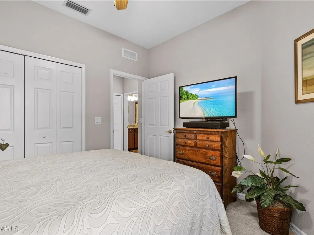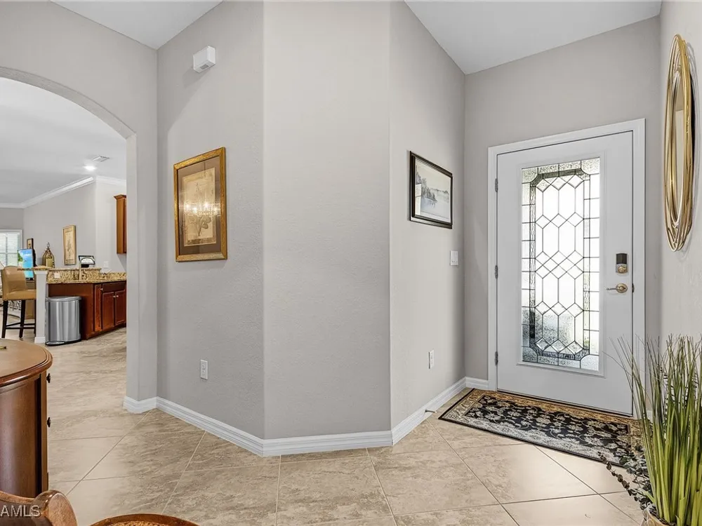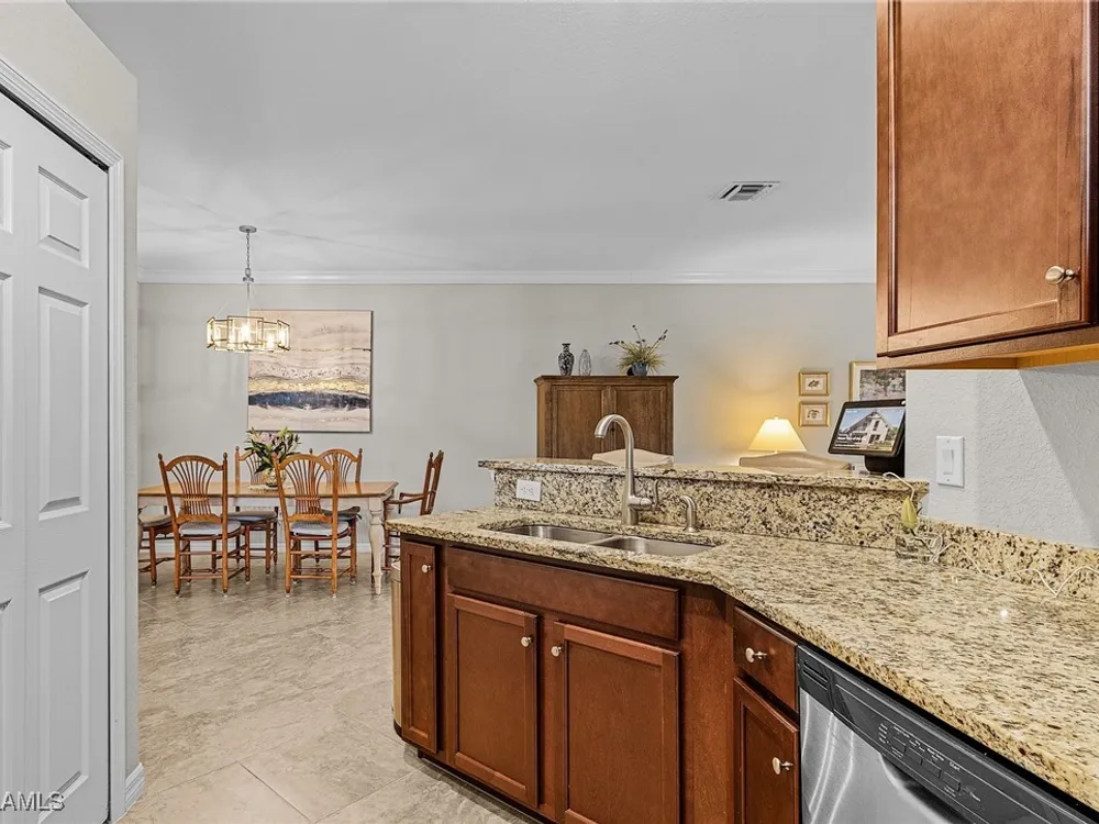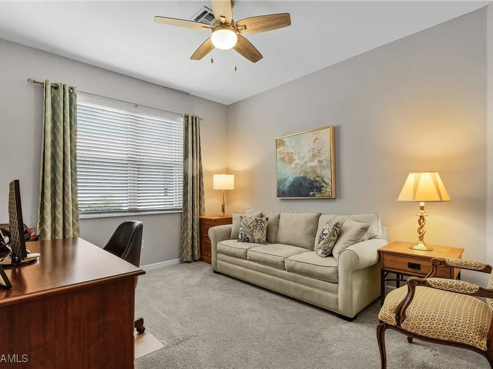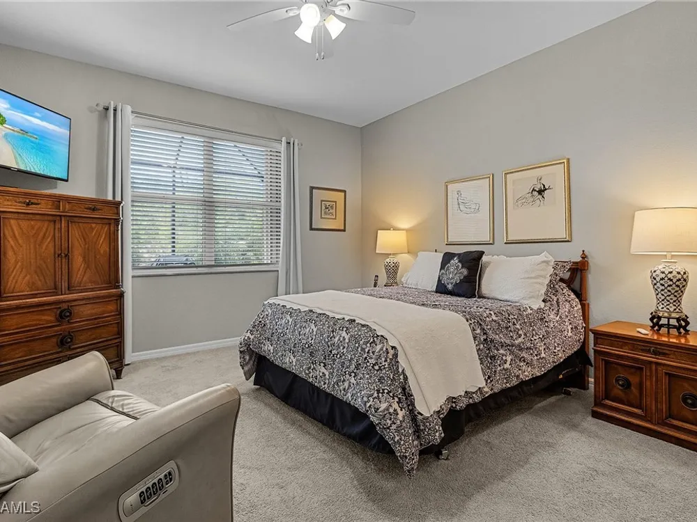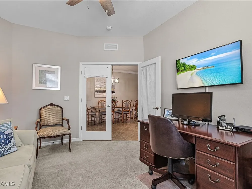 You wont be disappointed with this location. This villa sits on a premium lot with water and expansive landscaping views, with a bonus view of Gateway Golf Club. This lovely home is being offered furnished and includes 2 bedrooms, 2 baths, den and laundry room that leads to the 2 car garage. One of the primary upgrades is the extended screened lanai to enjoy the peaceful setting. Other upgrades include electronic storm screens on the covered portion of the lanai, Accordian shutter for all other windows, window coverings and ceiling fans. Pelican Preserve is a nationally recognized active adult 55+ community with endless amenities including the Flip Flops outdoor restaurant, 3 pools, Tennis, Pickleball, Bocce, Softball, Fitness, Movie Theater, Billiards, Hobby Rooms, Amphitheater, Destinations indoor restaurant, plus many special events throughout the year. The Brokke Center includes a Library, Card Rooms and Coffee Center for socializing with friends. Pelican Preserve has a 27 hole Private Golf Club with optional memberships. Pelican Preserve is a short drive to RSW Airport and many shops and restaurants and the gulf coast beaches.