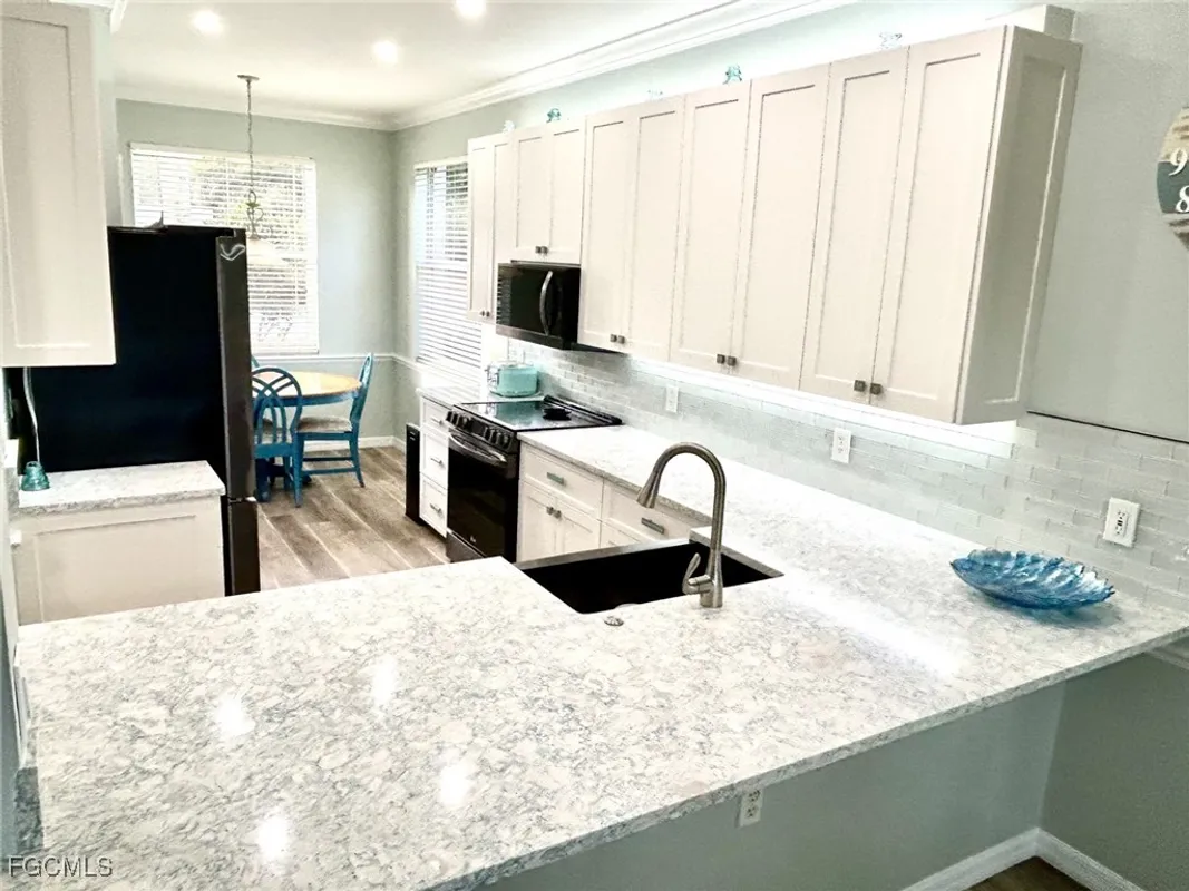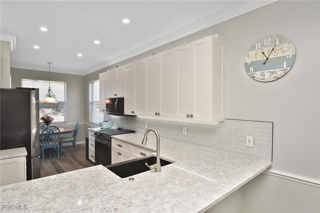 Discover a rare gem in the prestigious community of Heritage Palms – a first-floor colonnade. This stunning, two-bedroom/2 bath (plus large den) has $80,000 in high-end renovations (completed in December 2024). Every detail in the 1408 SF condo has been thoughtfully curated, showcasing a seamless flow of coastal hues that create a soothing, inviting atmosphere throughout. You’ll be captivated by the bright and spacious interior, freshly painted in today’s color trends. The NEW contemporary kitchen features an expansive, one-level quartz countertop, artisanal backsplash, a cozy breakfast nook, recessed lighting, all-new stainless steel appliances (2023), a large farmhouse sink, and cabinetry with above and below soft lighting that completes the modern look. The open-concept design is ideal for quiet evenings at home or entertaining friends and family. This spacious layout, in a private, quiet setting, overlooks Hole 16 of the Royal Course. The nearest pool and cabana are visible from the kitchen window, offering ultimate convenience. Light, neutral luxury vinyl plank flooring flows through the entire home. The primary suite has private lanai access, two walk-in closets, and a remarkably updated en suite. A quartz countertop, double-bowl sinks, a tall vanity with extra storage, floor-to-ceiling luxury tile in rich blues, taupe and white tones, and a seamless glass shower door are some of the exquisite details in the primary bathroom. The shower entry is level for enhanced mobility and safety. The den features pocket doors and a queen Murphy bed, providing flexible space for guests or a private retreat for you. Additional enhancements include all-new light fixtures, upgraded tile at the front entrance and lanai, and an ocean-wave luminaire over the dining area for unobstructed views. The updates to this home are complete with a new water heater (2023) and washer and dryer (2025). Lexan hurricane window protectors (located in the oversized storage unit) can be quickly placed for added peace of mind. This bundled-golf community offers 36 holes of championship golf, tennis and pickleball courts, a resort-style pool and Oasis/Tiki Bar (February 2026), a state-of-the-art fitness center, and casual/forming dining. It is an ideal winter retreat or full-time residence for those seeking an active Florida lifestyle. Don't miss this exceptionally upgraded colonnade!