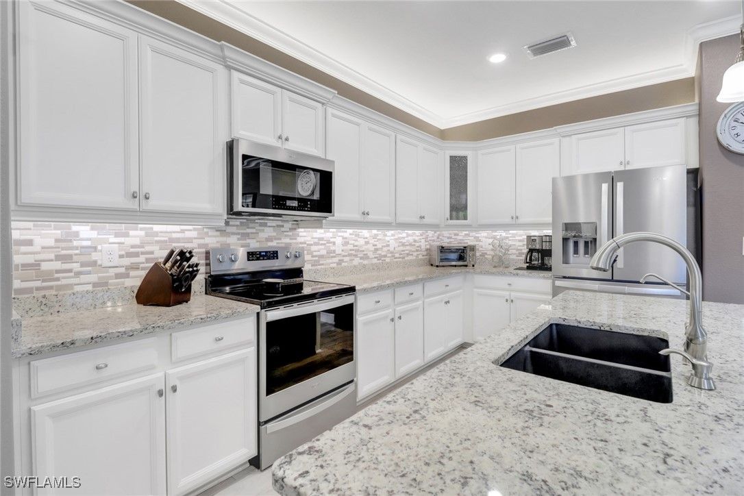 Listed below appraised value. BEST VALUE IN THE COMMUNITY!!!! You are welcomed when entering the home with expansive lake views, following an open floor concept. Beautiful finishes in your gourmet kitchen, featuring Whirlpool stainless steel appliances, granite counters and mosaic tile backsplash, under & above cabinet lighting, charcoal granite sink, soft-close cabinetry, pull-outs, custom crown molding & mop boards, Built-in glass-front cabinet, added pantry shelving and more. Desirable Trevi floor plan with 3 bedrooms plus den, 3 full baths, pool and 2 car garage. Additional upgrades include a whole-house Generac generator with buried 500 gallon propane tank, new AC system (Feb 2025) with hospital-grade HEPA filtration, and Storm Smart hurricane-rated windows. Interior highlights: - Luxury vinyl tile flooring throughout for easy maintenance, washer & dryer (2024) - Closet systems in both master walk-ins, Culligan water system, all new lighting/fans throughout, Motion lighting in utility & garage, Samsung garage refrigerator, Tool chests, cabinets & epoxy treated garage floor - Garage ceiling fishing pole organizer - Laser parking lights Outdoor upgrades: - New pool cage (2024) with no-see-um screen - Heated pool with child safety fence - Solar lighting around pool area - Driveway & pool pavers treated every 6 months - Tropical landscaping including Blue Tulip Agave & Royal Pygmy Palms - Screened front entry Bonus: Quartz countertops in all baths, plantation shutters, and original tile preserved under LVT. Relax in your spacious En-suite bathroom with soaking tub and walk-in shower, double vanity and large main bedroom closet with custom cabinets. Enjoy the outdoor space and expansive lake views with a large covered lanai and screened in pool area. Pelican Preserve a premier, active 55+ Resort Style community. Amenities include card rooms, you can enjoy bridge, mahjong, poker and more, Explore sewing, wood-working, art lessons, billiards, and computers, or relax and enjoy popcorn while watching movies in the theatre.There are plenty of exercise classes offered at the fitness center, including Yoga, Spin, Pilates, and Zumba. Indoor and outdoor pools. In addition also there are an indoor track, locker rooms, sauna and steam rooms, and spa treatment rooms. 8 Tennis courts and 12 Pickleball courts. Pelican Preserve has a 27 hole Private Golf Club with optional memberships. Other amenities include: Theatre, Dog Parks, Fishing Pier, Amphitheater Cafe, Library and restaurants with bar and a vibrant social calendar. Pelican Preserve is a short drive to RSW Airport and many shops and restaurants and the gulf coast beaches, making this the perfect home and location to begin life's next adventures!