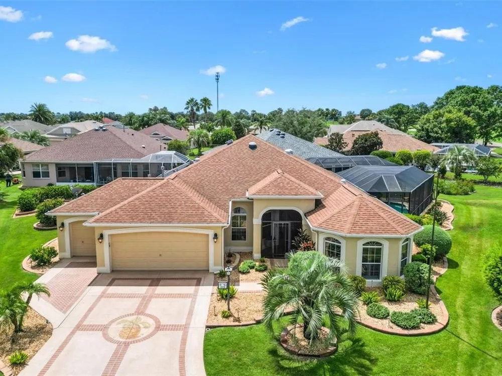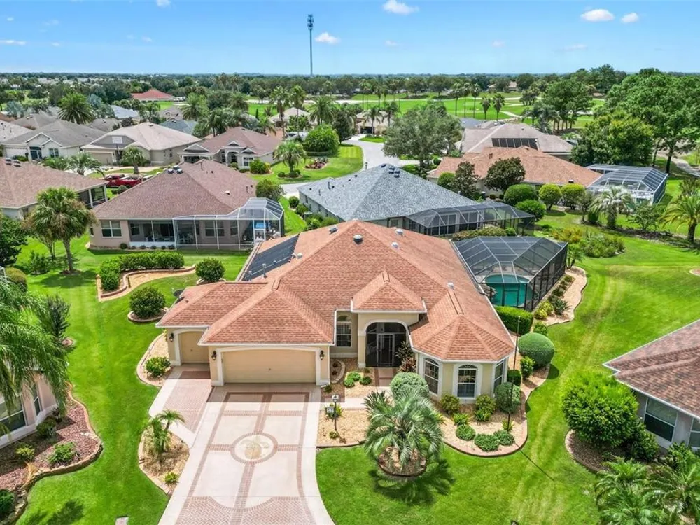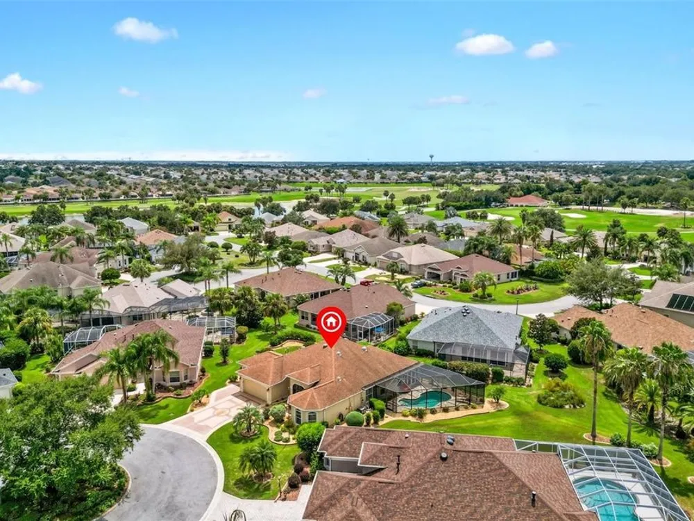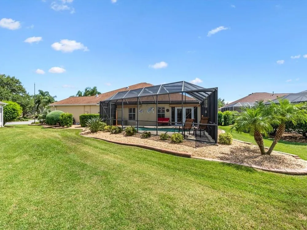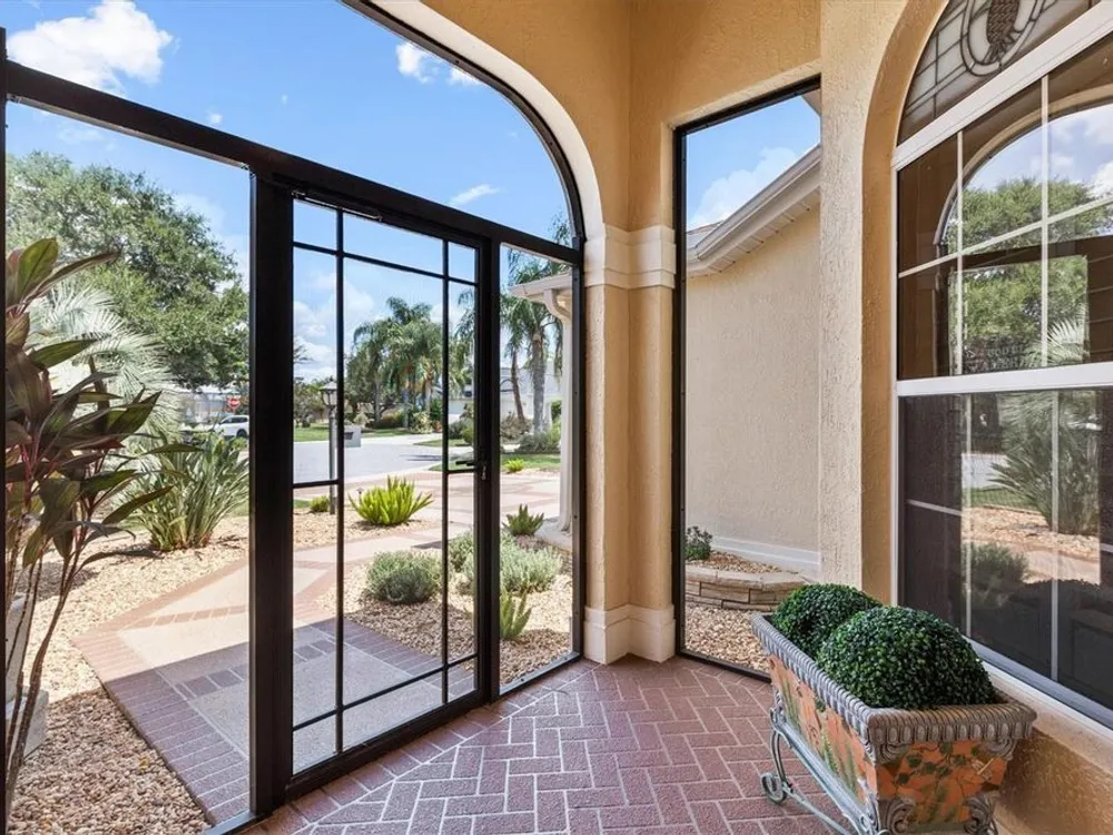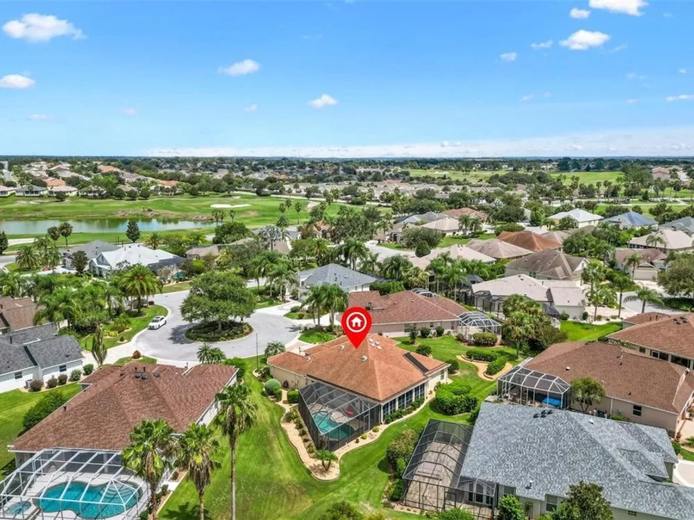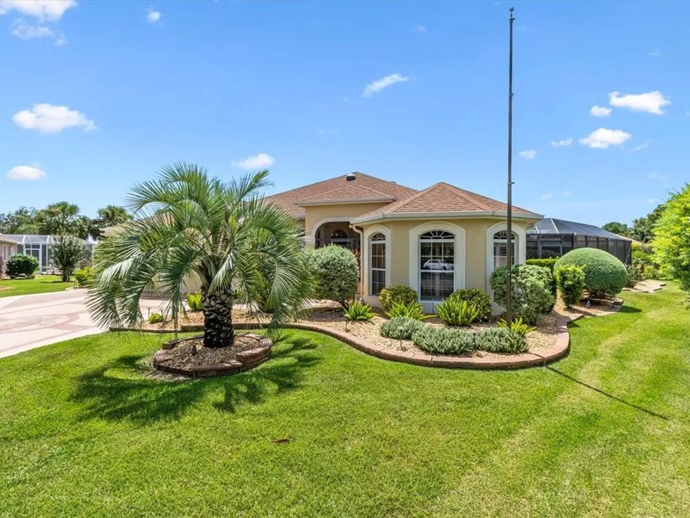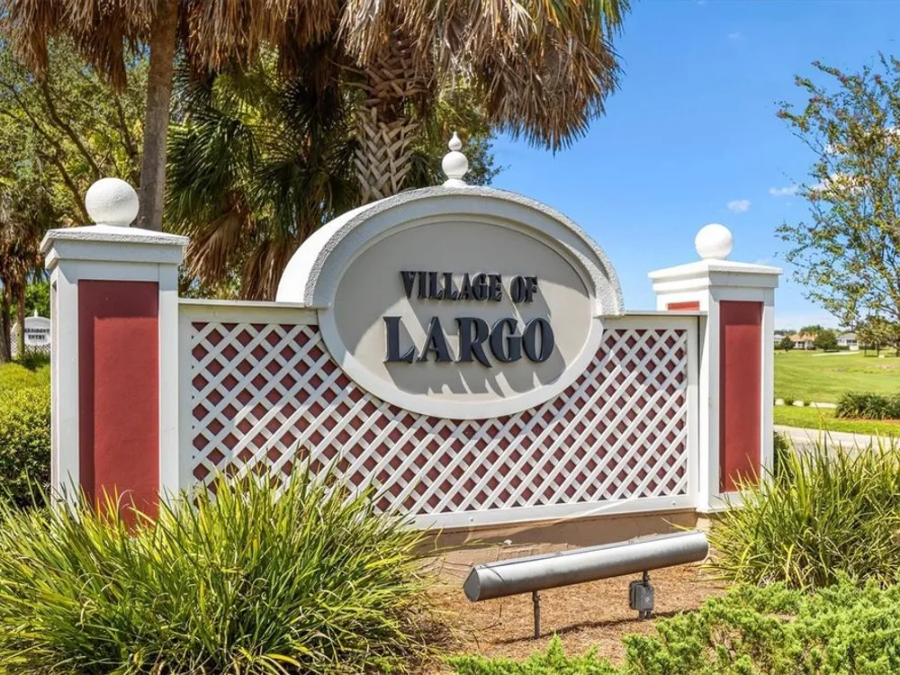 Stunning 3/2 Expanded Gardenia Pool home with Golf course View. Situated in an oversized cul-de-sac lot in the Village of Largo. NO BOND! Roof and HVAC Replaced 2015. Exterior Painted 2019. 2 1/2 miles to Lake Sumter Landing. This beautifully appointed home welcomes you with a screened front porch and a charming stained-glass door with side panel and transom windows. Step inside to discover tiled flooring laid on the diagonal with 2 decorative inlaid medallions (entry and kitchen), complemented by five solar tubes that fill the home with natural light. Wood-look laminate flooring adds warmth to the bedrooms. The eat-in kitchen features stainless steel appliances, a 5-burner gas stove, QUARTZITE counters, oak cabinets with glass fronts, pull-out shelves, a breakfast bar with pendant lighting, and a pantry closet in the adjacent laundry room. Crown molding and plantation shutters run throughout the home, enhancing its elegance. The split plan layout offers a master bedroom with lanai access, two customized walk-in closets, and an ensuite bath with split vanities, a shower with built-in bench, and a linen closet. Two guest bedrooms also feature custom closets, with a guest bath offering a shower (no tub) and a pocket door for added privacy. The Back bedroom boasts a tray ceiling with double-crown molding and the front bedroom has 3 large bay windows, and a Queen Murphy Bed with sliding Shelves that open in the middle...a great use of space! Relax or entertain year-round in the enclosed lanai with a mini-split system, privacy shades, and French doors leading to the screened saltwater pool, complete with solar and gas heating and two remote-controlled awnings for shade. Additional features include: 2 car plus golf cart Garage with electronic screen door, insulated door & epoxy-coated floor, Whole-house water system with filtration, softener & charcoal, MAGIC STAIR KIT for easy access to attic storage, a Built-in safe, Vivant security system, ring door bell, exterior awnings, and painted paver driveway. New Pool Pump just installed. Dryer Vent cleaned in April 2025. View of #1 tee of Bacall and #1 tee of Bogart Golf courses. Located just minutes from Bacall Recreation Center and Largo Pool, and between Lake Sumter Landing and Brownwood Town Center, this is the perfect place to call home! Don’t miss the opportunity to make this beautiful designer home yours and start living the Villages dream.