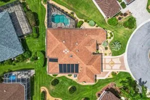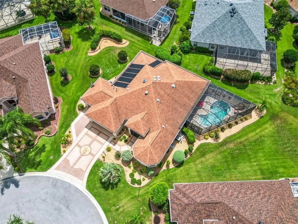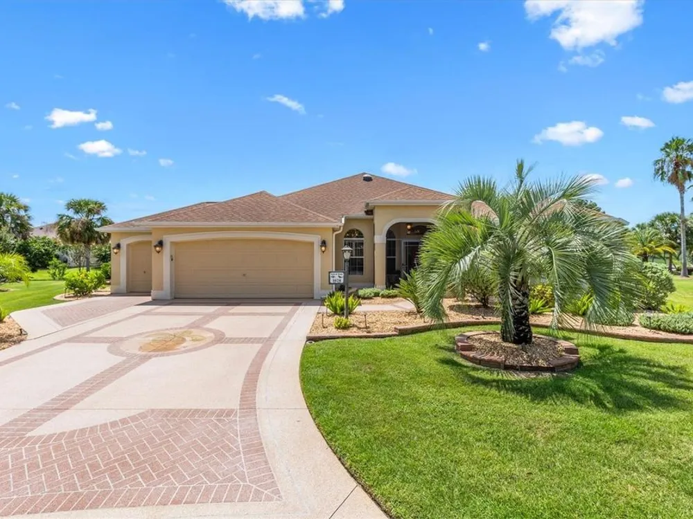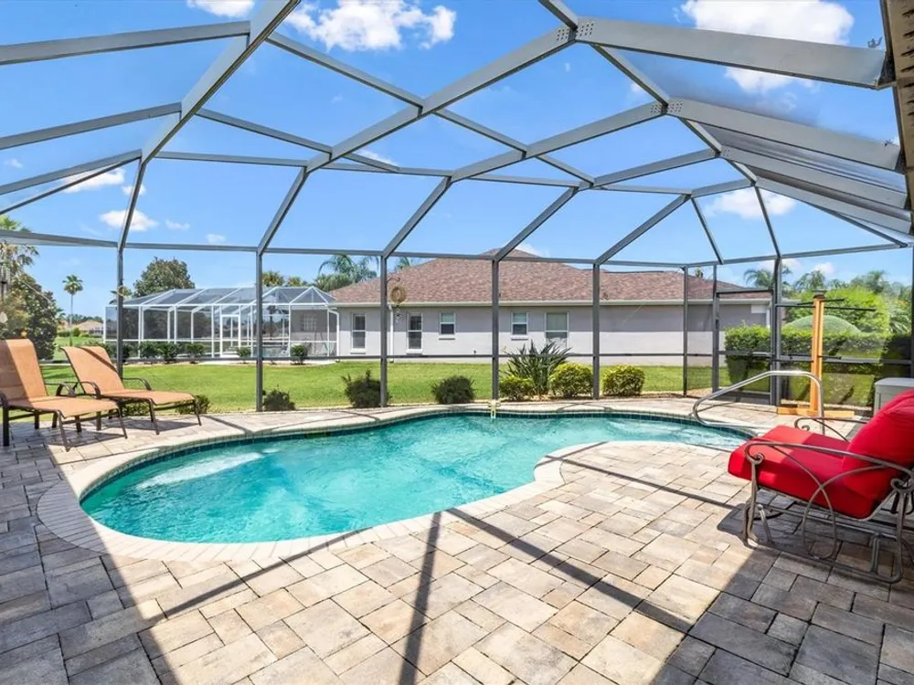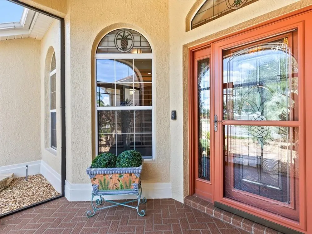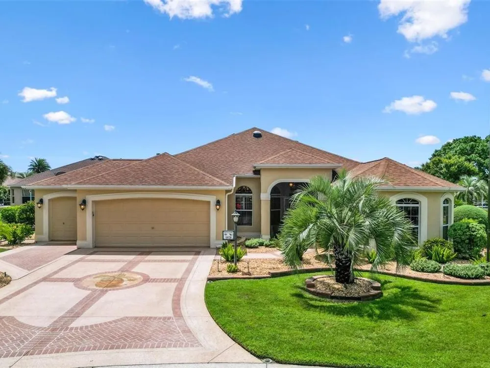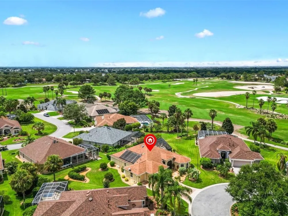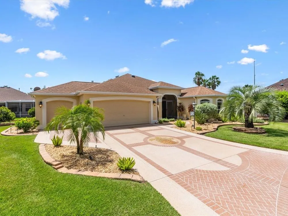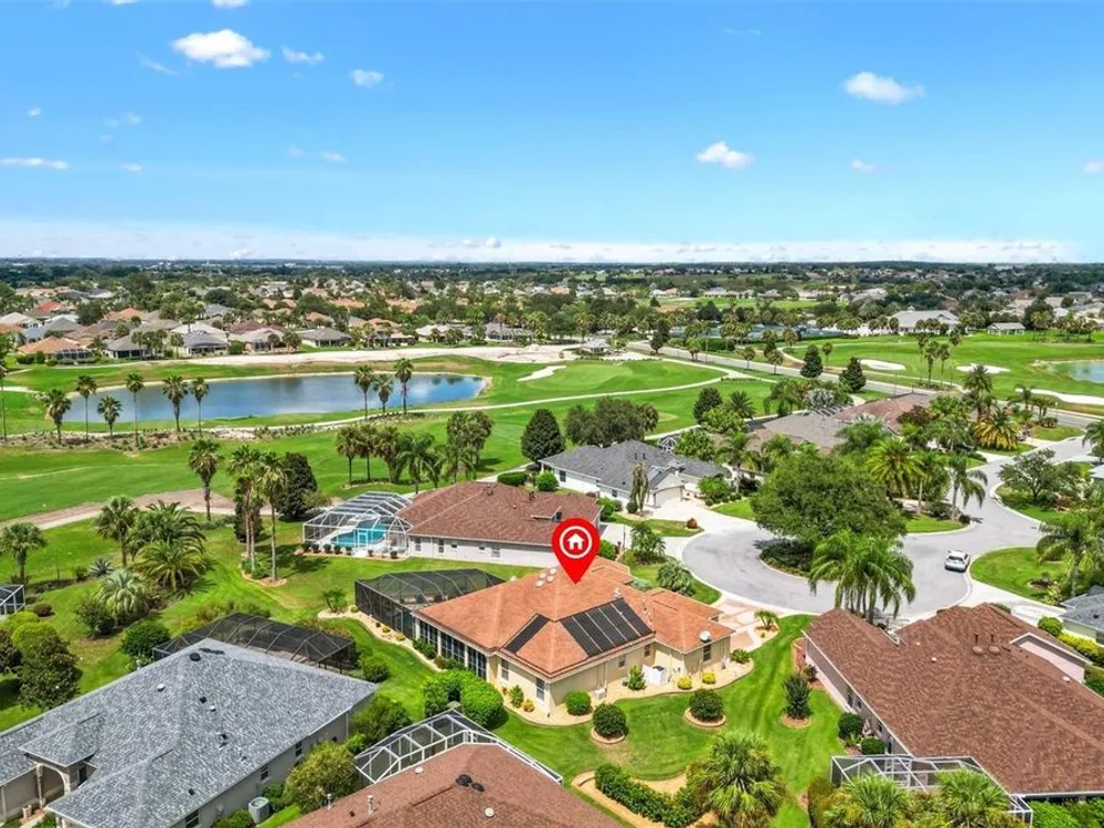Stunning 3/2 Expanded Gardenia Pool home with Golf course View. Situated in an oversized cul-de-sac lot in the Village of Largo. NO BOND! Roof and HVAC Replaced 2015. Exterior Painted 2019. 2 1/2 miles to Lake Sumter Landing. This beautifully appointed home welcomes you with a screened front porch and a charming stained-glass door with side panel and transom windows. Step inside to discover tiled flooring laid on the diagonal with 2 decorative inlaid medallions (entry and kitchen), complemented by five solar tubes that fill the home with natural light. Wood-look laminate flooring adds warmth to the bedrooms. The eat-in kitchen features stainless steel appliances, a 5-burner gas stove, QUARTZITE counters, oak cabinets with glass fronts, pull-out shelves, a breakfast bar with pendant lighting, and a pantry closet in the adjacent laundry room. Crown molding and plantation shutters run throughout the home, enhancing its elegance. The split plan layout offers a master bedroom with lanai access, two customized walk-in closets, and an ensuite bath with split vanities, a shower with built-in bench, and a linen closet. Two guest bedrooms also feature custom closets, with a guest bath offering a shower (no tub) and a pocket door for added privacy. The Back bedroom boasts a tray ceiling with double-crown molding and the front bedroom has 3 large bay windows, and a Queen Murphy Bed with sliding Shelves that open in the middle...a great use of space! Relax or entertain year-round in the enclosed lanai with a mini-split system, privacy shades, and French doors leading to the screened saltwater pool, complete with solar and gas heating and two remote-controlled awnings for shade. Additional features include: 2 car plus golf cart Garage with electronic screen door, insulated door & epoxy-coated floor, Whole-house water system with filtration, softener & charcoal, MAGIC STAIR KIT for easy access to attic storage, a Built-in safe, Vivant security system, ring door bell, exterior awnings, and painted paver driveway. New Pool Pump just installed. Dryer Vent cleaned in April 2025. View of #1 tee of Bacall and #1 tee of Bogart Golf courses. Located just minutes from Bacall Recreation Center and Largo Pool, and between Lake Sumter Landing and Brownwood Town Center, this is the perfect place to call home! Don’t miss the opportunity to make this beautiful designer home yours and start living the Villages dream.