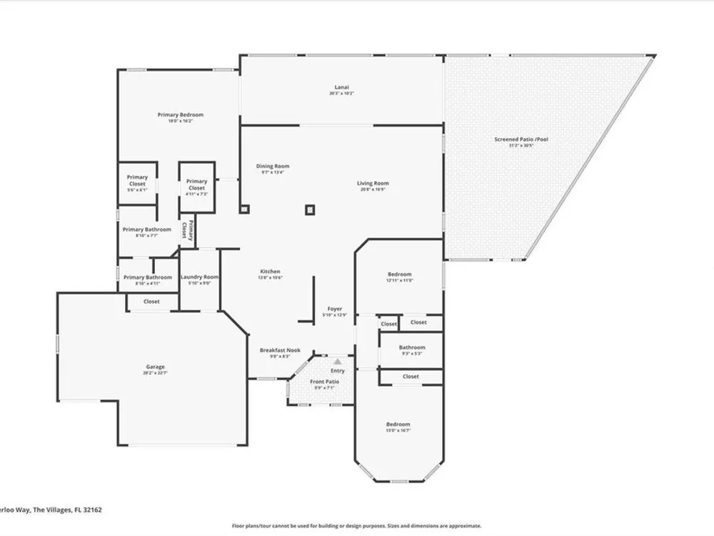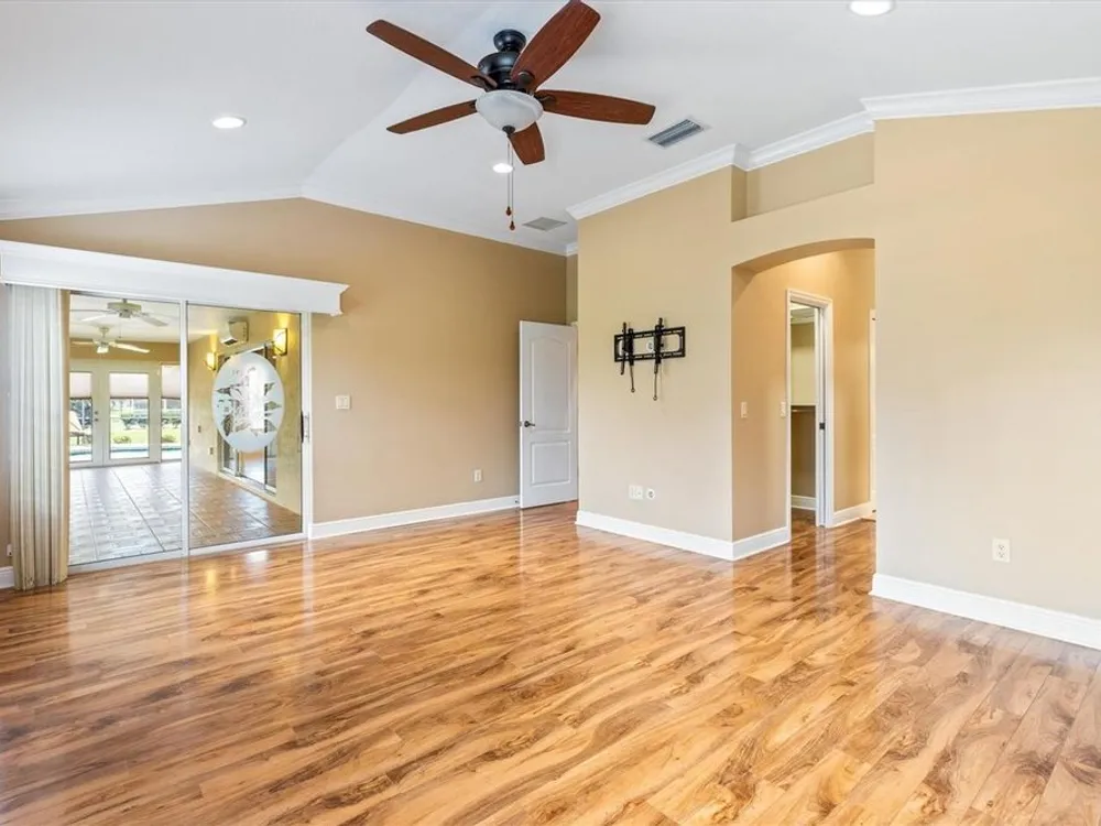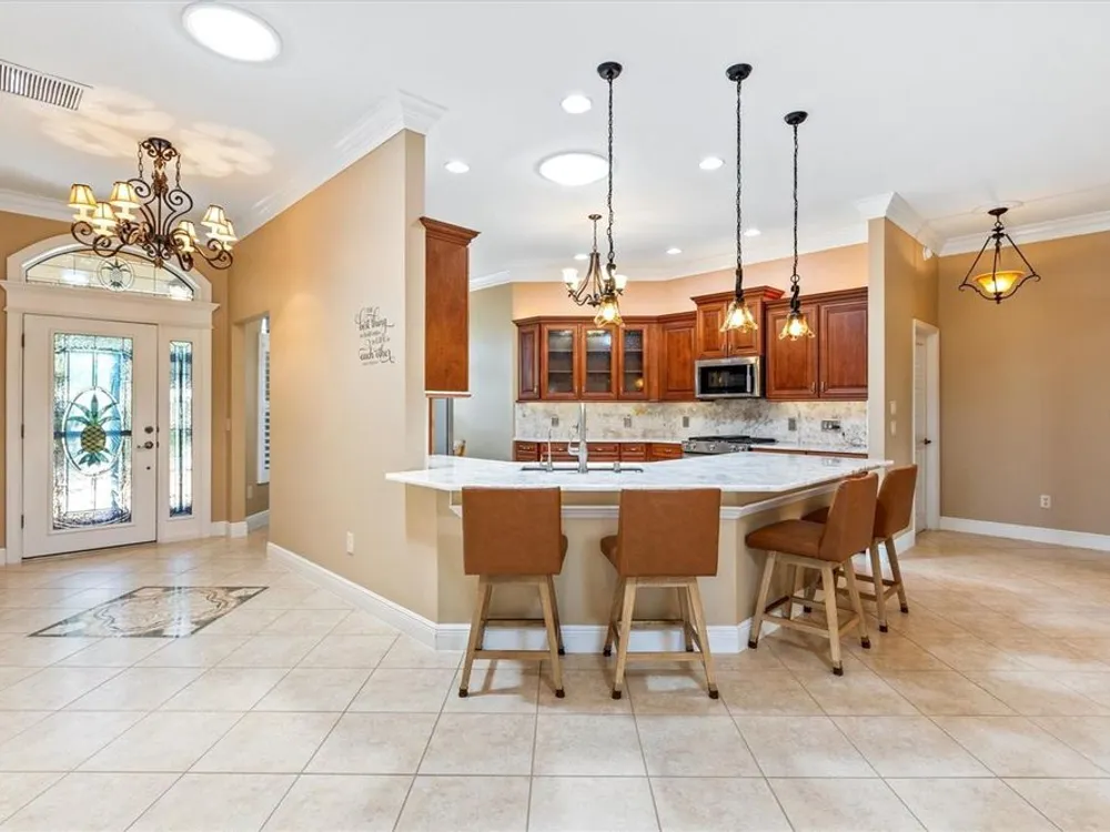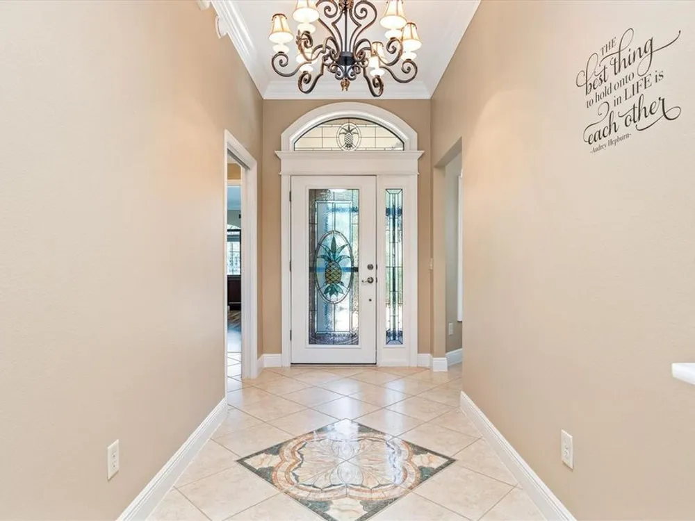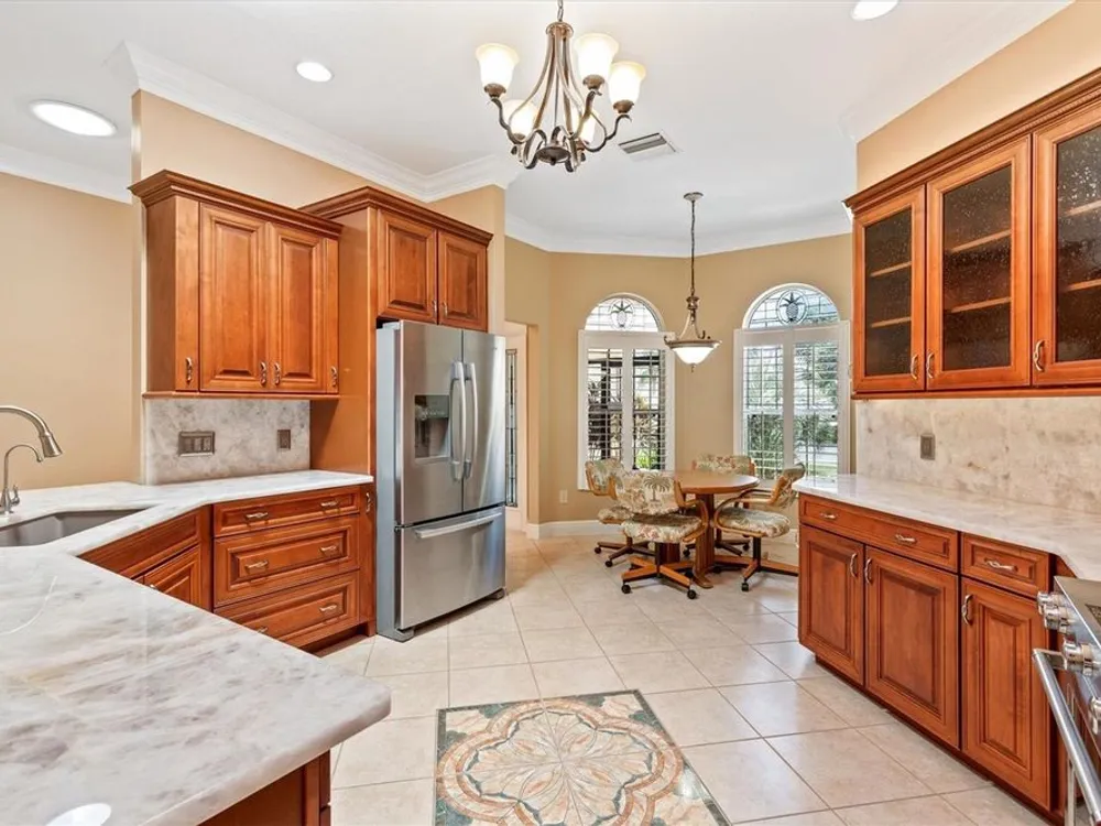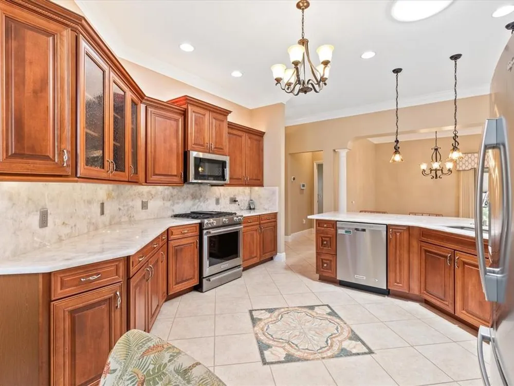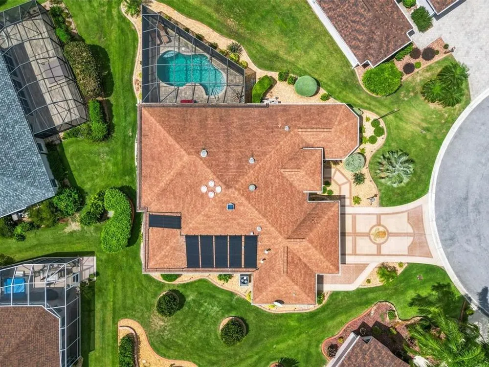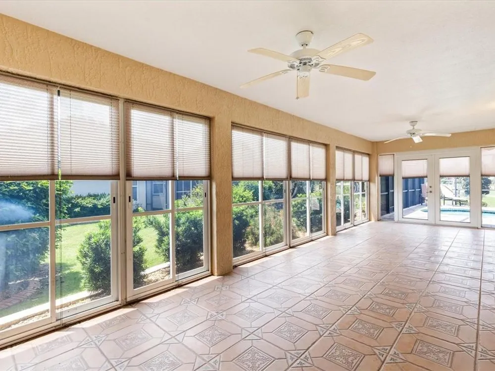 Stunning 3/2 Expanded Gardenia Pool home with Golf course View. Situated in an oversized cul-de-sac lot in the Village of Largo. NO BOND! Roof and HVAC Replaced 2015. Exterior Painted 2019. 2 1/2 miles to Lake Sumter Landing. This beautifully appointed home welcomes you with a screened front porch and a charming stained-glass door with side panel and transom windows. Step inside to discover tiled flooring laid on the diagonal with 2 decorative inlaid medallions (entry and kitchen), complemented by five solar tubes that fill the home with natural light. Wood-look laminate flooring adds warmth to the bedrooms. The eat-in kitchen features stainless steel appliances, a 5-burner gas stove, QUARTZITE counters, oak cabinets with glass fronts, pull-out shelves, a breakfast bar with pendant lighting, and a pantry closet in the adjacent laundry room. Crown molding and plantation shutters run throughout the home, enhancing its elegance. The split plan layout offers a master bedroom with lanai access, two customized walk-in closets, and an ensuite bath with split vanities, a shower with built-in bench, and a linen closet. Two guest bedrooms also feature custom closets, with a guest bath offering a shower (no tub) and a pocket door for added privacy. The Back bedroom boasts a tray ceiling with double-crown molding and the front bedroom has 3 large bay windows, and a Queen Murphy Bed with sliding Shelves that open in the middle...a great use of space! Relax or entertain year-round in the enclosed lanai with a mini-split system, privacy shades, and French doors leading to the screened saltwater pool, complete with solar and gas heating and two remote-controlled awnings for shade. Additional features include: 2 car plus golf cart Garage with electronic screen door, insulated door & epoxy-coated floor, Whole-house water system with filtration, softener & charcoal, MAGIC STAIR KIT for easy access to attic storage, a Built-in safe, Vivant security system, ring door bell, exterior awnings, and painted paver driveway. New Pool Pump just installed. Dryer Vent cleaned in April 2025. View of #1 tee of Bacall and #1 tee of Bogart Golf courses. Located just minutes from Bacall Recreation Center and Largo Pool, and between Lake Sumter Landing and Brownwood Town Center, this is the perfect place to call home! Don’t miss the opportunity to make this beautiful designer home yours and start living the Villages dream.