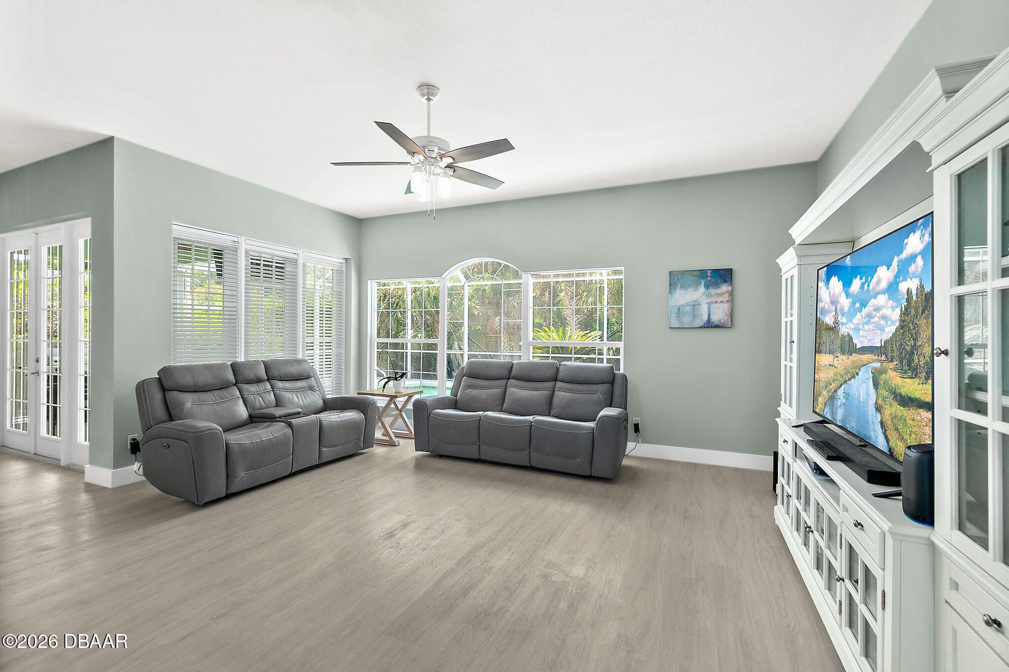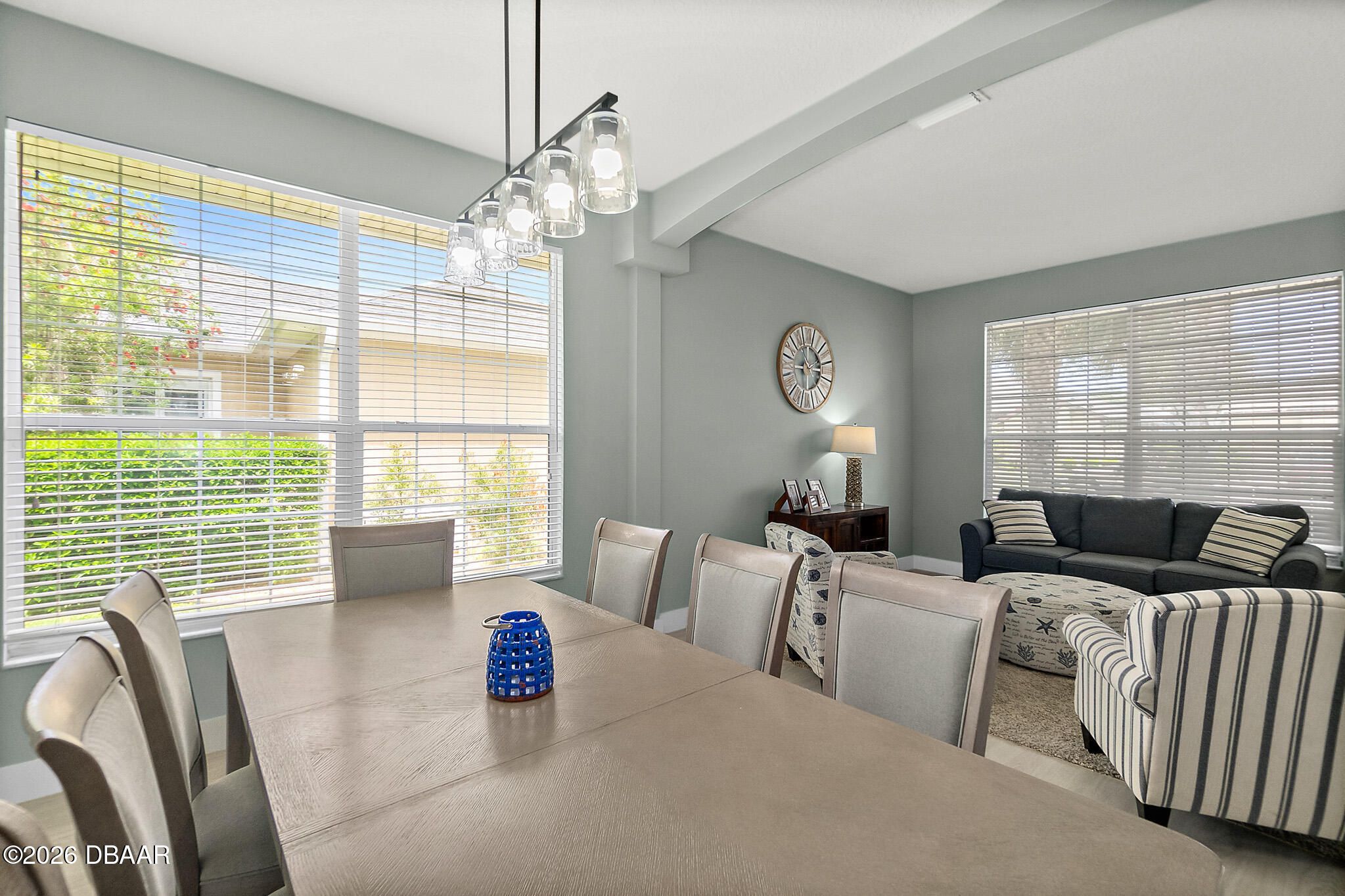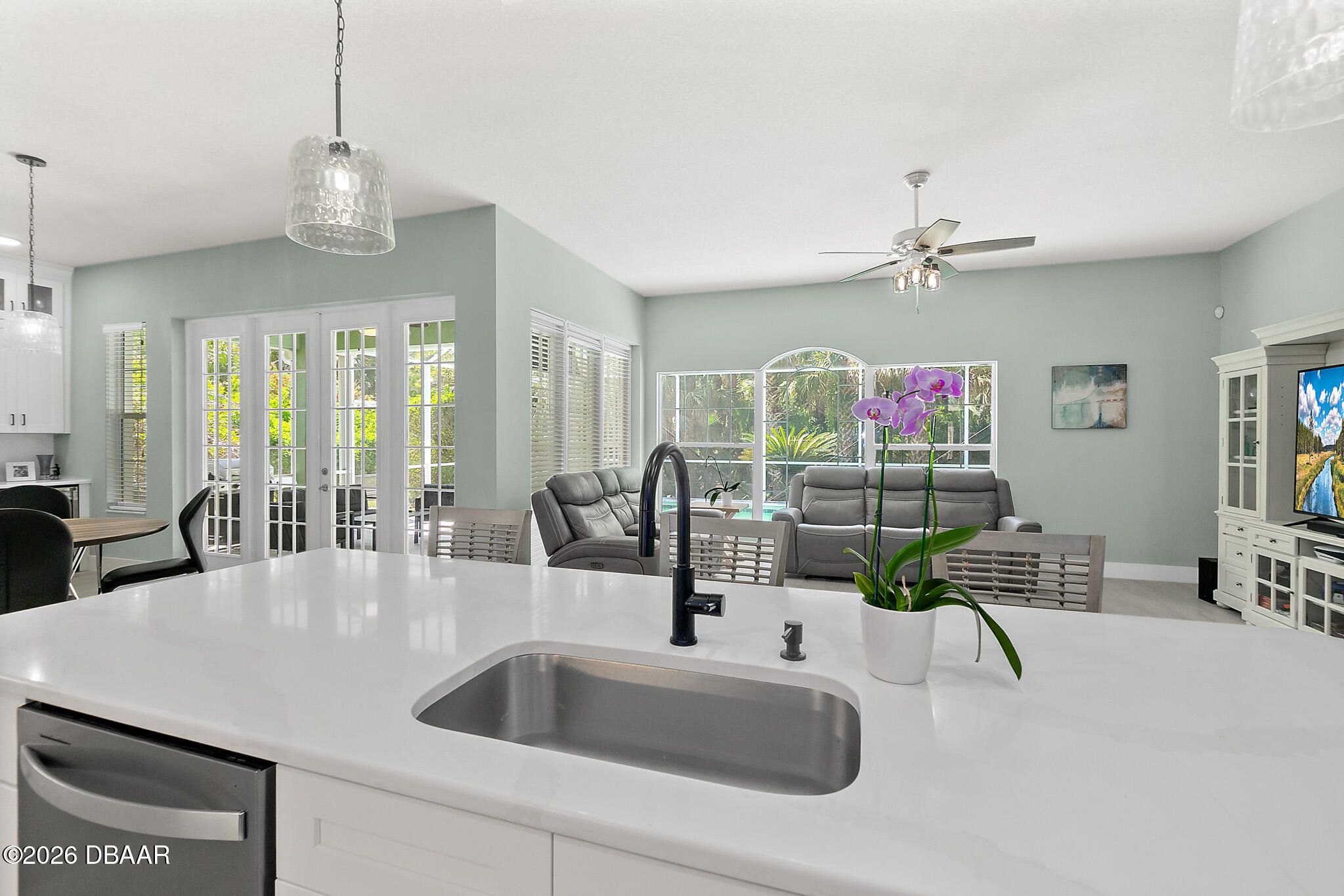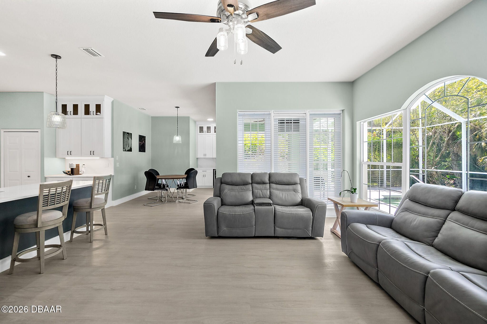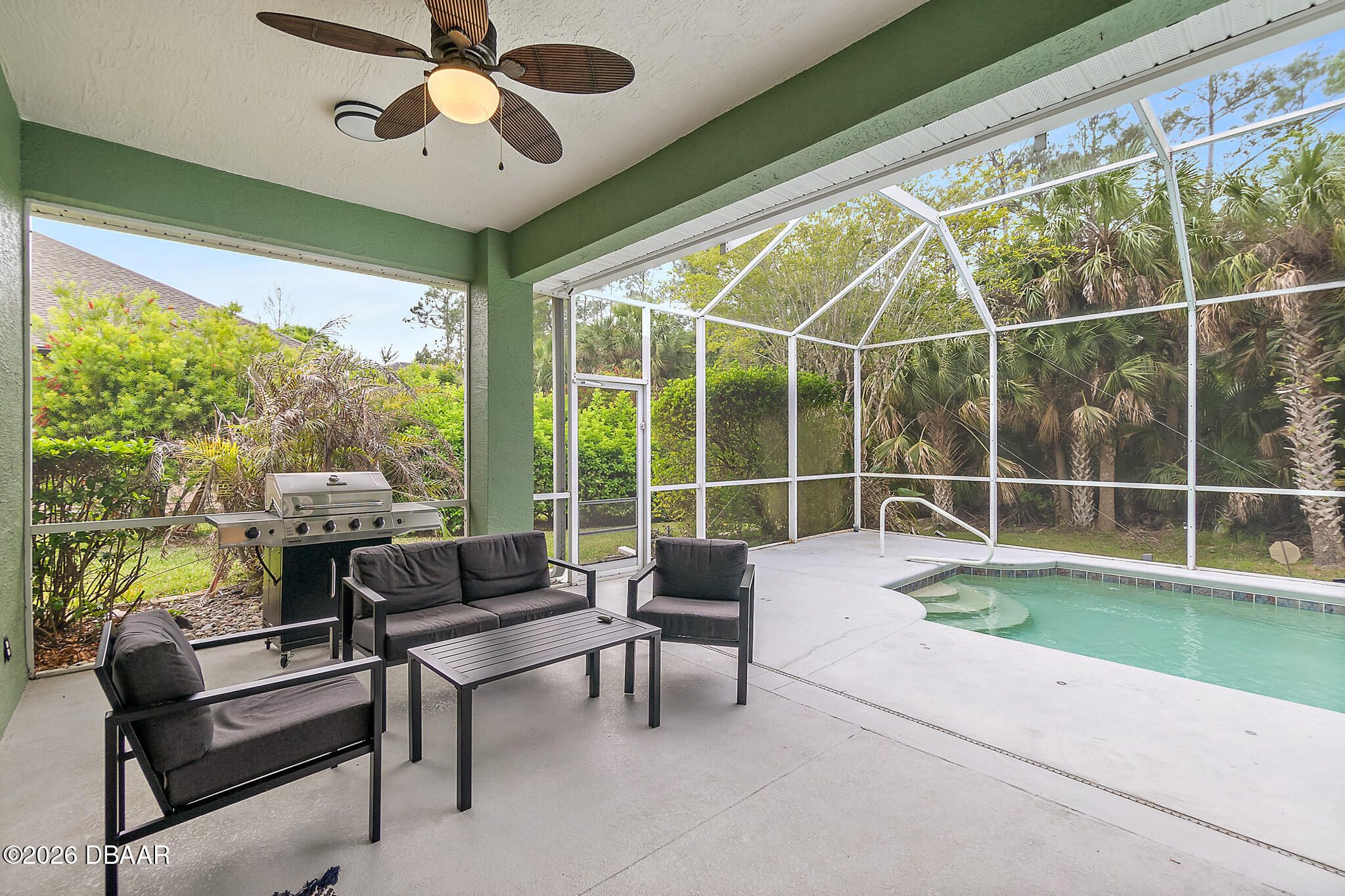 Welcome to this beautifully maintained 4-bedroom, 2-bathroom home offering 2,575 square feet of living space in the highly sought-after Plantation Bay community. Designed with a thoughtful split-bedroom layout, this home provides ultimate privacy and comfort. Step inside to discover an open floor plan, where the spacious kitchen seamlessly flows into the inviting family room and informal dining area. Large windows and french doors bring in an abundance of natural light and offer picturesque views of the sparkling pool and serene backyard. The tranquil outdoor space is perfect for relaxation or entertaining, with the pool area backing up to a peaceful nature preserve, ensuring privacy and a calm, scenic backdrop. Whether you're hosting a gathering or enjoying a quiet evening, this home provides the ideal setting for modern living. New water heater, LVP flooring, kitchen and bathroom cabinets, trim, lighting, quartz countertops, sinks and faucets 2025. New roof, gutters and sprinkler sprinkler system update 2024. Newer paint, kitchen appliances, screen enclosures and pool heater. HVAC new in 2023. Plantation Bay memberships available which provide access to wellness center, pickleball and tennis as well as golf and clubhouse. 3 car garage with built in storage/workshop, 240 outlet.